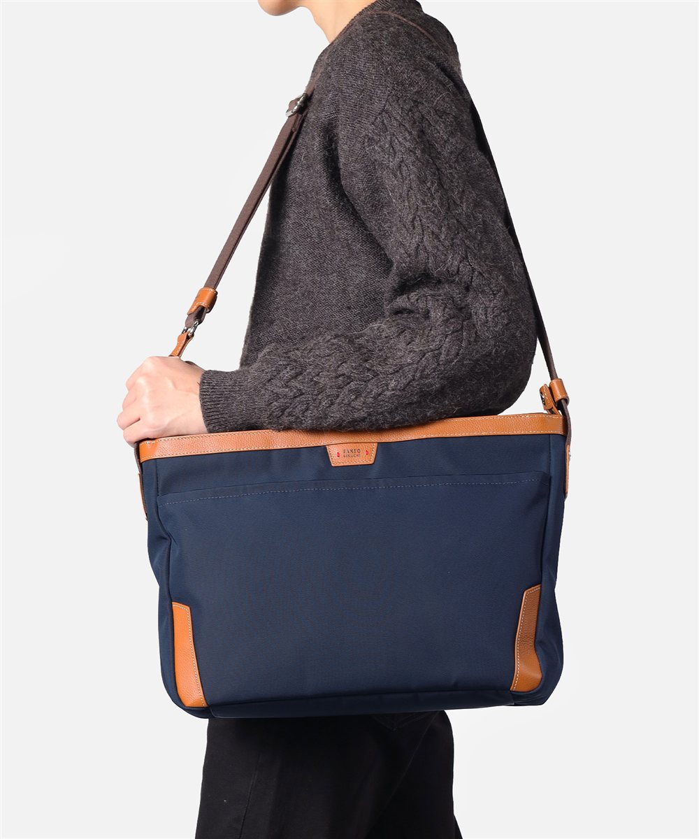 コメント:軽量で丈夫なナイロン素材と防水レザーを使用したA4サイズのショルダーバッグ。天候を気にせずデイリーカジュアルに活躍する定番アイテムです。