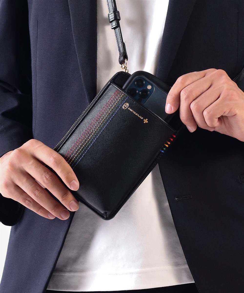 コメント:ブランドカラーのステッチがアクセントのスマホショルダーバッグは、薄マチでコンパクトながら財布機能も備え、カジュアルからきれいめまで幅広いスタイルにスマートに馴染みます。