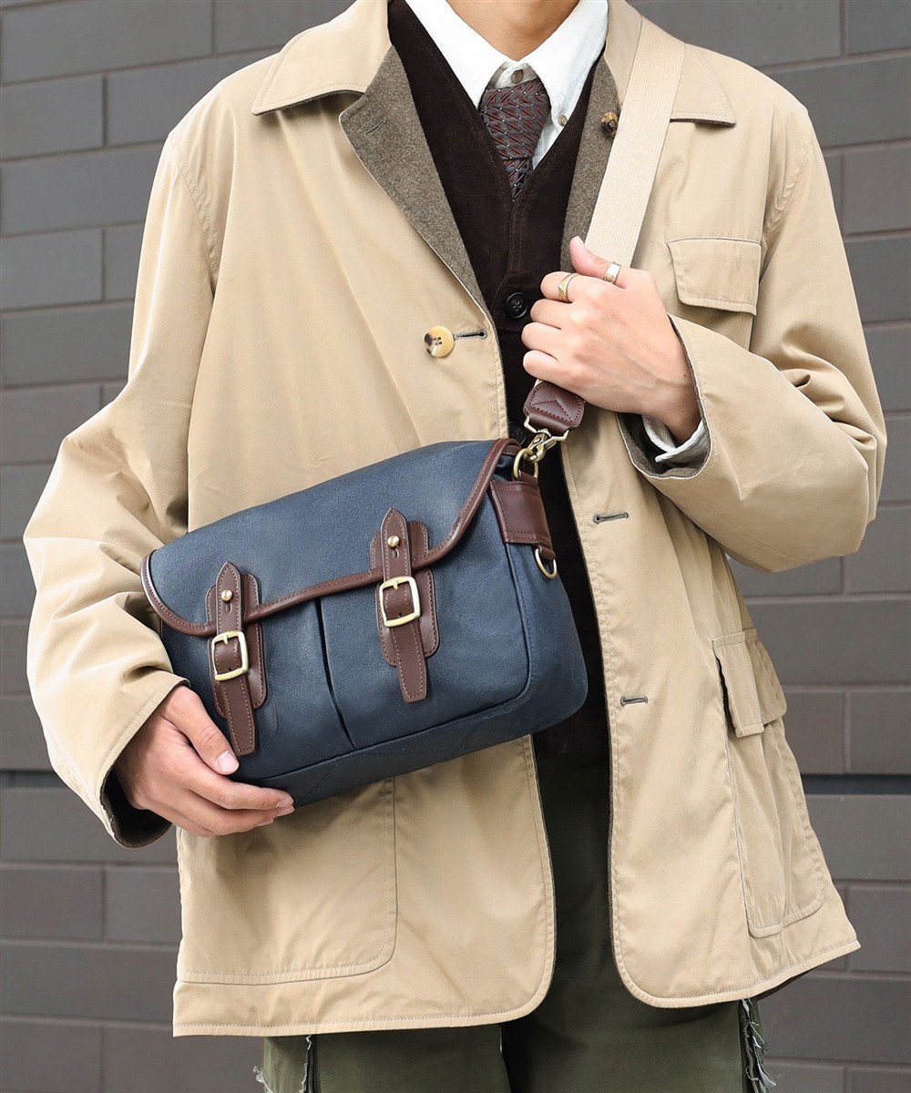 コメント:オイルとパラフィン加工で高い撥水性と耐久性を備えたショルダーバッグ。レザーライクな風合いでエイジングも楽しめ、収納力も抜群。サイクリングやフィッシングなど、旅のお供にぴったりの一品です。