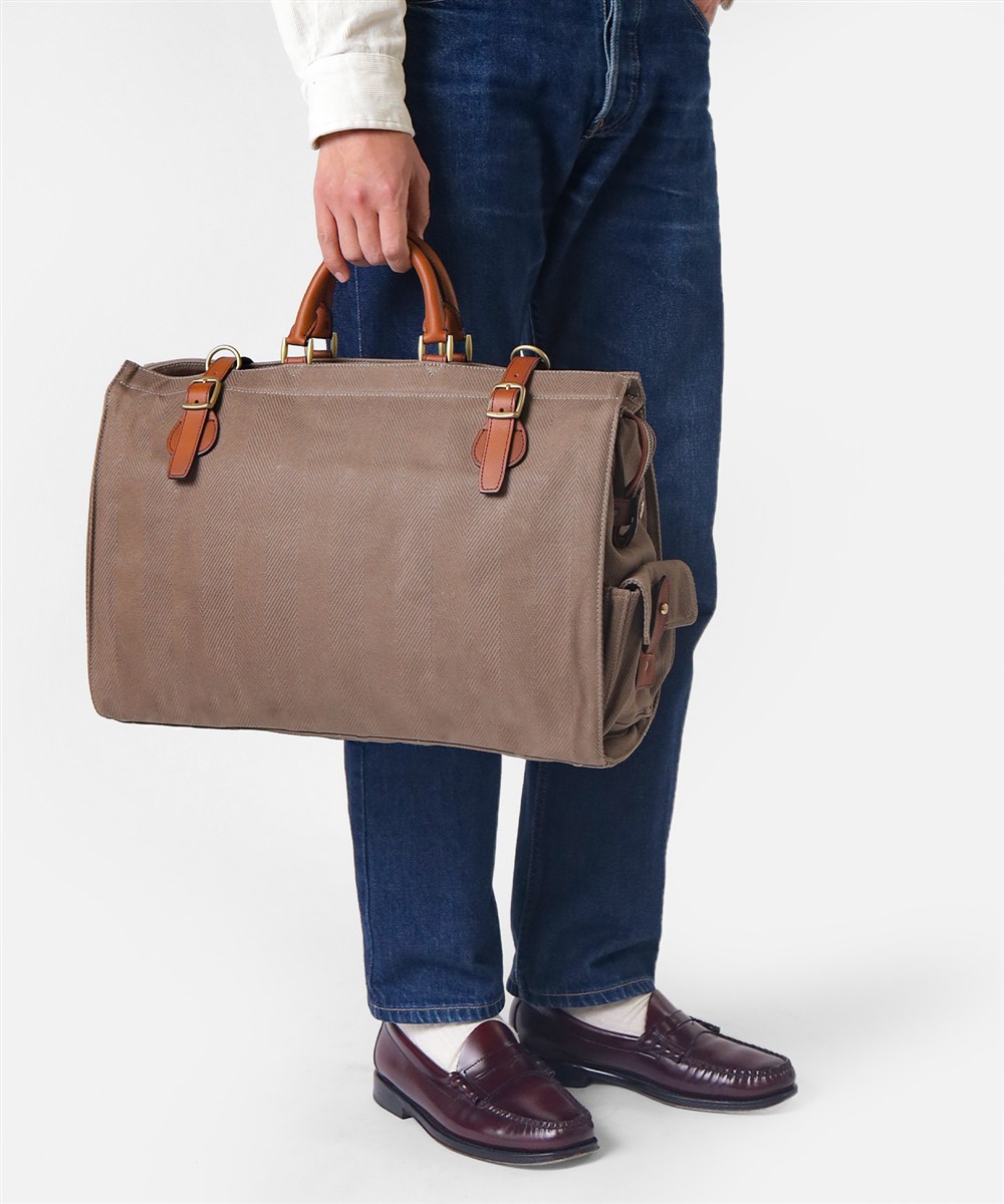 コメント:丈夫なヘリンボーン生地にレザーを組み合わせた45cmサイズのボストンバッグ。スーツスタイルにもカジュアルなデニムにも馴染み、出張や1泊程度の旅行に品のあるアクセントを添えてくれます。