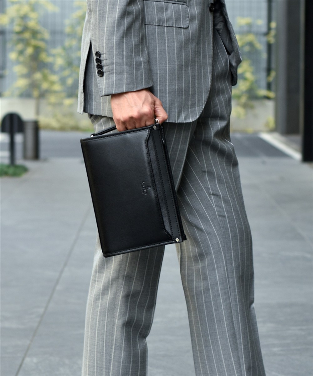 コメント:上品な艶感が魅力の水シボエンボス牛革の、スマートフォンと長財布が入るクラッチバッグ。普段のビジネスシーンから、結婚式などのフォーマルな場まで、これ一つで大人の余裕とスマートな手元を演出できます。