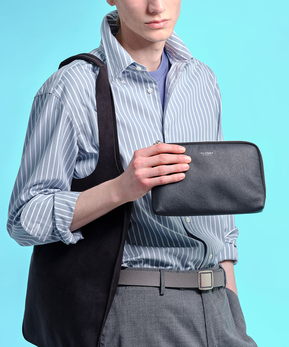 コメント:植物由来の再生資源を使用したウルトラスエードのトートバッグとレザーポーチのセット。折りたたんでポーチに収納できるパッカブル仕様で、A4対応サイズのバッグは日常の荷物もスマートに持ち運べます。