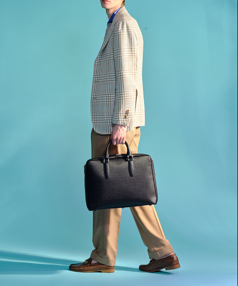 コメント:防水加工レザーを使用したA4サイズビジネスバッグ。上品なエンボス加工で高級感を演出し、パイピングで自立可能。内外ポケットやキャリーケース対応背面ポケットで出張にも便利です。