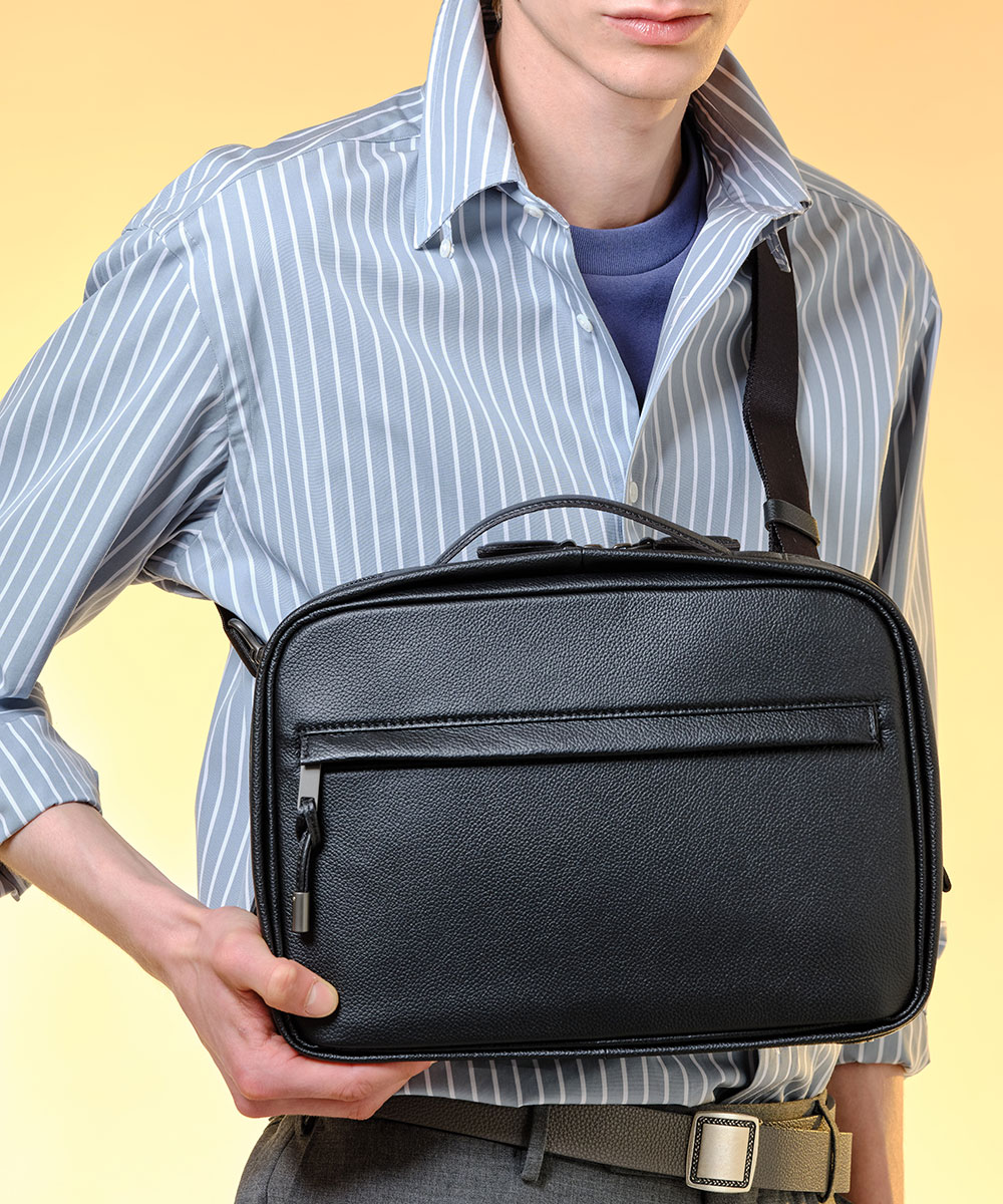コメント:上質なスムースレザーを使用したショルダーバッグ。マット仕上げの柔らかな手触りで傷に強く、350mlペットボトルも収納可能なコンパクトサイズ。内ポケットやペン差し付きで、日常のお出かけに便利な上品アイテムです。