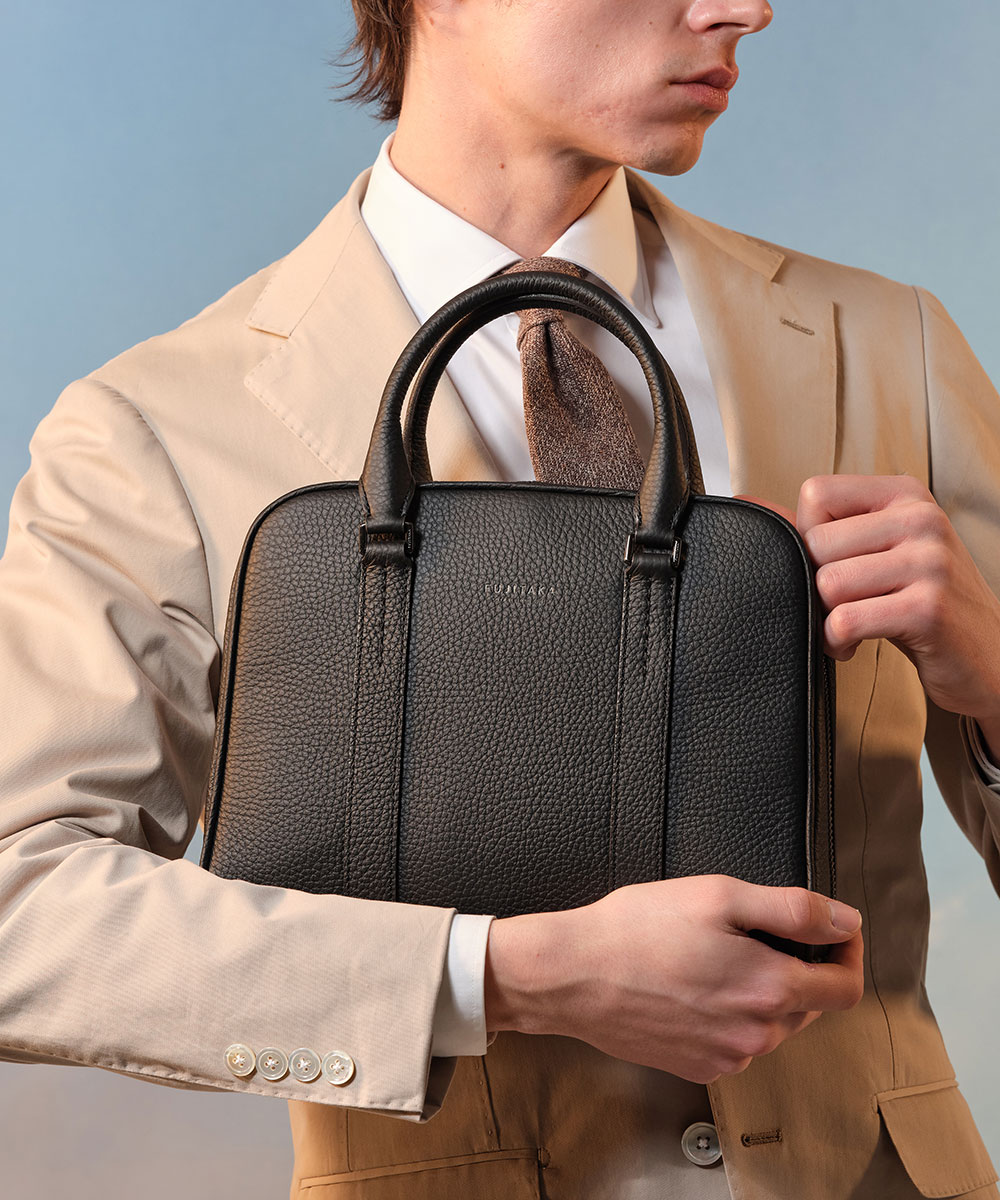 コメント:上質なレザービジネスバッグが、洗練された大人の装いを演出。コンパクトながら存在感があり、ビジネスシーンでもスタイリッシュに決まります。