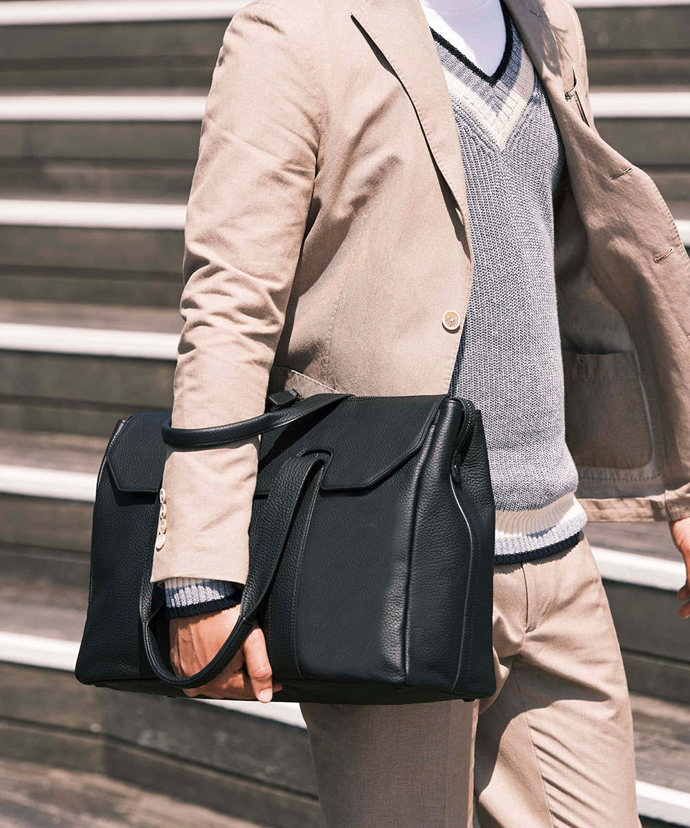 コメント:LWGゴールドランク認定のイタリア高級レザーを贅沢に使用した、B4サイズのレザートートバッグ。ベージュのセットアップにクロのバッグを合わせ、上品さとモード感が漂うスタイルです。