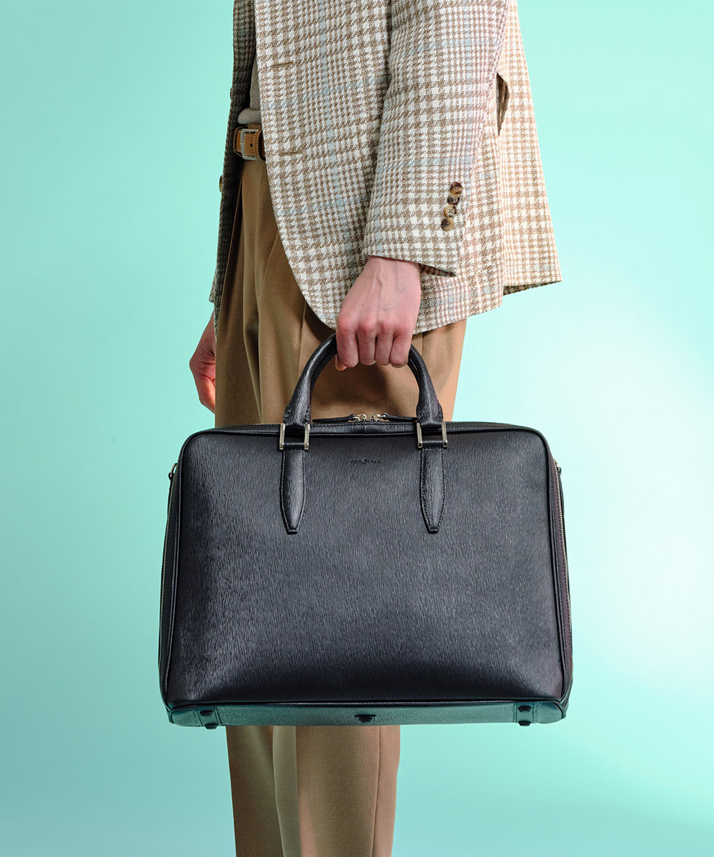 コメント:スコッチガード加工(3M)を施した防水レザーを使用した、A4サイズのレザービジネスバッグ。レザーの上質な質感が引き立つ、スーツにぴったりなスマートで品格あるビジネススタイルです。