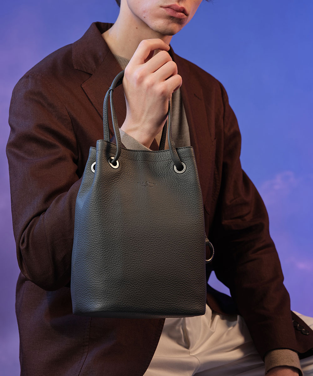 コメント:クロームフリーでソフトに作る事が難しい貴重な本シュリンクの革を贅沢に使用した、巾着型のレザーポーチ。ベージュとシロのコーデにクロのバッグを合わせた、上品な印象の大人カジュアルスタイルです。