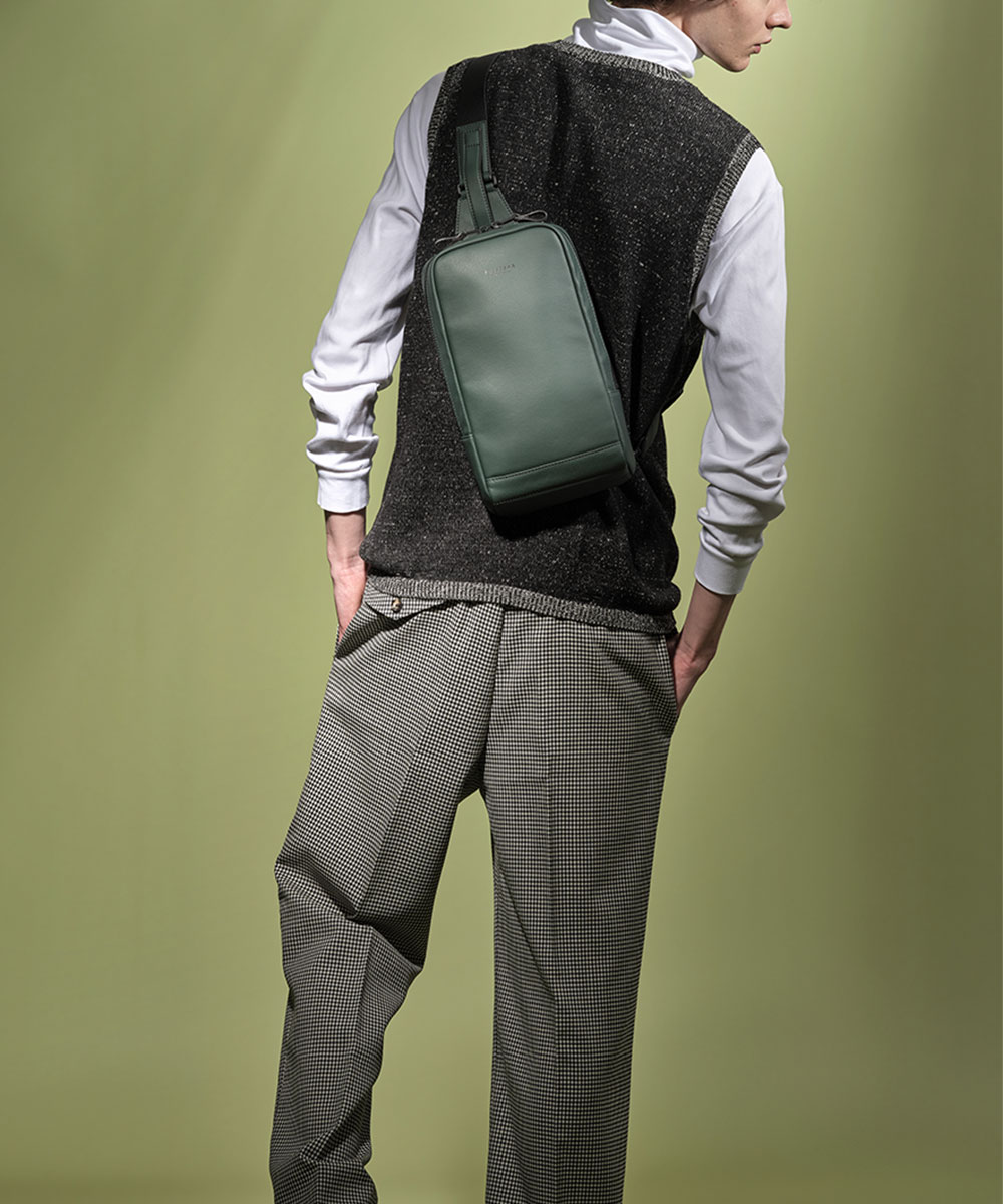 コメント:上品な肌目が美しいLWG ゴールドランク認定のイタリア高級スムースレザーを贅沢に使用したワンショルダーバッグ。シックなコーデにグリーンのリュックを合わせた、落ち着いた大人スタイルです。