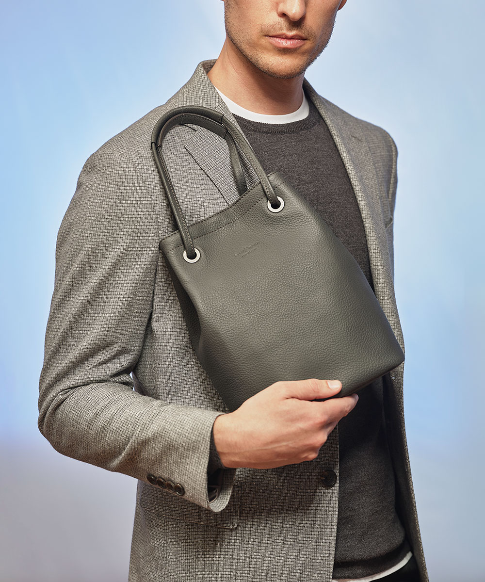 コメント:グレーのバッグを合わせた、上品かつ落ち着いたワントーンコーデ。クロームフリーでソフトに作る事が難しい貴重な本シュリンクの革を贅沢に使用した、巾着型のレザーポーチです。
