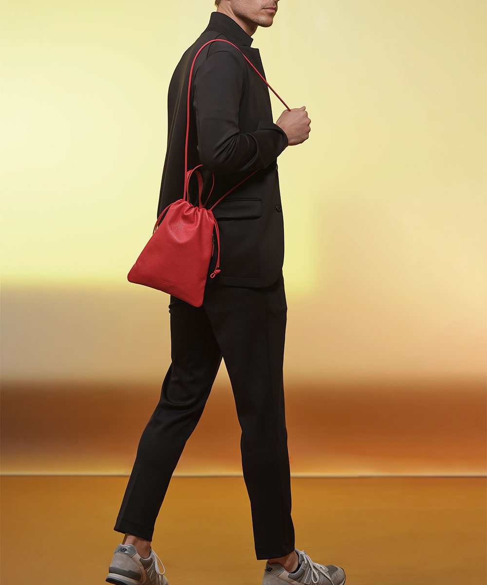 コメント:ハンドルとショルダーかけの2WAY仕様の巾着バッグ。長財布や500mlのペットボトルが入るサイズです。アカのバッグがコーディネートのアクセントになっています。
