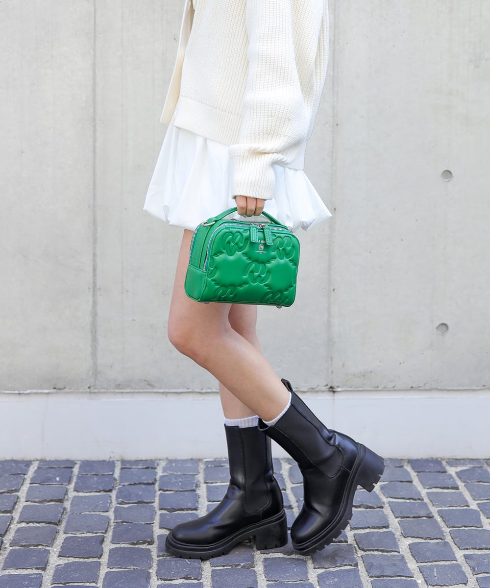 コメント:シンプルなコーデに差し色としてグリーンのバッグを合わせました。シーンに合わせてショルダーバッグとしてもハンドバッグとしても2WAYで使えます。