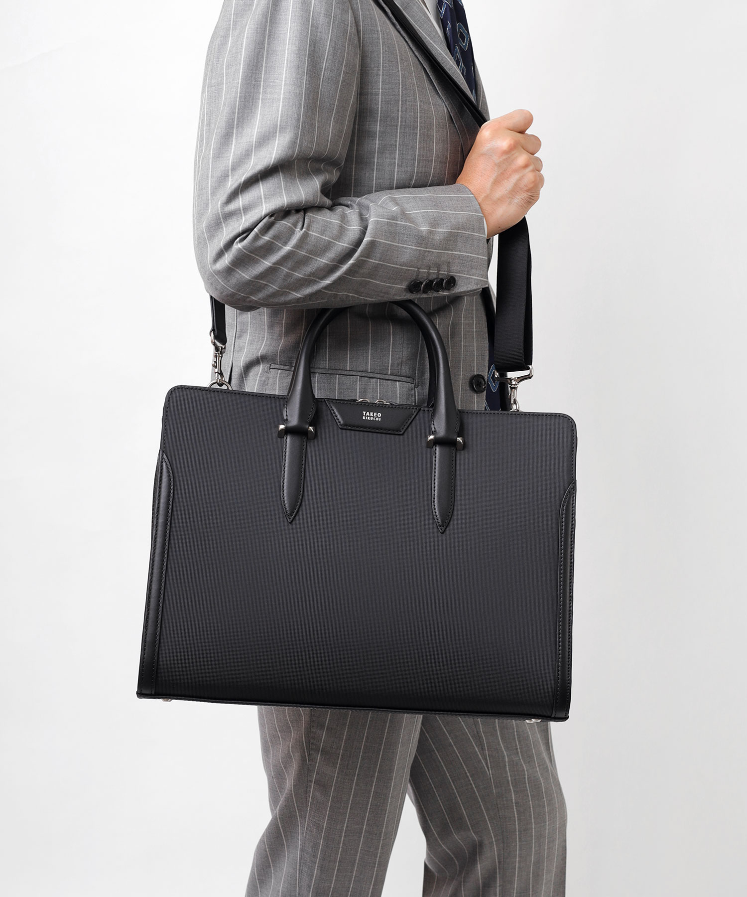 コメント:スーツスタイルにぴったりはまる、A4サイズのビジネスバッグ。スクエアでシャープなフォルムに、上質な質感のナイロン絞PVCを組み合わせたスタイリッシュなデザインが魅力です。