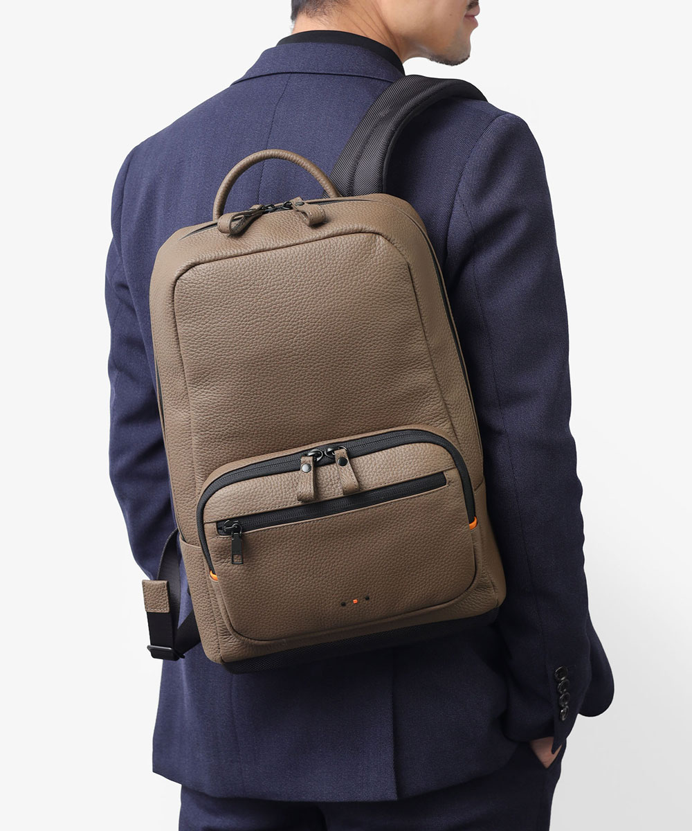 コメント:ユーキャンのビジネス資格講座に特化した「ユーキャン・プロ」との共同開発によるA4サイズのビジネスリュック。本体素材の牛革シュリンクエンボスレザーは、ゴムのようなしっとりとした質感で、使うほどに深まる色艶のエイジングを楽しむことができます。