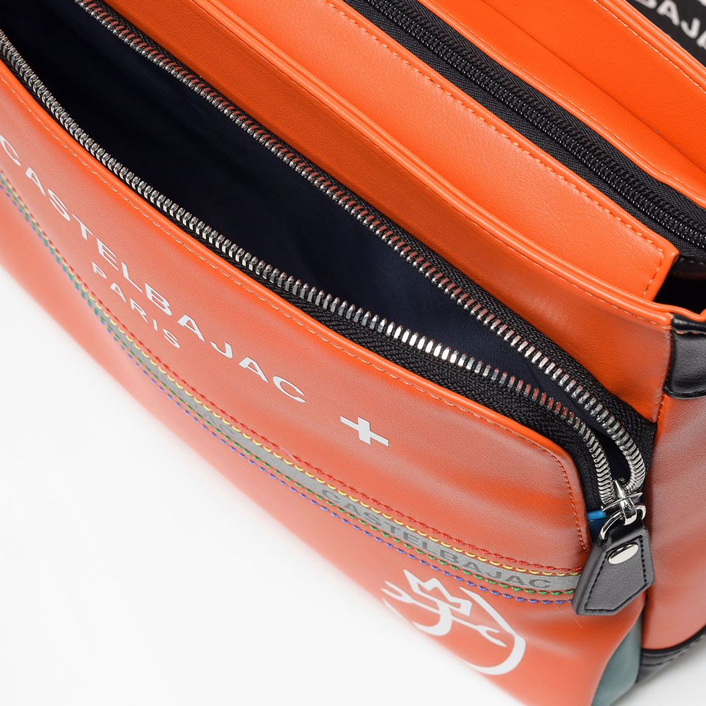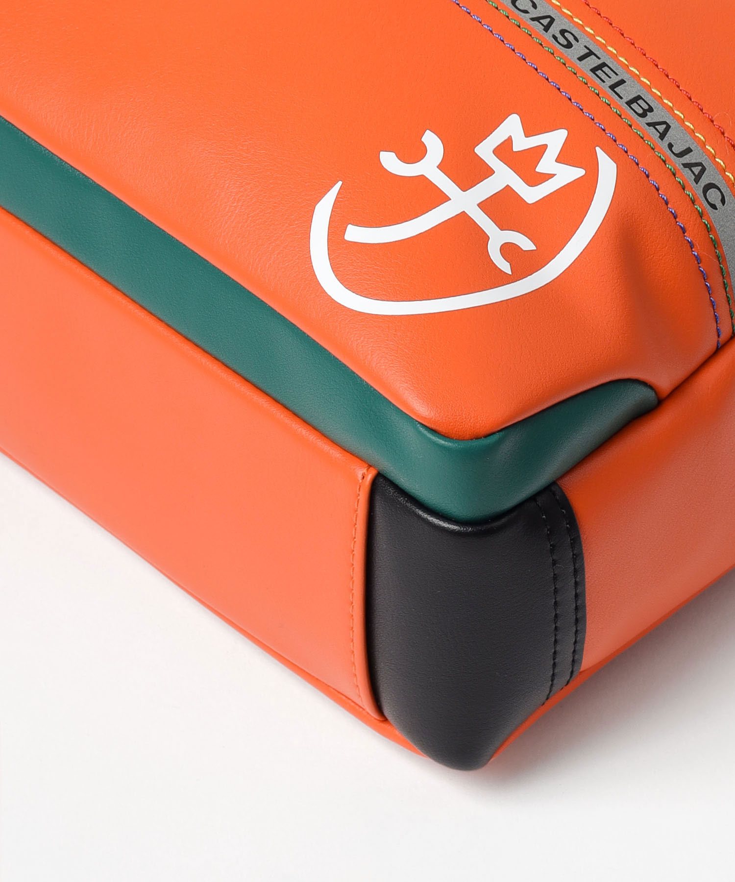 フロント中央には、視認性の高いリフレクター素材に連続ロゴプリントを施し、夜間の安心感とデザイン性を両立。さらに上下にはブランドイメージカラーを取り入れた4色ステッチをあしらい、カステルバジャックらしさを演出しています。