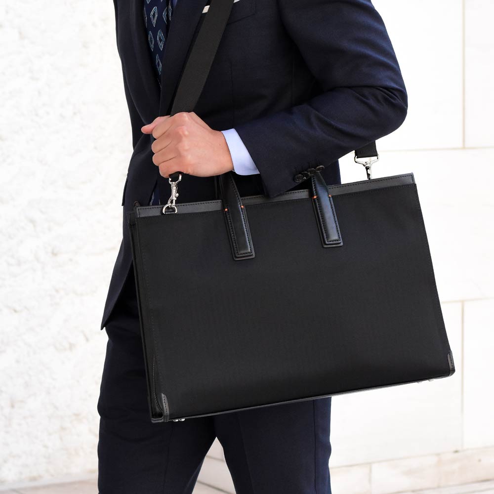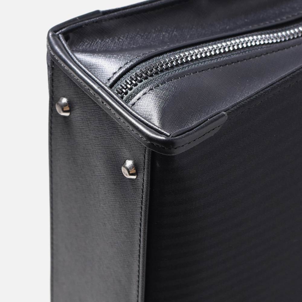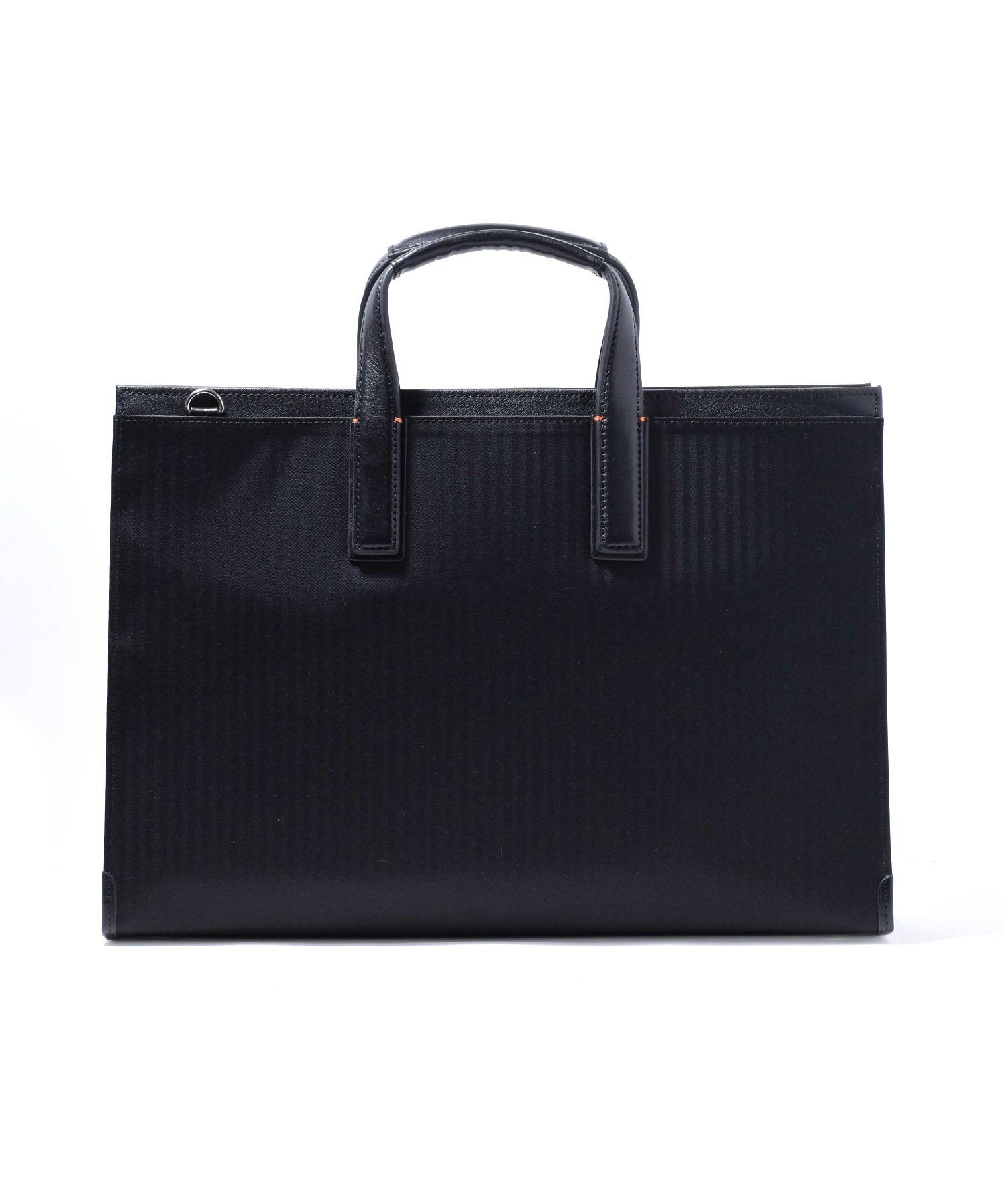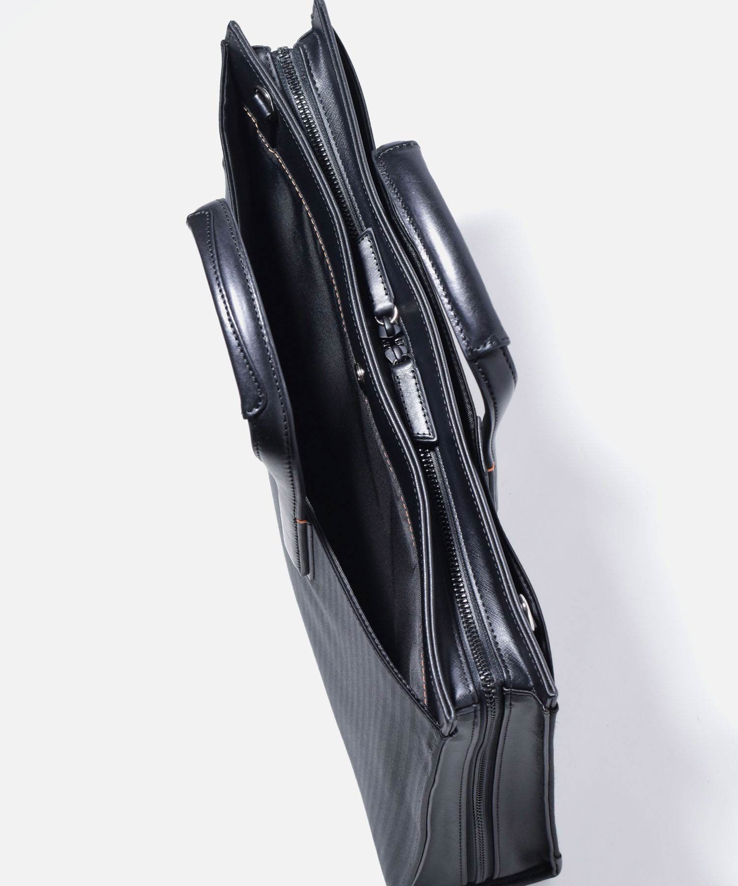 本体素材には、ナイロンコットンを使用しています。ヘリンボーン織りの光沢感ある素材が魅力で、ビジネスシーンはもちろん、リクルートでも活躍できるよう目立ちすぎないストライプ柄に仕上げています。マチ部分にはサフィアーノ調ポリ塩化ビニルを使用しているので、スッキリとしたイメージを与えます。