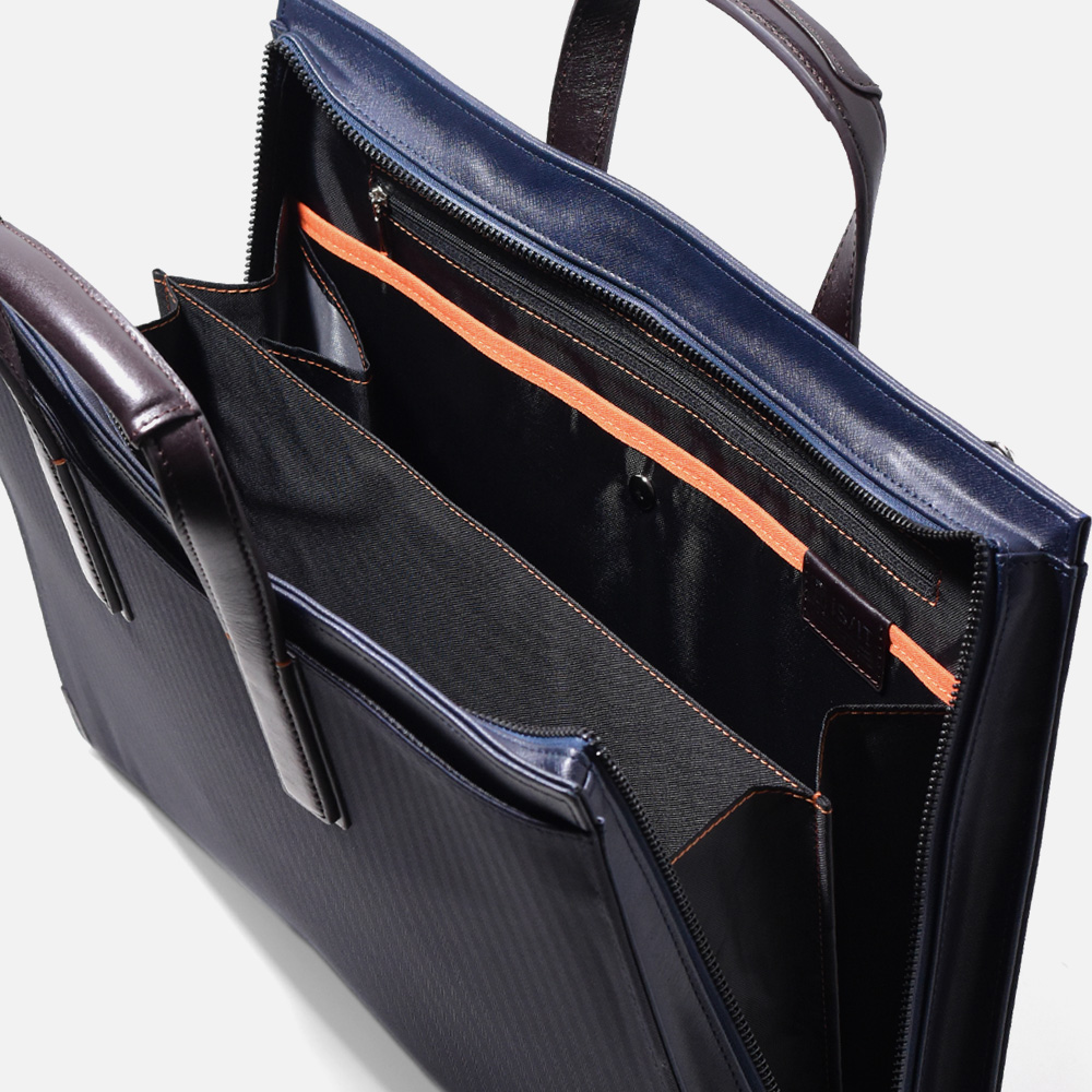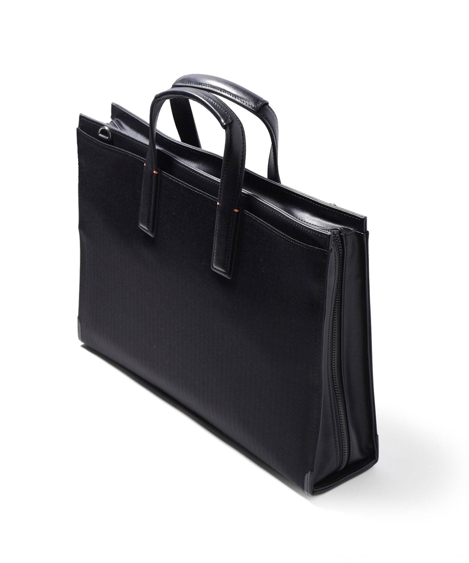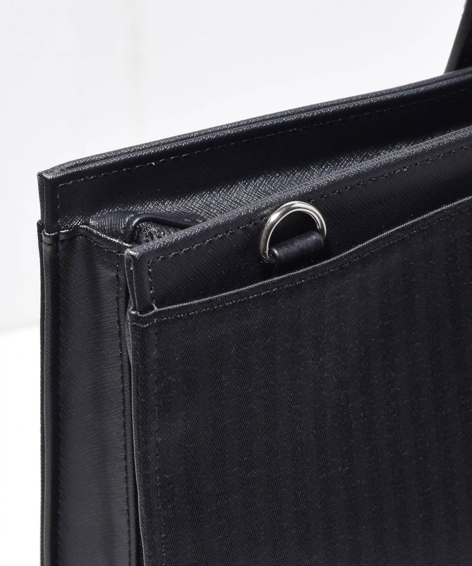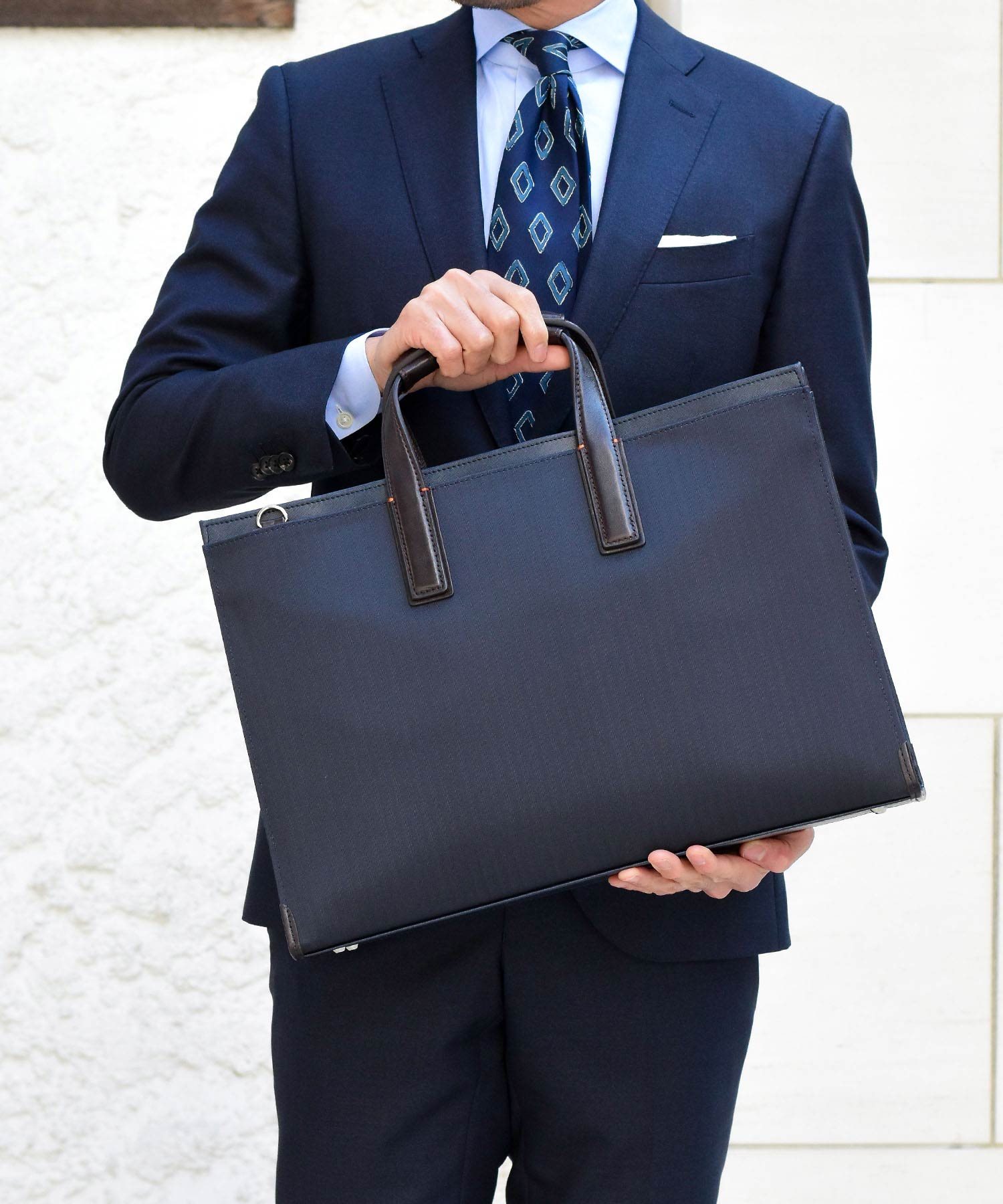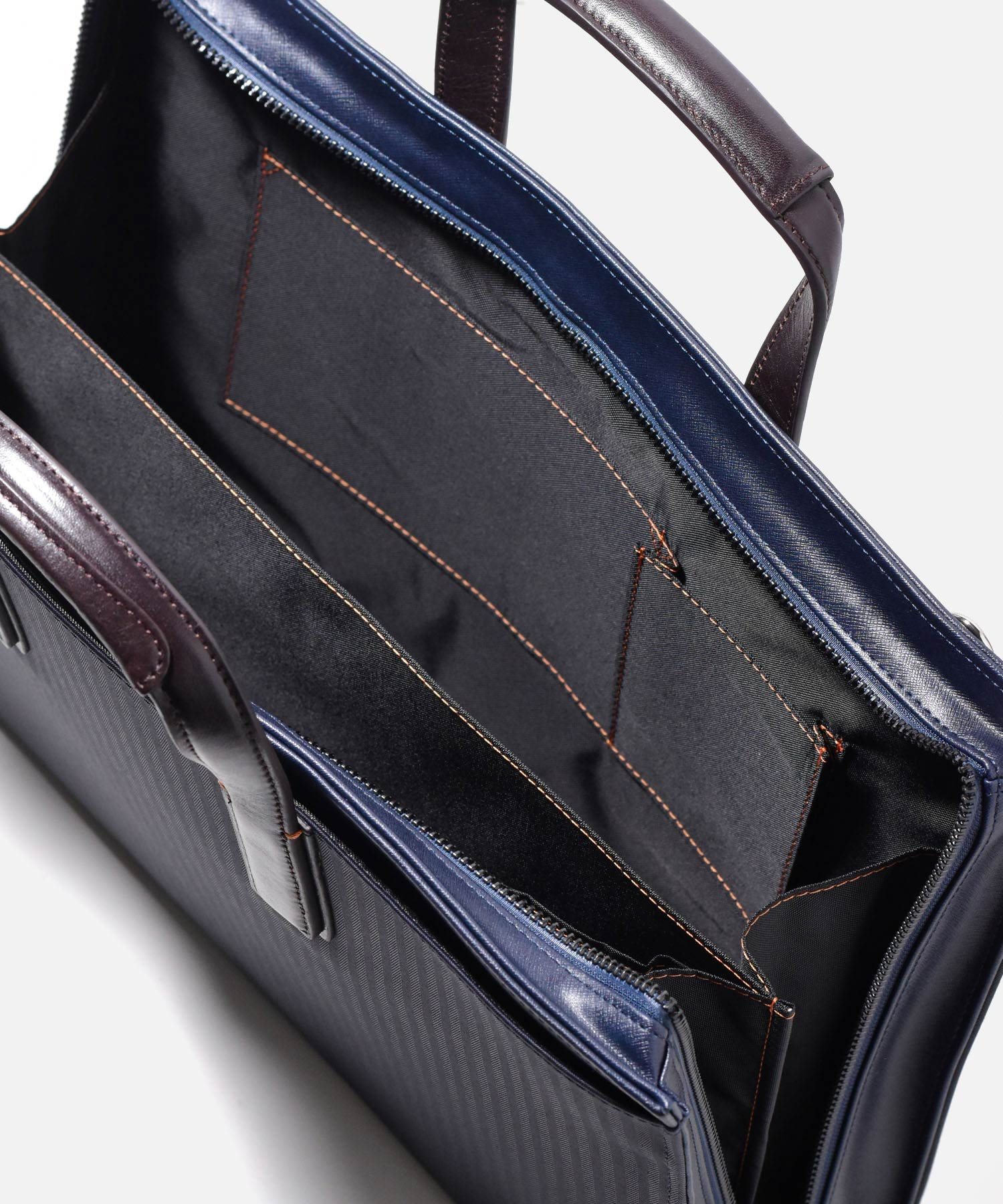 本体素材には、ナイロンコットンを使用しています。ヘリンボーン織りの光沢感ある素材が魅力で、ビジネスシーンはもちろん、リクルートでも活躍できるよう目立ちすぎないストライプ柄に仕上げています。マチ部分にはサフィアーノ調ポリ塩化ビニルを使用しているので、スッキリとしたイメージを与えます。