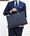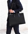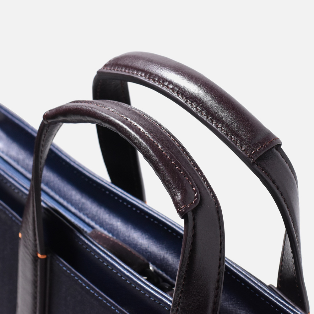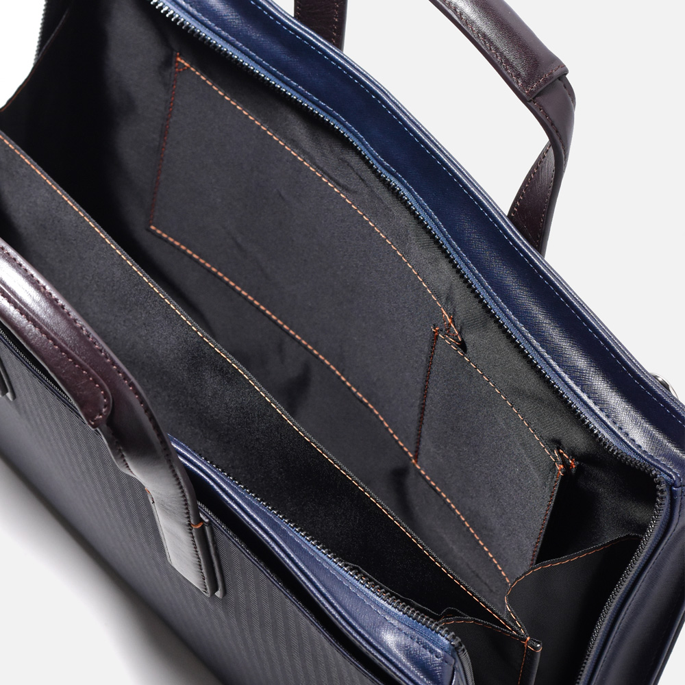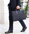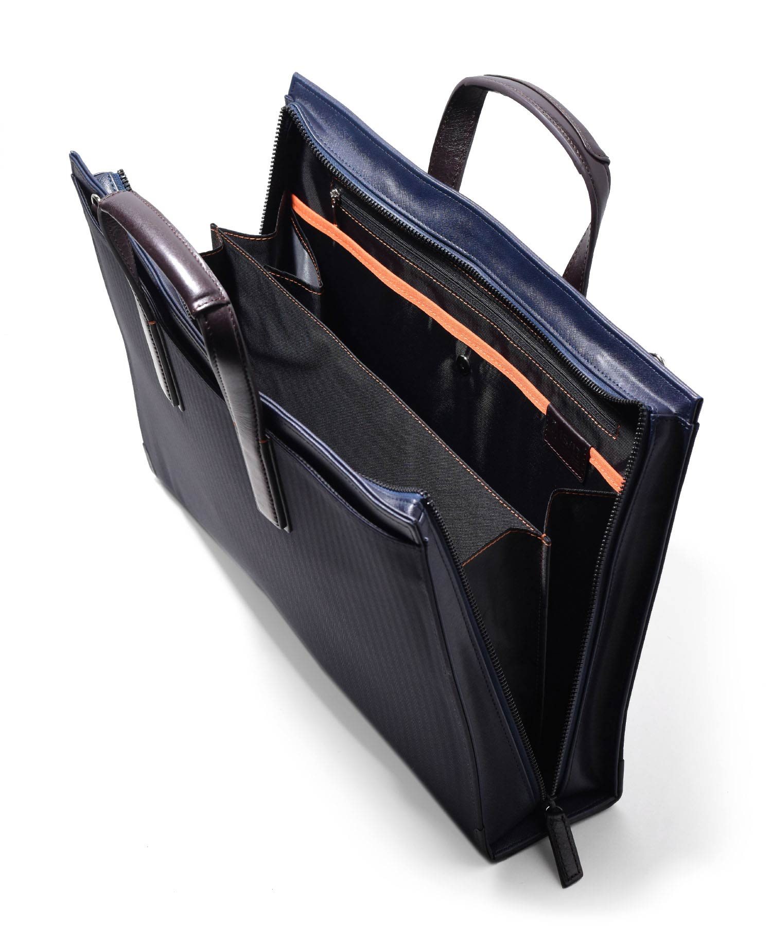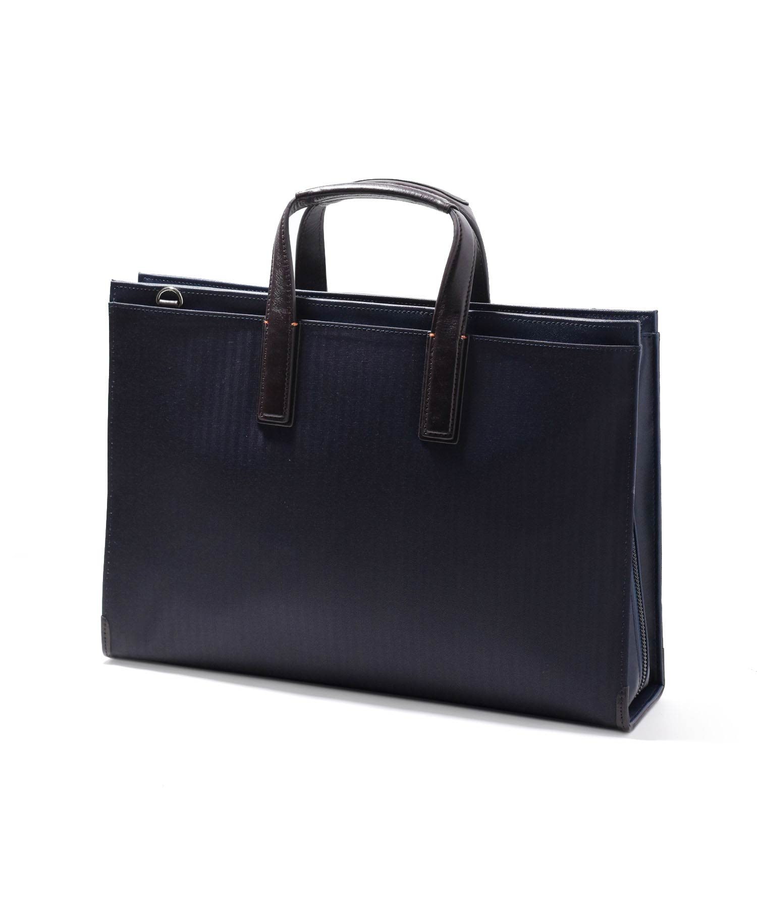 本体素材には、ナイロンコットンを使用しています。ヘリンボーン織りの光沢感ある素材が魅力で、ビジネスシーンはもちろん、リクルートでも活躍できるよう目立ちすぎないストライプ柄に仕上げています。マチ部分にはサフィアーノ調ポリ塩化ビニルを使用しているので、スッキリとしたイメージを与えます。