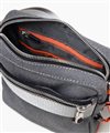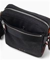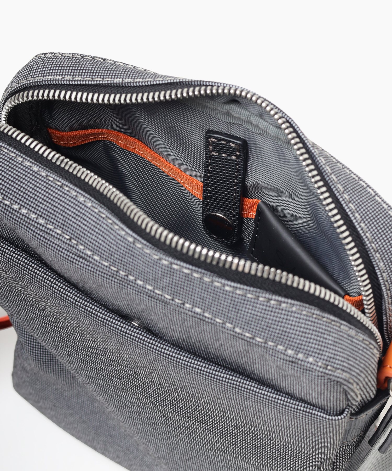 付属革にはシャープな格子状のエンボスを施しており、傷が付きにくい素材になっています。付属革や前面ファスナー下のテープ、ショルダーベルトの色を本体生地の織り柄と合わせることで、トーン・トーンでの一体感を出しています。