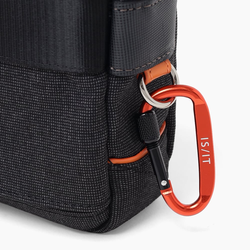 メインルームには長財布とコンパクトな折りたたみ傘がすっぽりと収納できるので、ちょっとしたおでかけに最適なサイズ感になっています。また、サイドにはカラビナが付いているので、AirPodsなどお好きなものを引っ掛けておくと便利です。