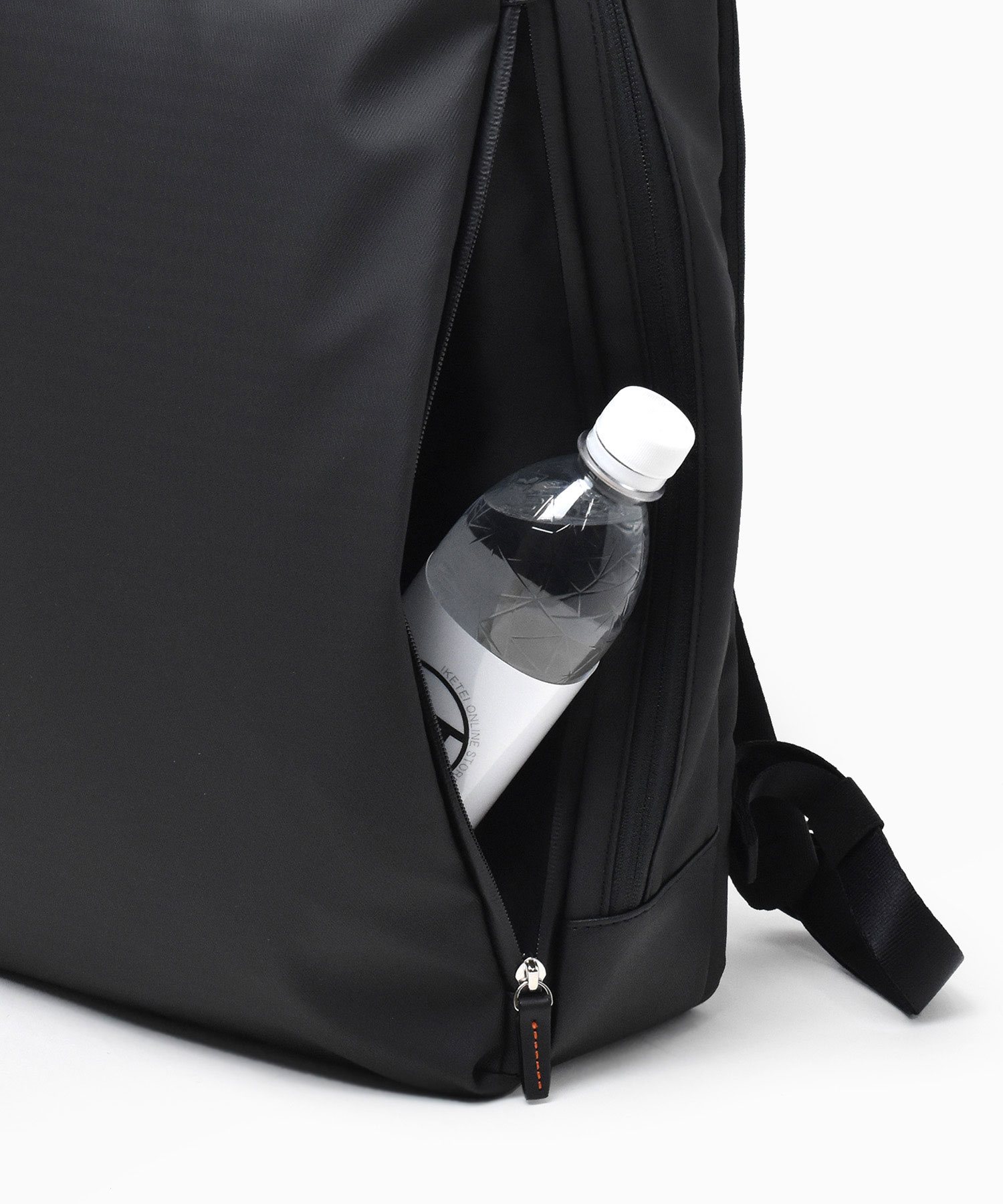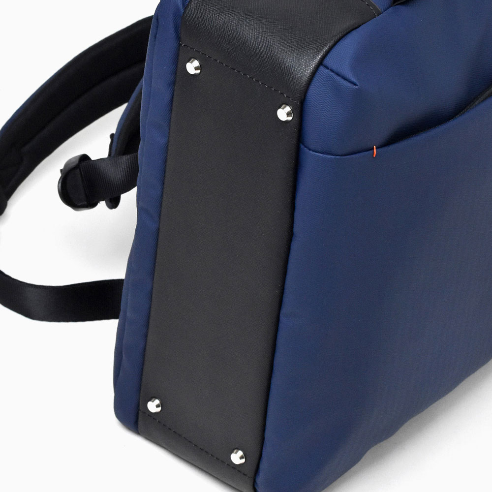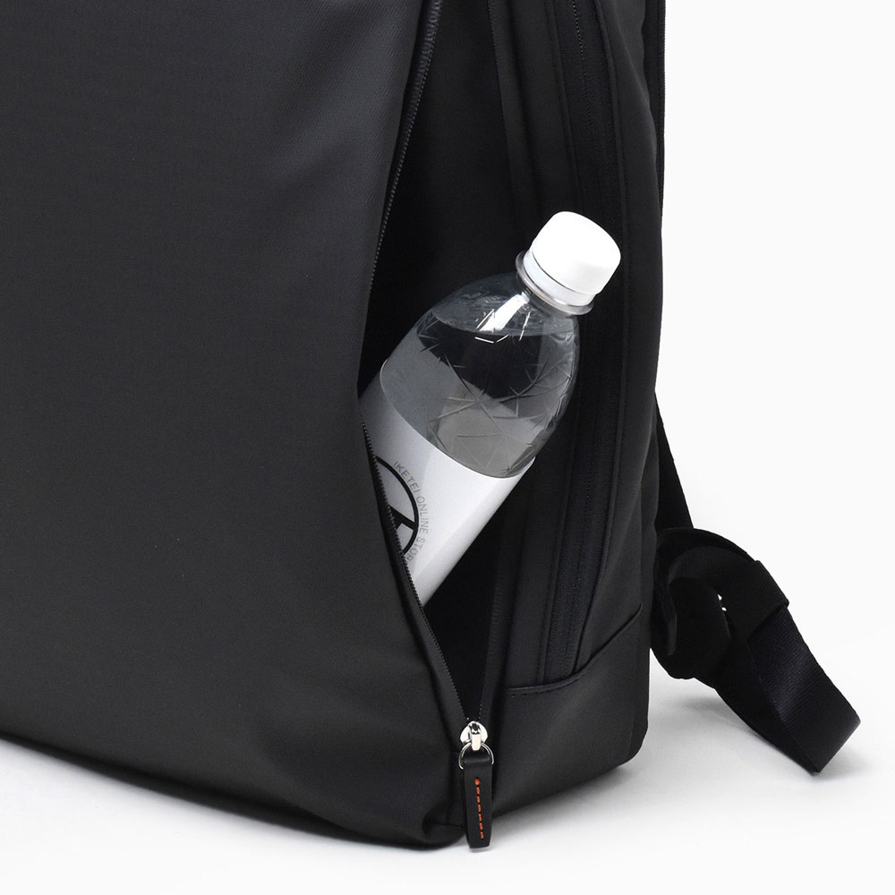 メインルームはサイドのマチが取り外し可能で、オープンポケットが4つ、ペン差し、ファスナーポケット、PC収納用ポケット(15インチ対応)、鍵を付けることができるキーホルダーがあり、背面にもPC収納ルーム(15インチ対応)があります。前面にはファスナーポケットがあり、内側にオープンポケットがあります。サイドにもファスナーポケットがあり、ファスナー部分にはコーティングファスナーを、内側には防水生地を使用しているのでペットボトルや折りたたみ傘の収納に便利です。