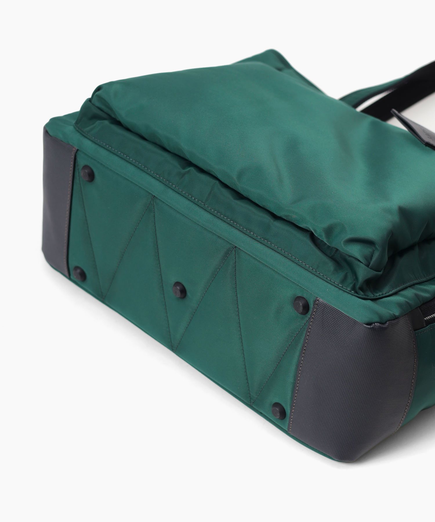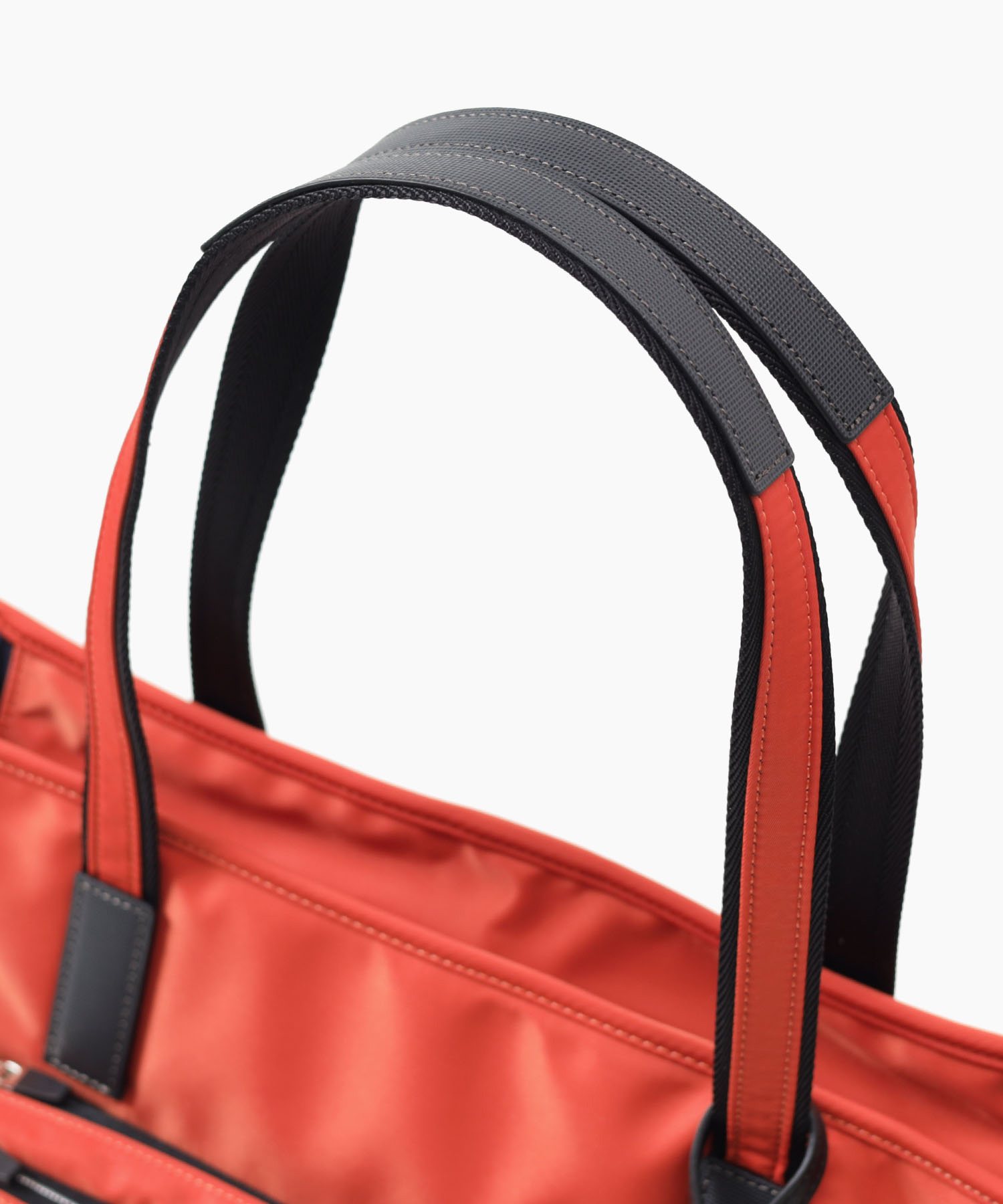 陰影ある光沢感と発色の良いカラーの魅力あふれる高密度ナイロンツイル生地を使用しています。付属革の部分には、シャープな格子状のエンボスを施しております。艶と色でツートンで加工をし、傷が付きにくくなっています。