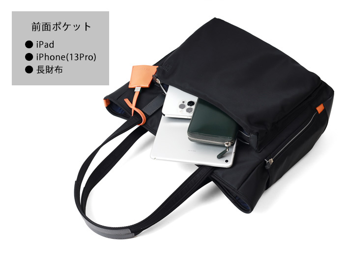 フロントポケットには、iPad・iPhone・長財布が収納できます。2層式になっており、1つは厚マチ仕様になっています。