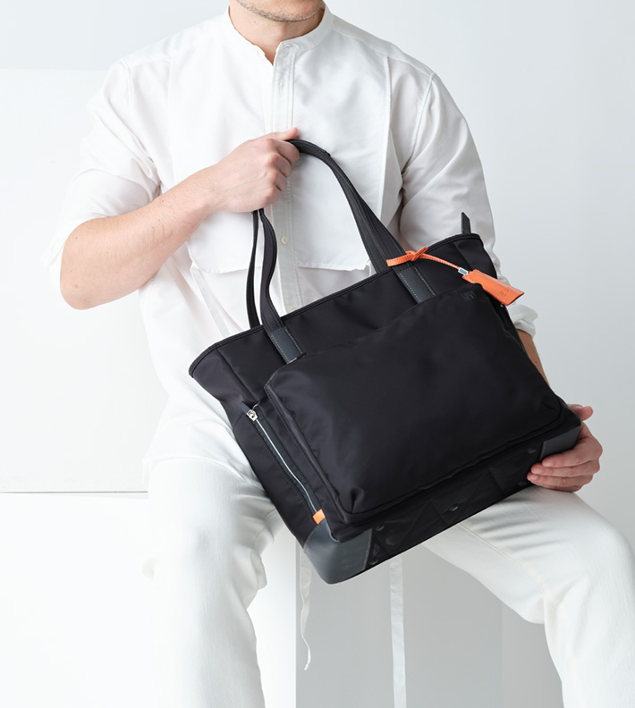 「収納しやすい」を追求し完成した、イズイットのA4サイズのトートバッグ。フロントにある機能的な2層式のポケットがポイント。スマホや財布類など、使用頻度の高いアイテムが収納しやすいようデザインしました。