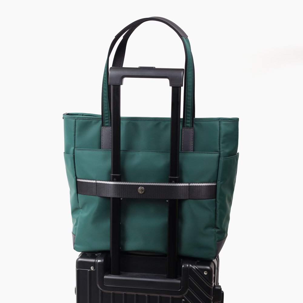 背面には、キャリーケースの持ち手に通すセットアップ用ベルトがついています。出張などに便利な仕様になっています。