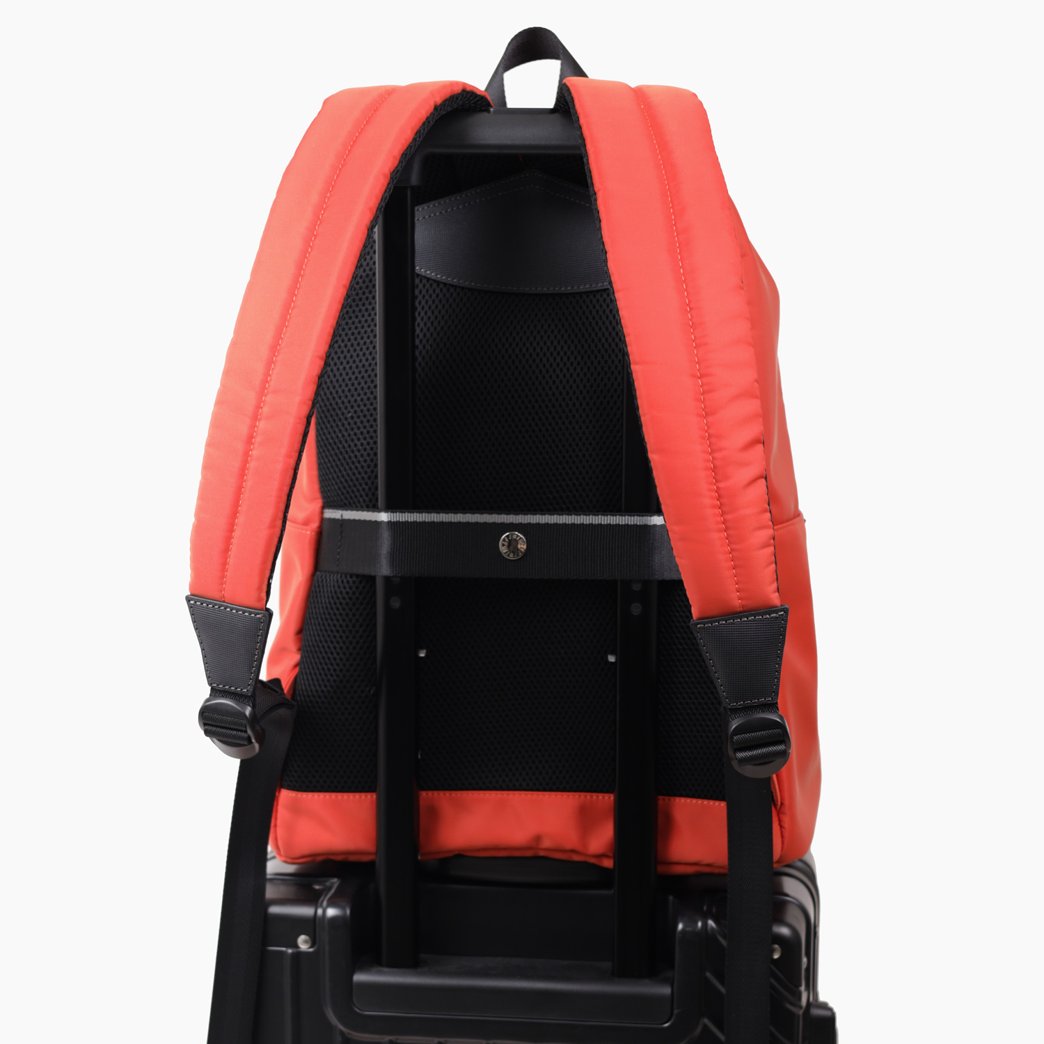 背面には、キャリーケースの持ち手に通すセットアップ用ベルトがついています。出張などに便利な仕様になっています。