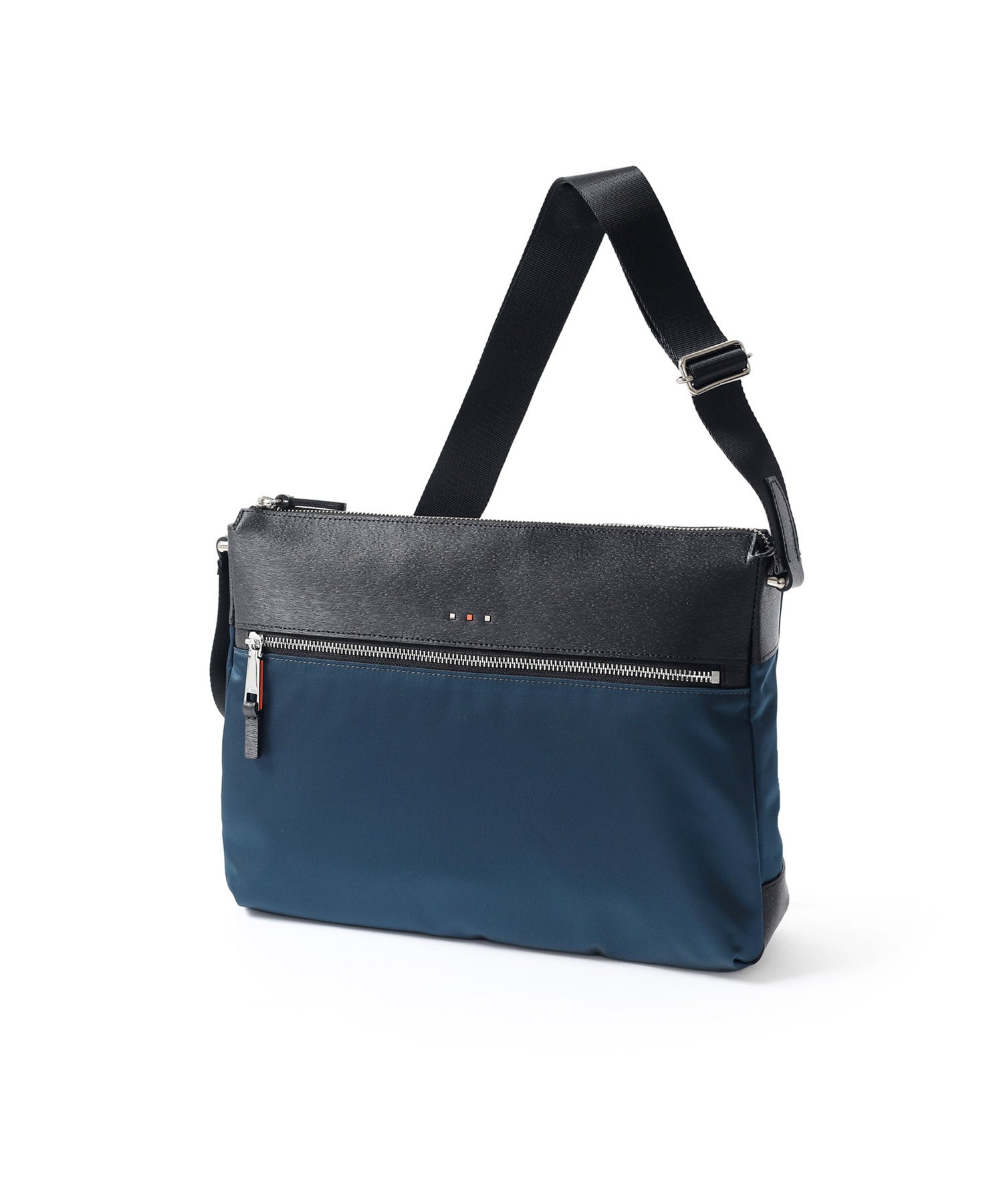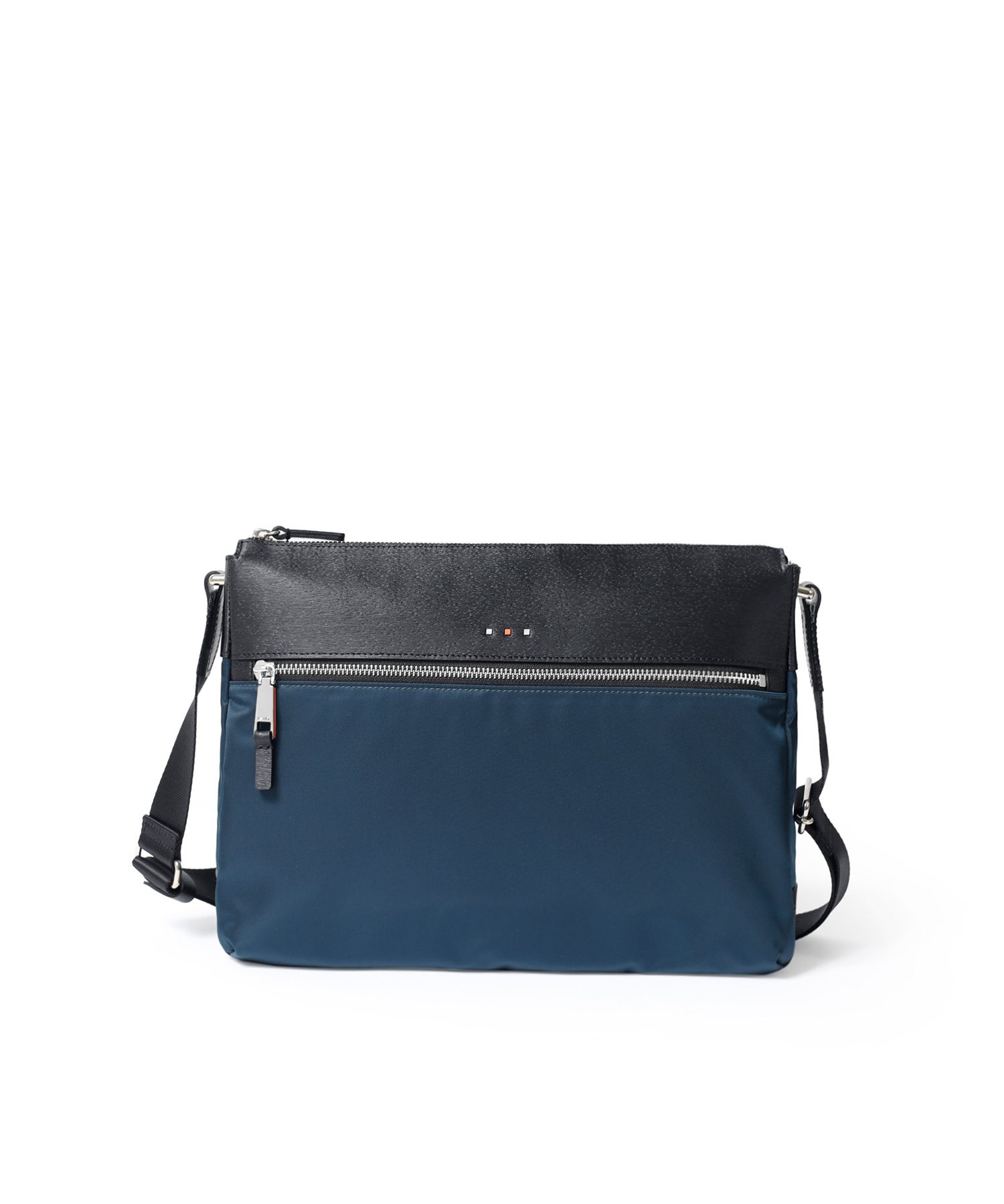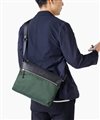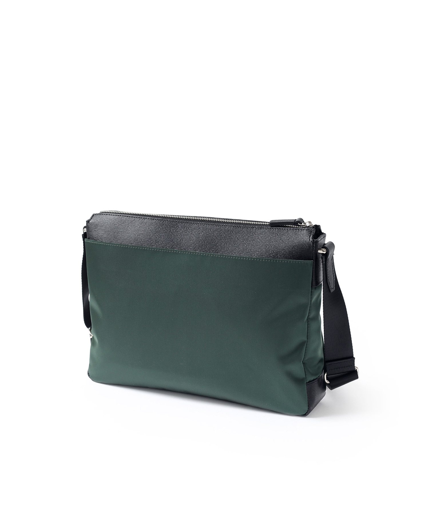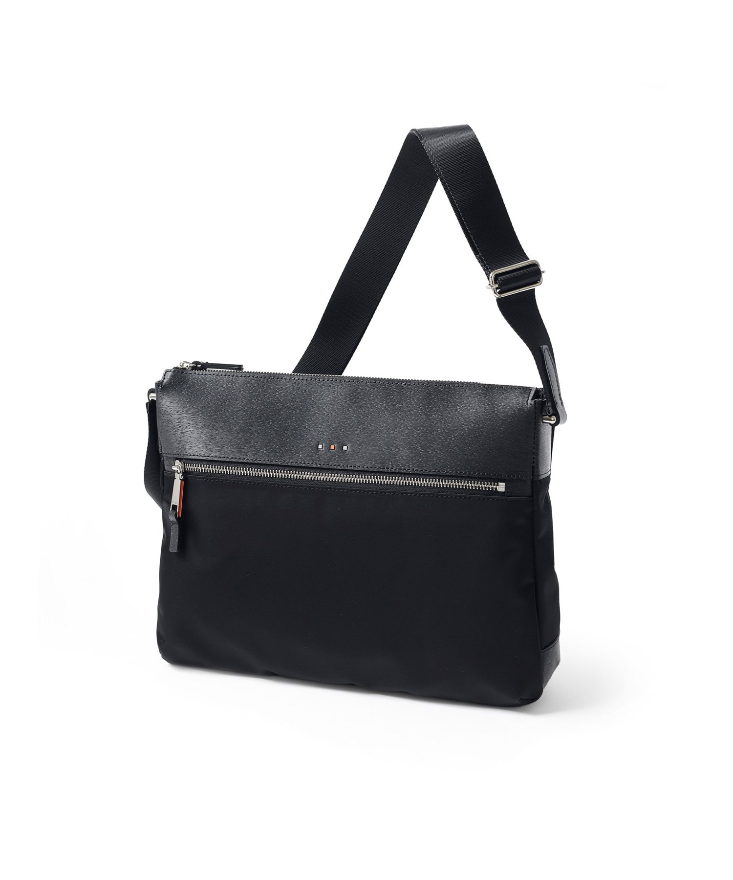 上品な光沢とソフトな風合いが特徴のナイロン素材と、凹凸のあるエンボスレザーを組み合わせたシンプルな日本製のA4サイズのショルダーバッグ。フラットな本体生地とエンボスレザーの素材コンビネーションが際立ちます。