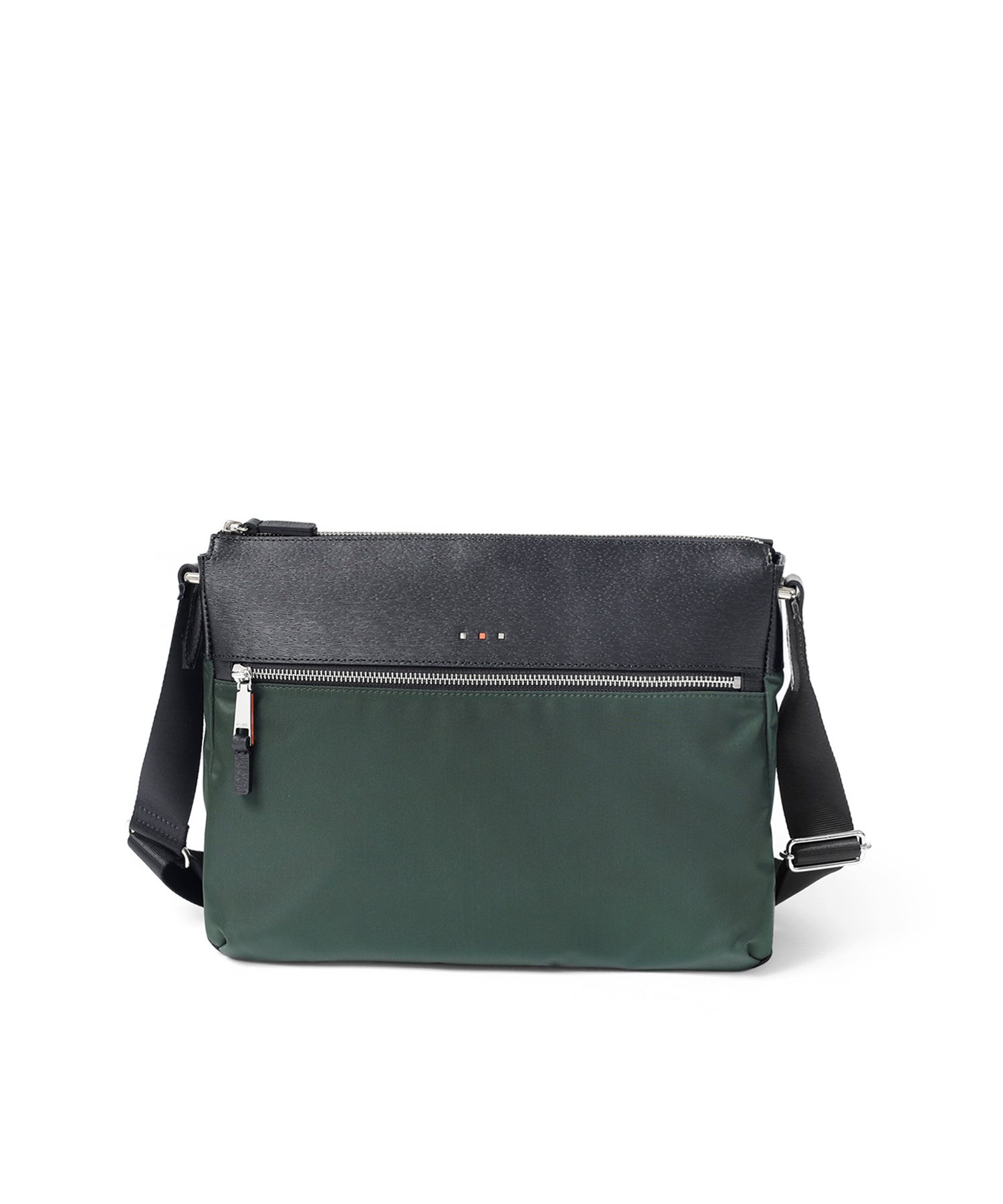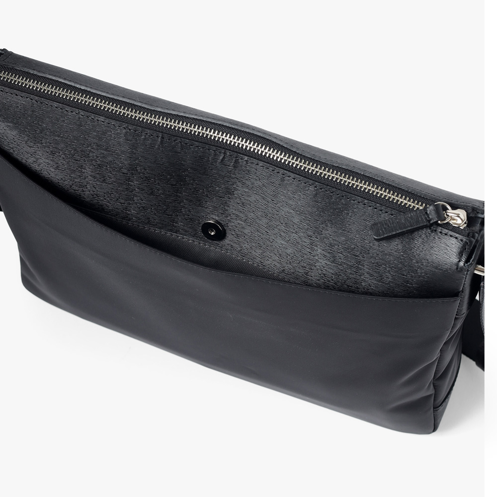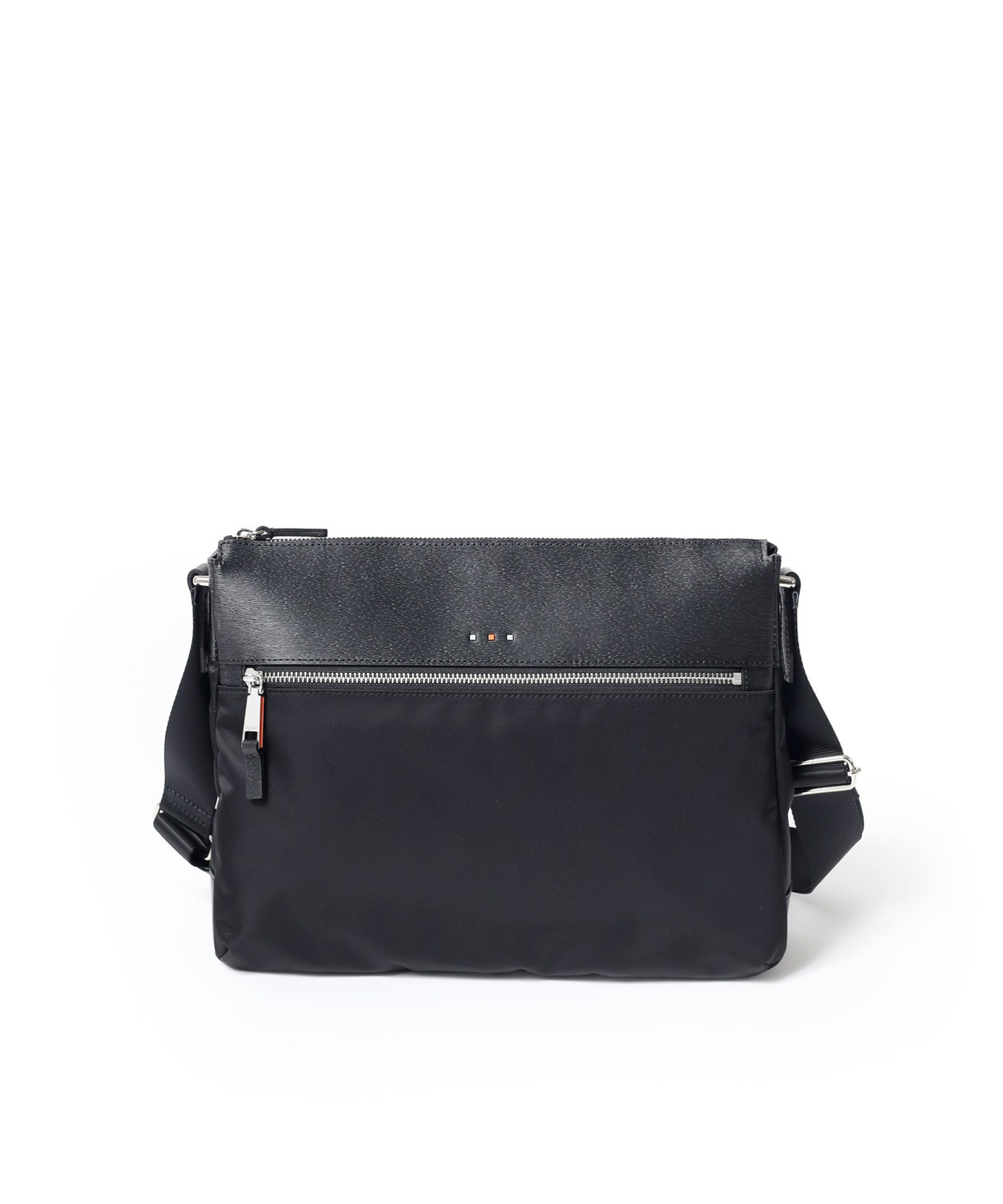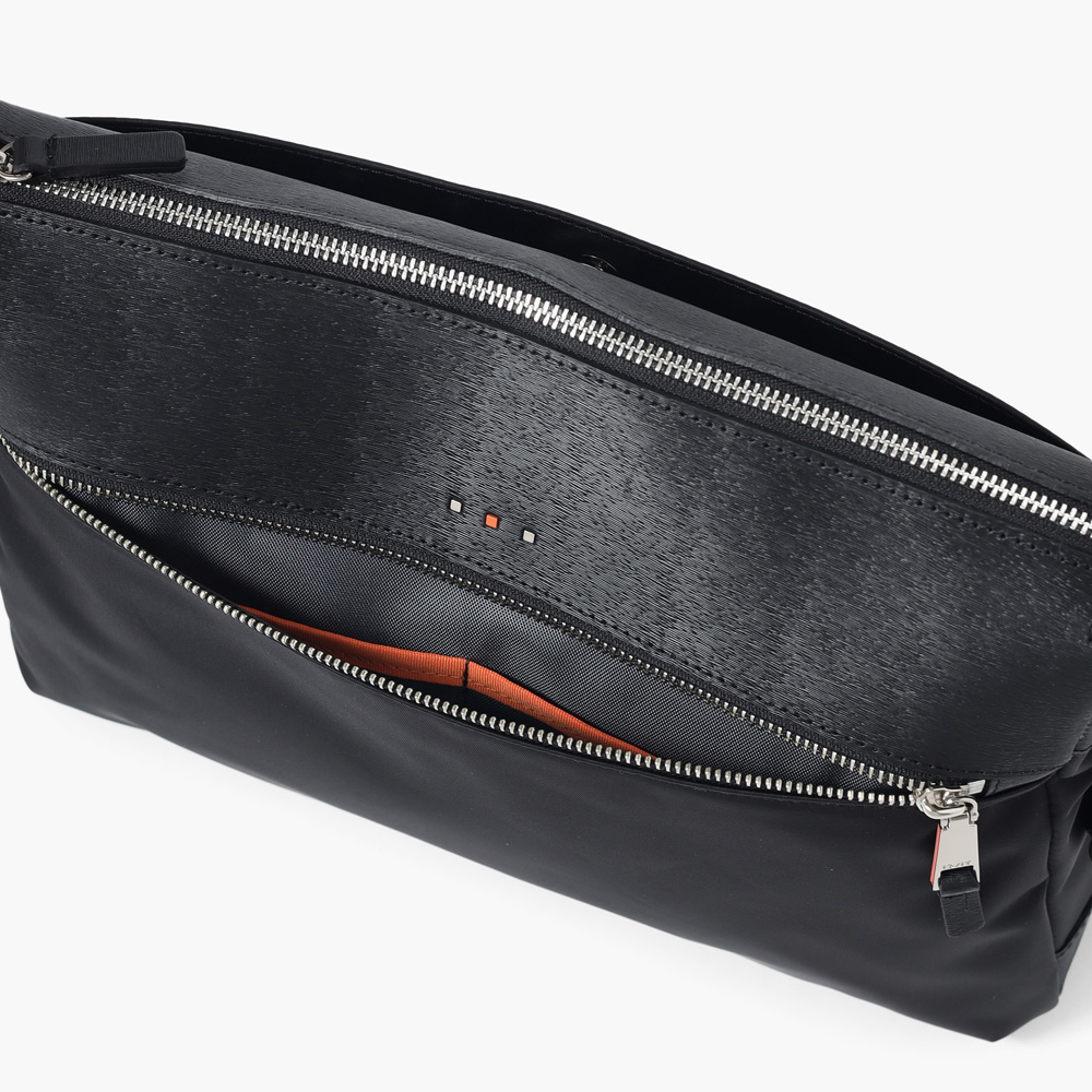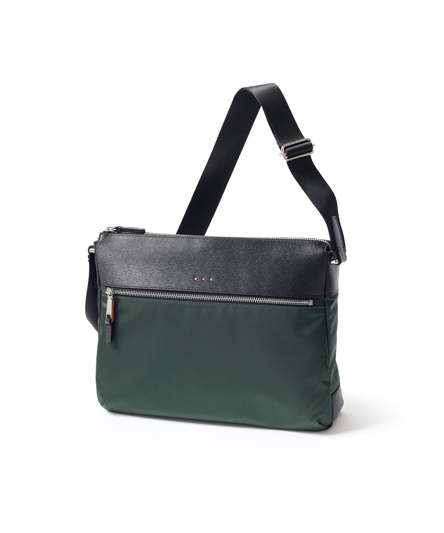 上品な光沢とソフトな風合いが特徴のナイロン素材と、凹凸のあるエンボスレザーを組み合わせたシンプルな日本製のA4サイズのショルダーバッグ。フラットな本体生地とエンボスレザーの素材コンビネーションが際立ちます。