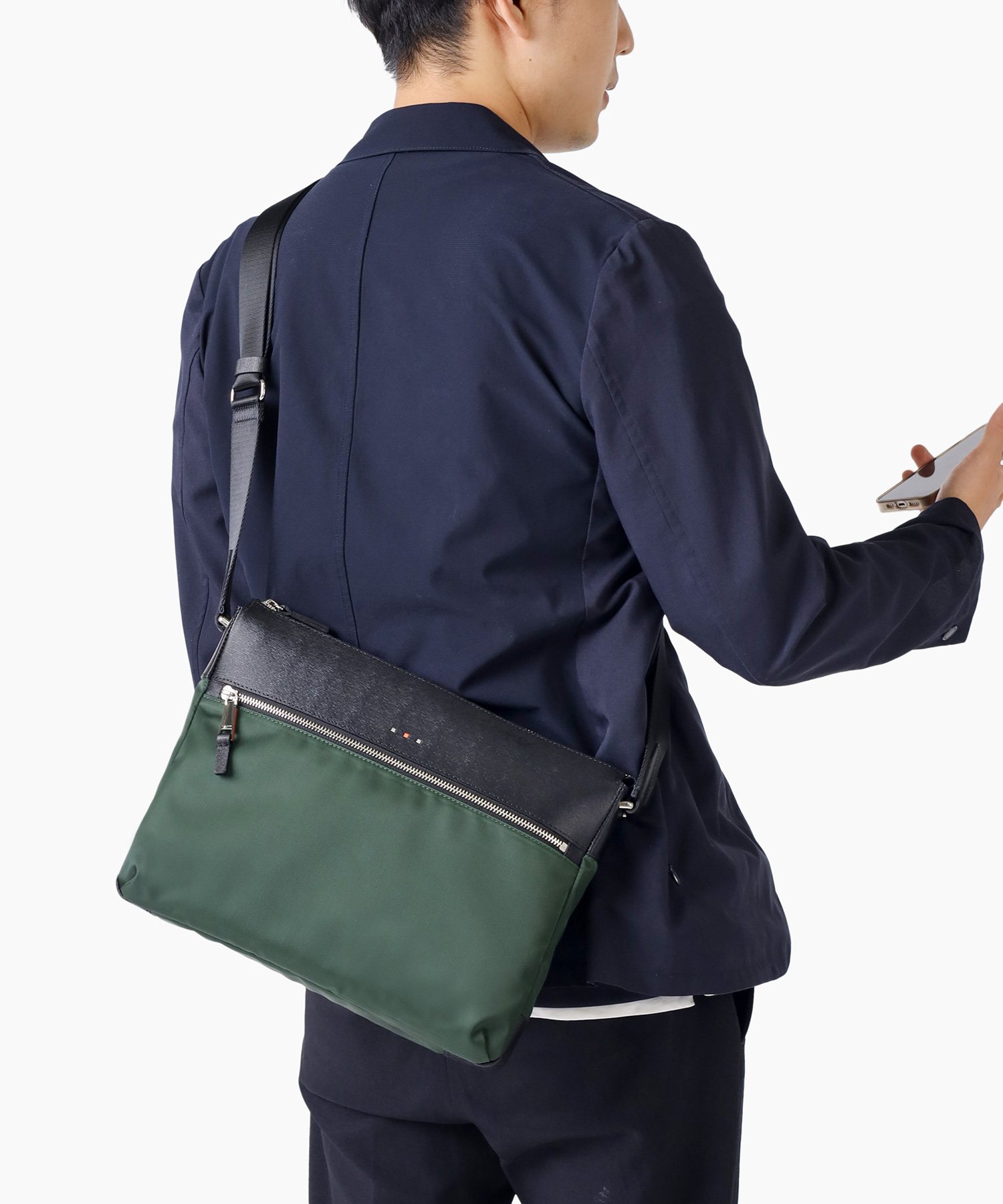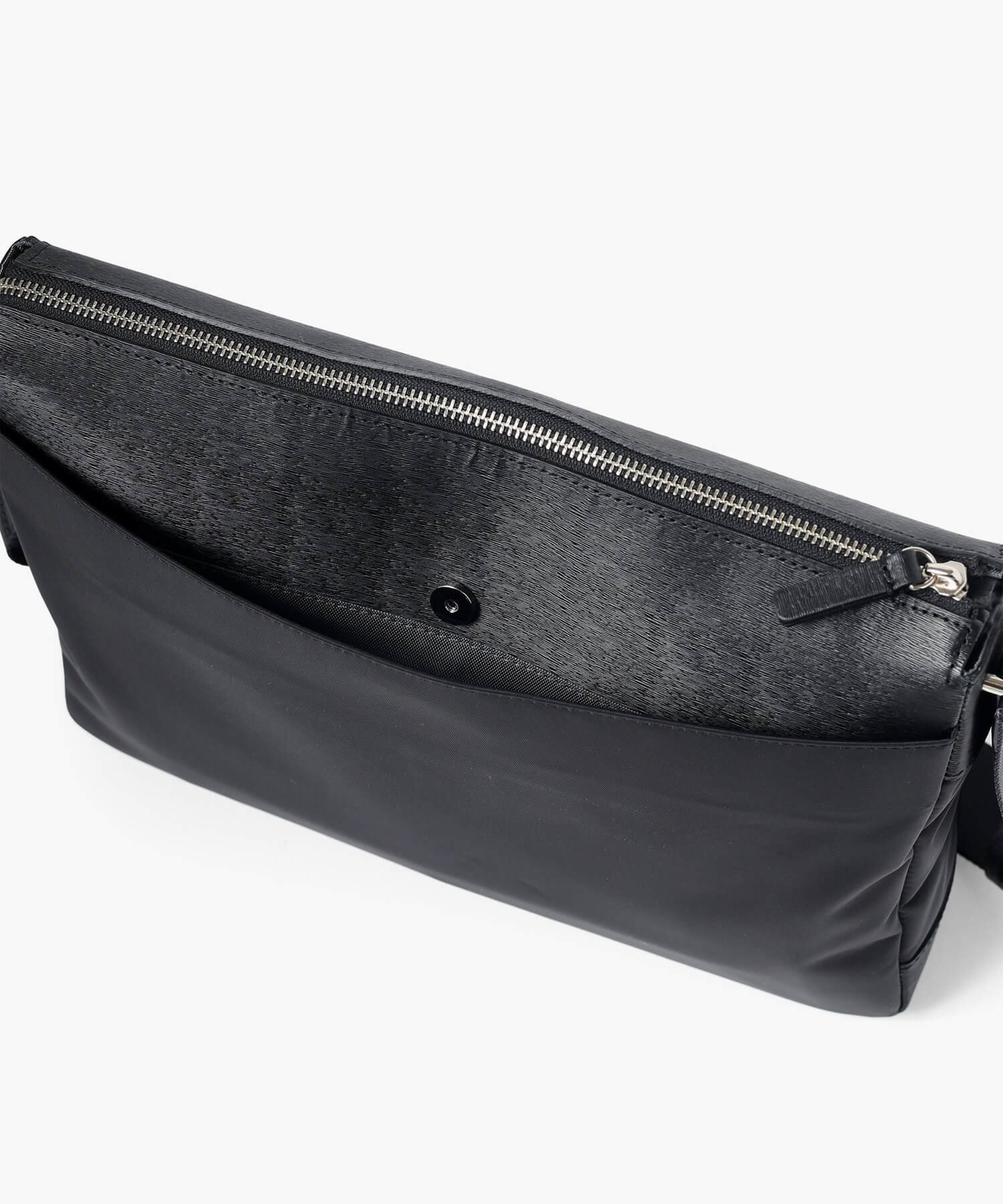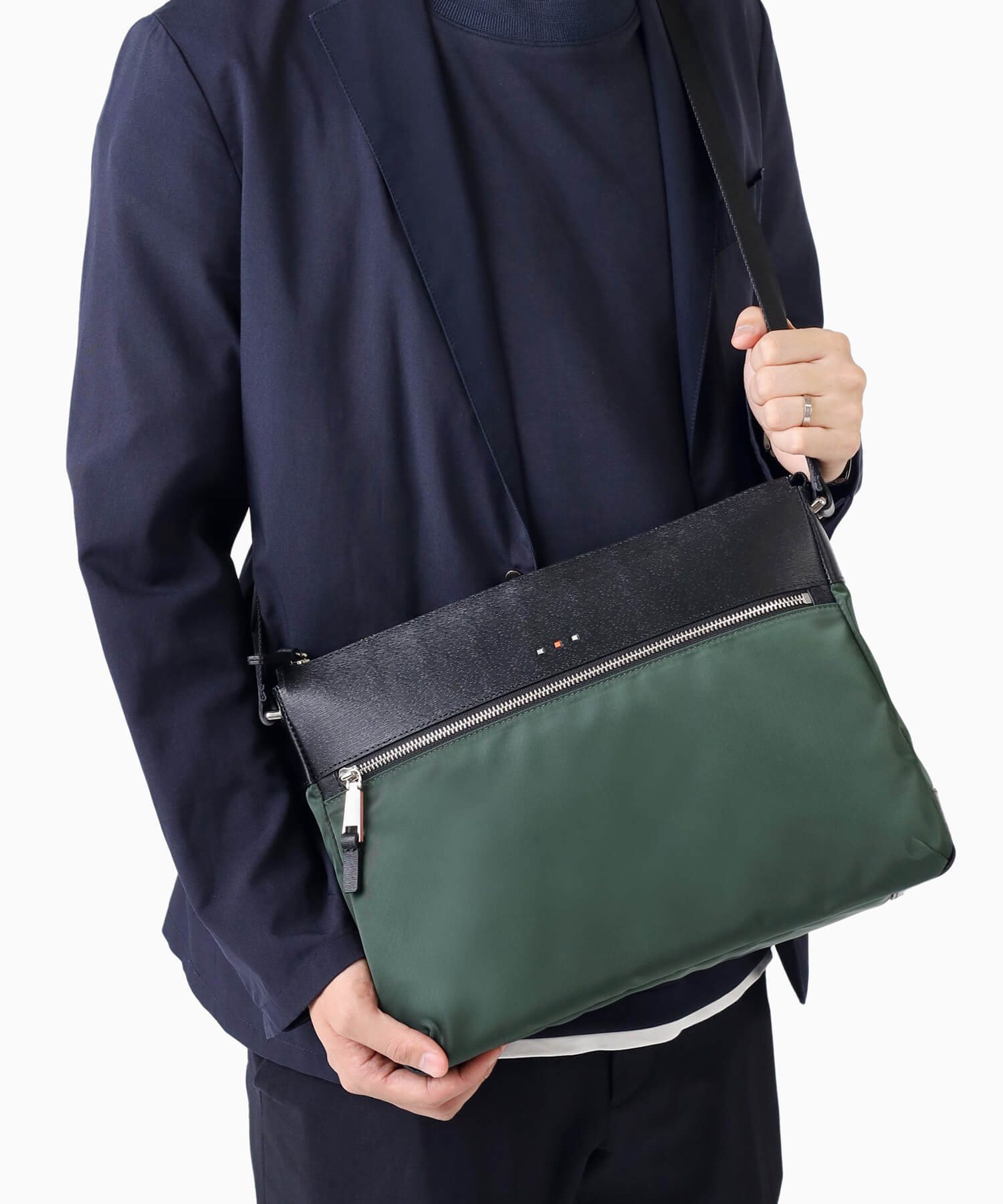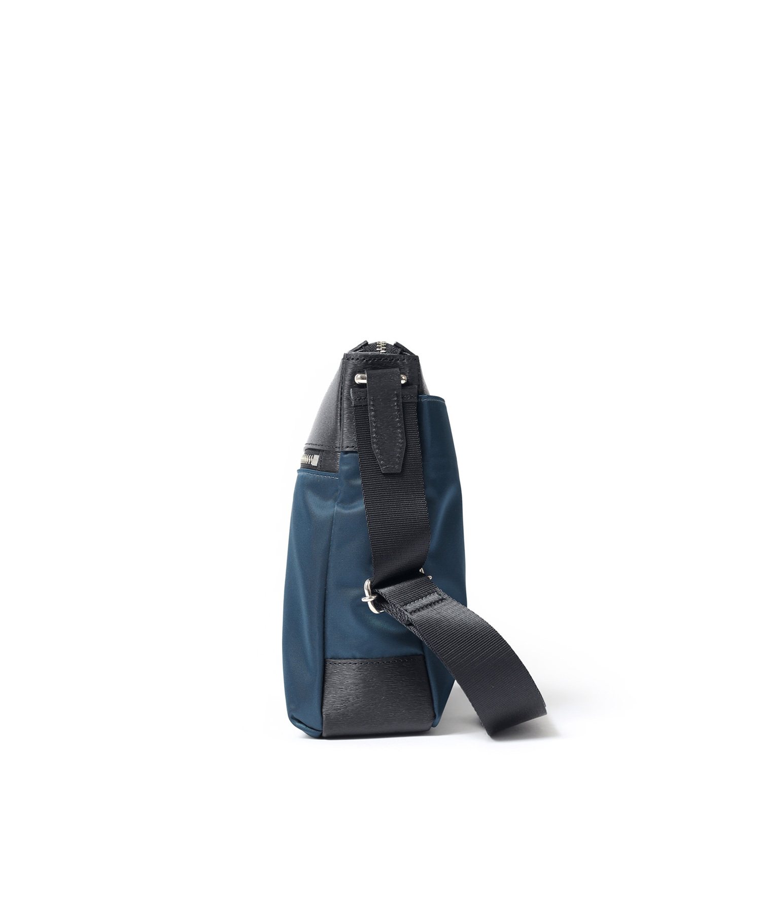 上品な光沢とソフトな風合いが特徴のナイロン素材と、凹凸のあるエンボスレザーを組み合わせたシンプルな日本製のA4サイズのショルダーバッグ。フラットな本体生地とエンボスレザーの素材コンビネーションが際立ちます。