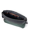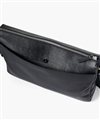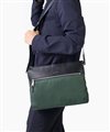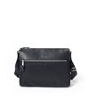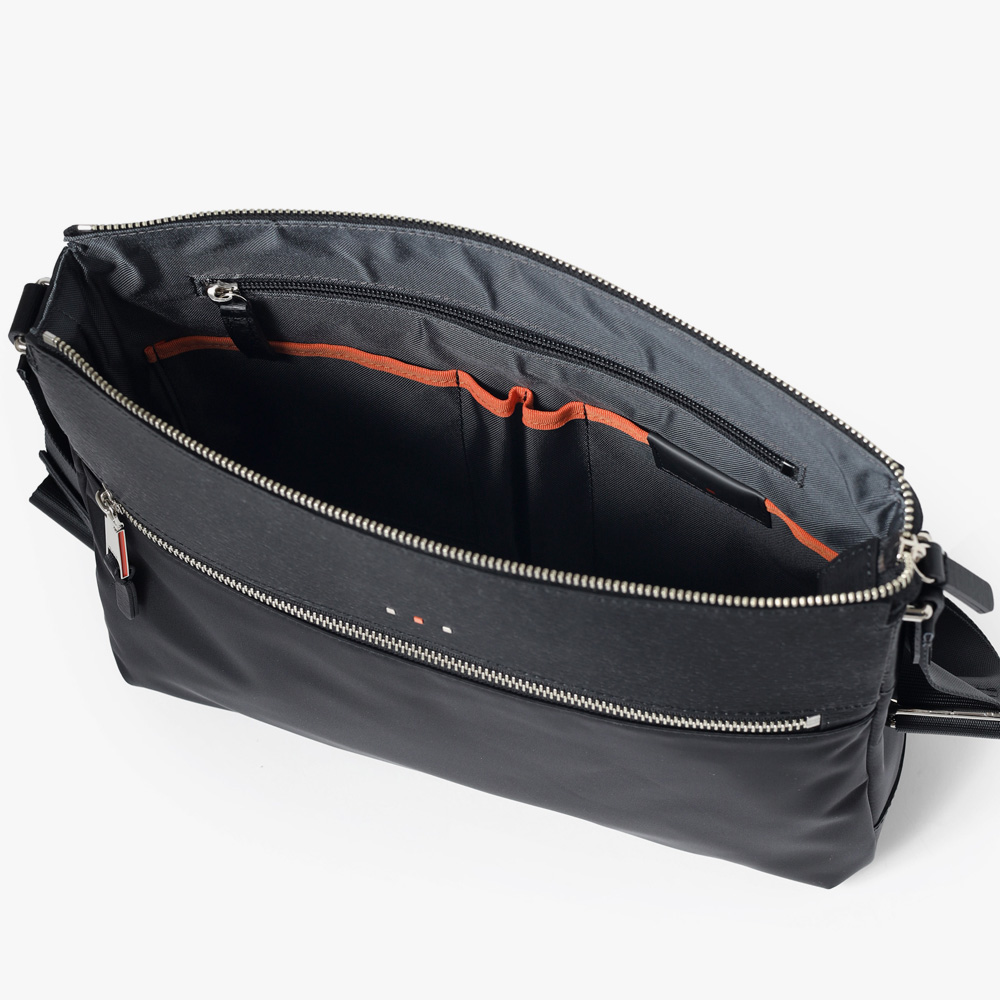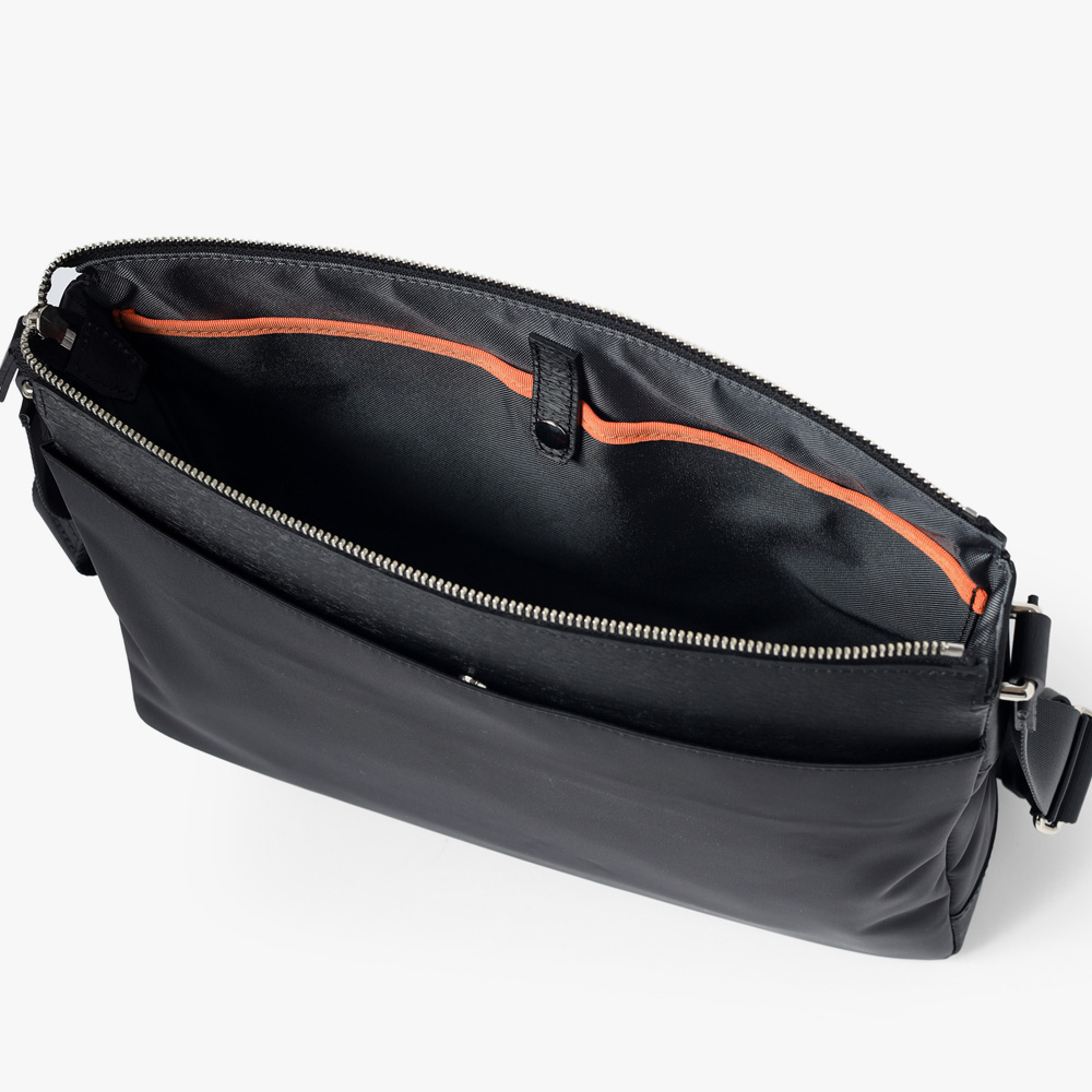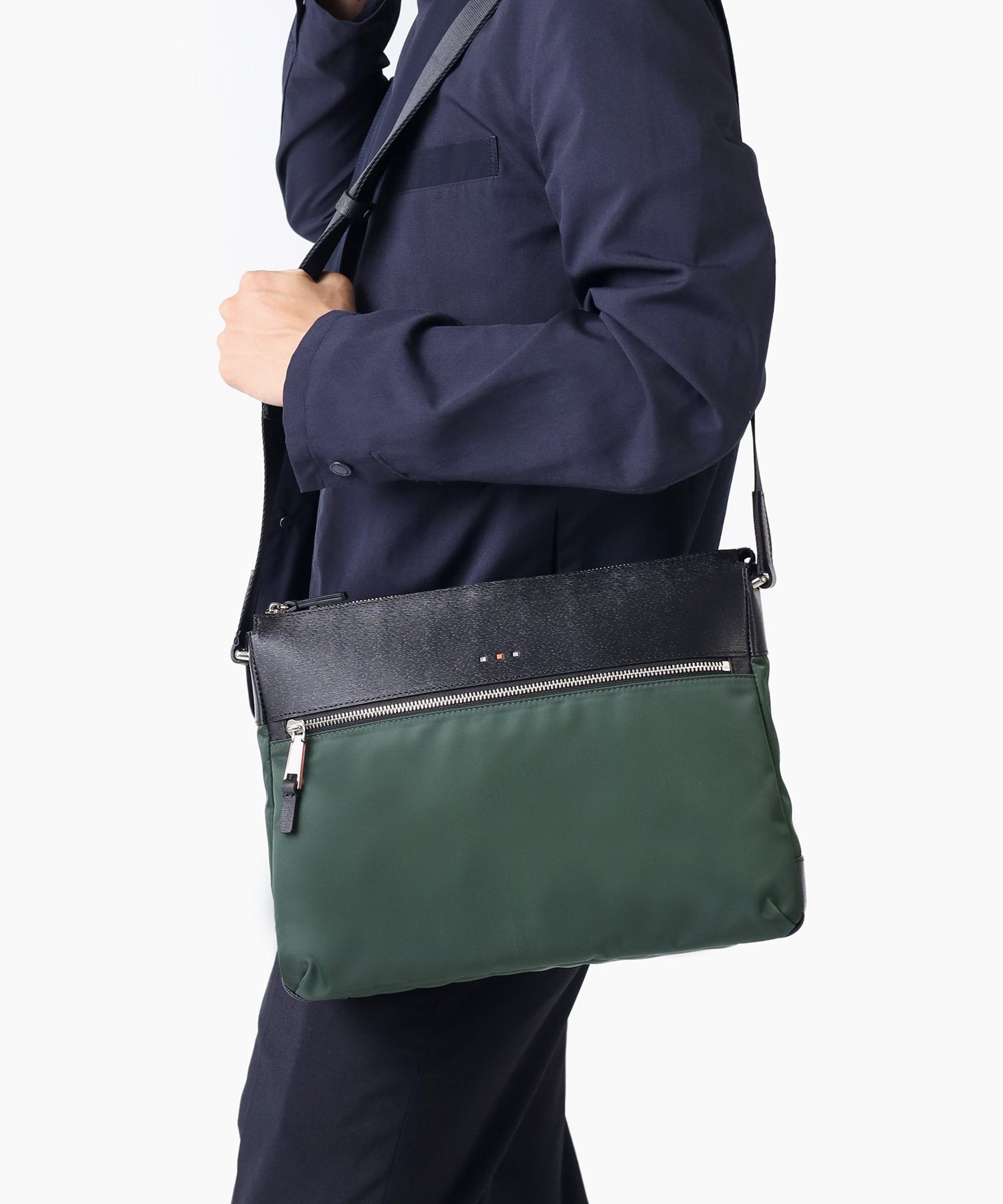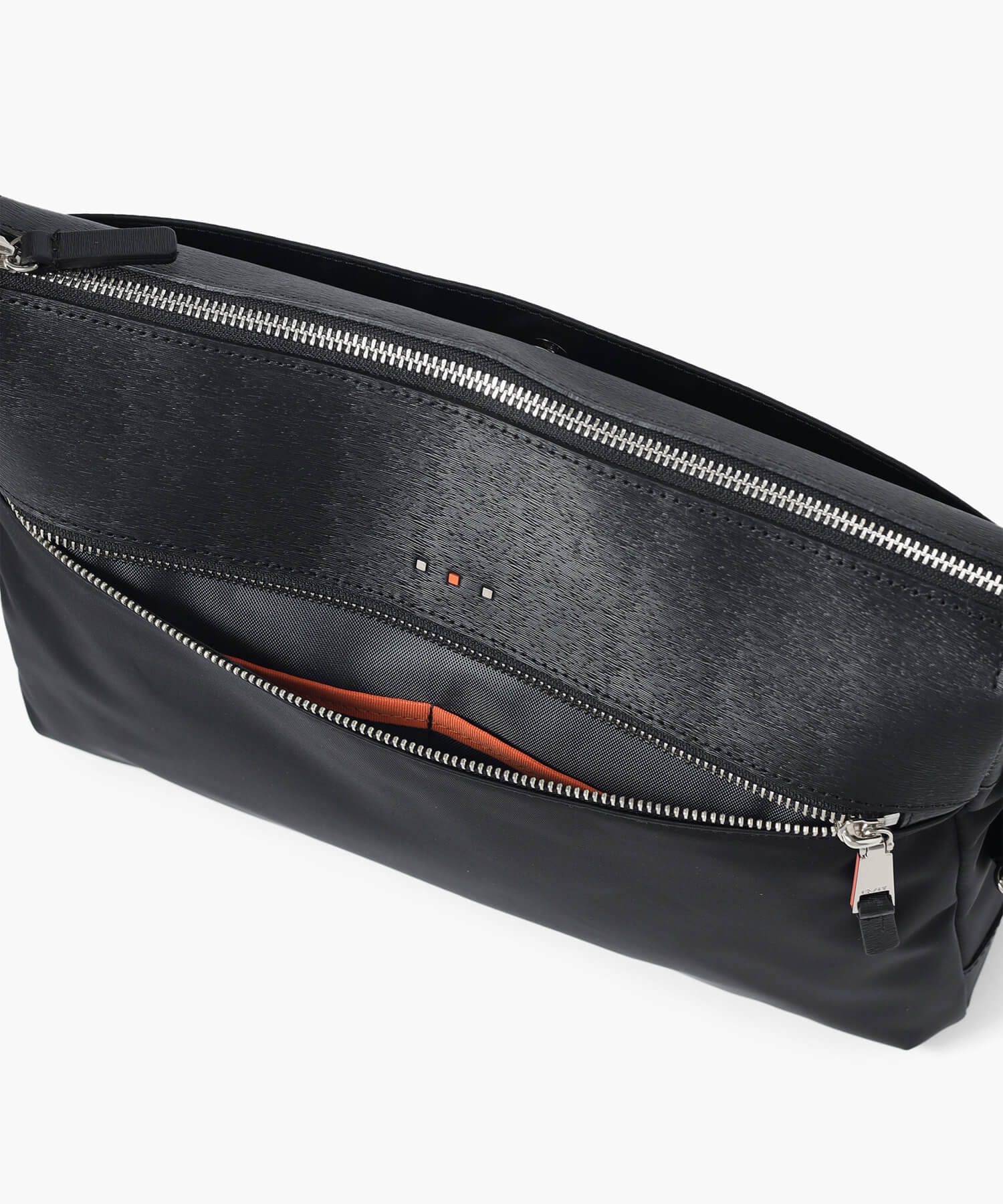 上品な光沢とソフトな風合いが特徴のナイロン素材と、凹凸のあるエンボスレザーを組み合わせたシンプルな日本製のA4サイズのショルダーバッグ。フラットな本体生地とエンボスレザーの素材コンビネーションが際立ちます。