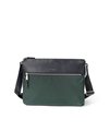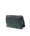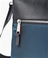上品な光沢とソフトな風合いが特徴のナイロン素材と、凹凸のあるエンボスレザーを組み合わせた、シンプルな日本製のA4サイズのショルダーバッグです。フラットな本体生地とエンボスレザーの素材コンビネーションが際立ちます。