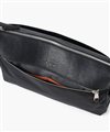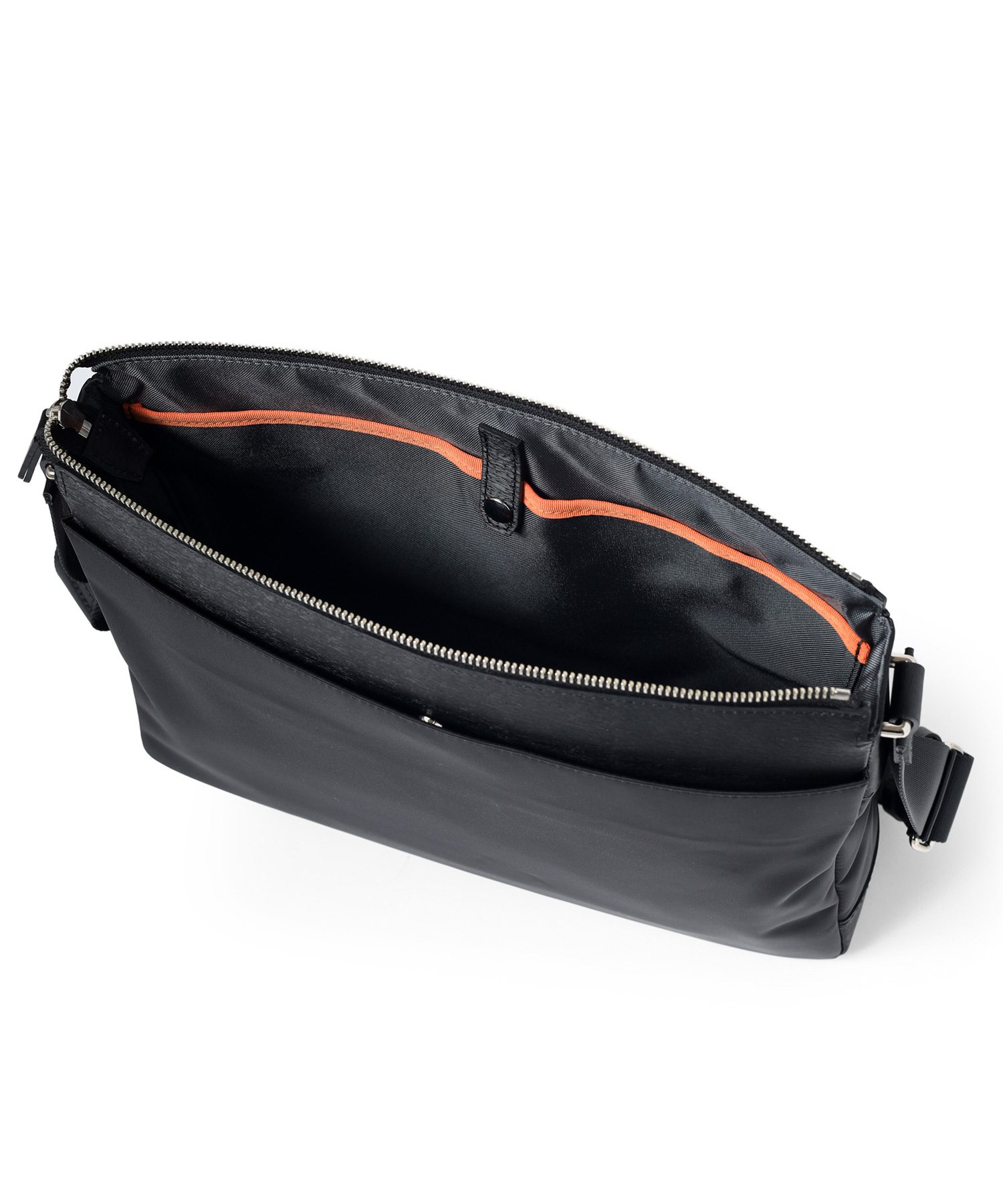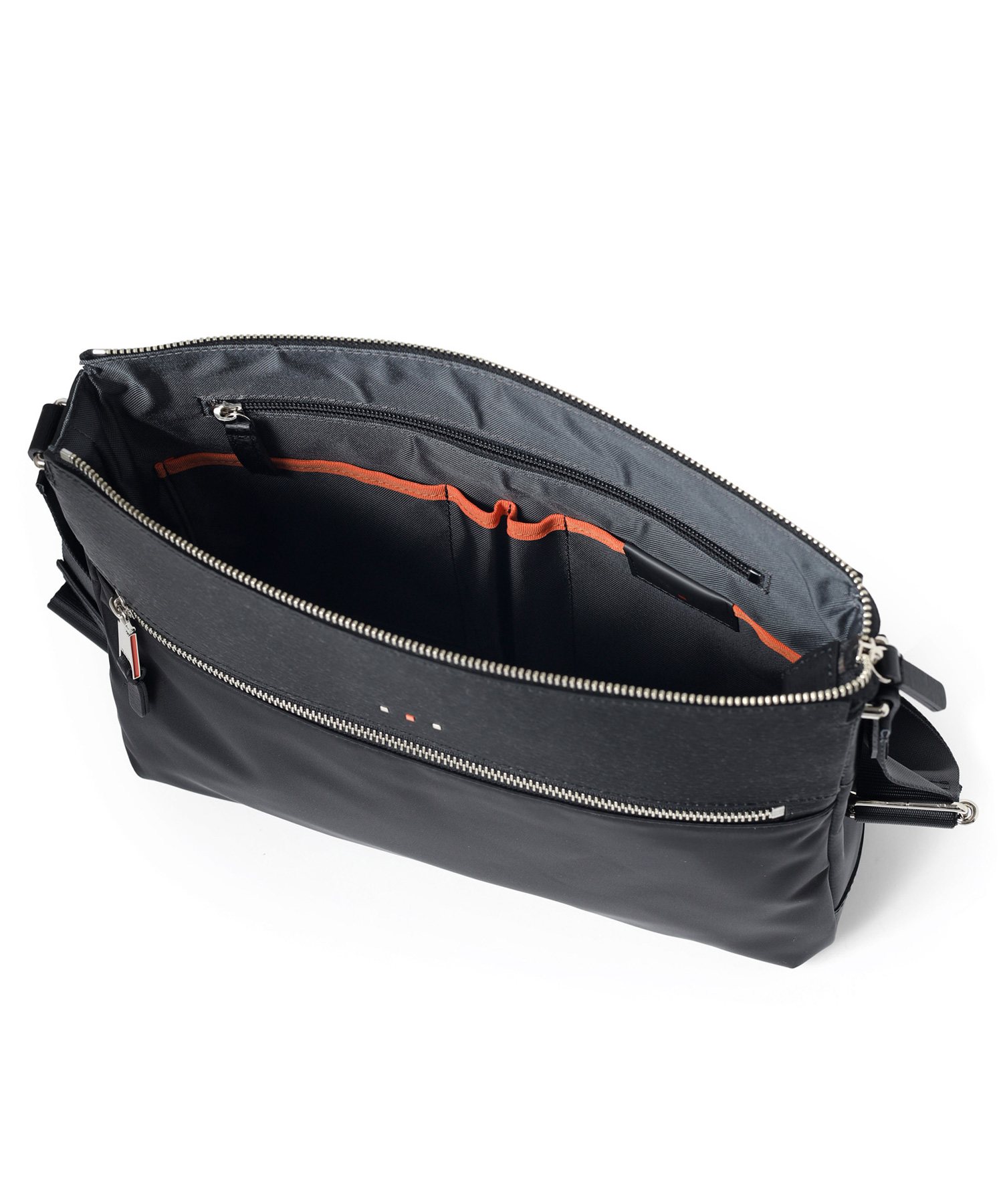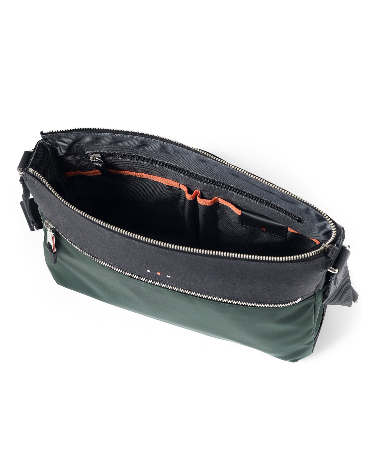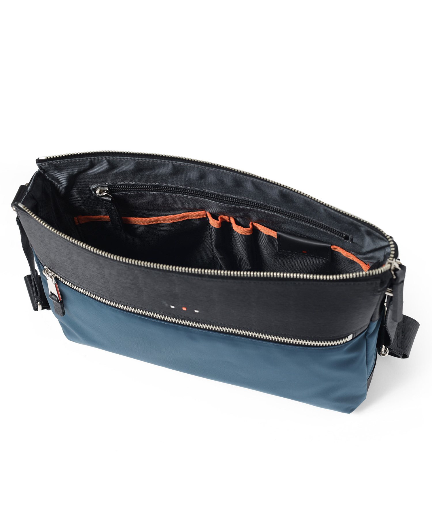 メインルームはA4ファイルの収納が可能なサイズ感です。カバンの内装には、ファスナーポケットが1つ、オープンポケットが2つ、ペン差しが2つ装備されています。また、前面にはファスナーポケットがあり、ポケット内にオープンポケットが2つあります。背面にもホック付きポケットがあります。