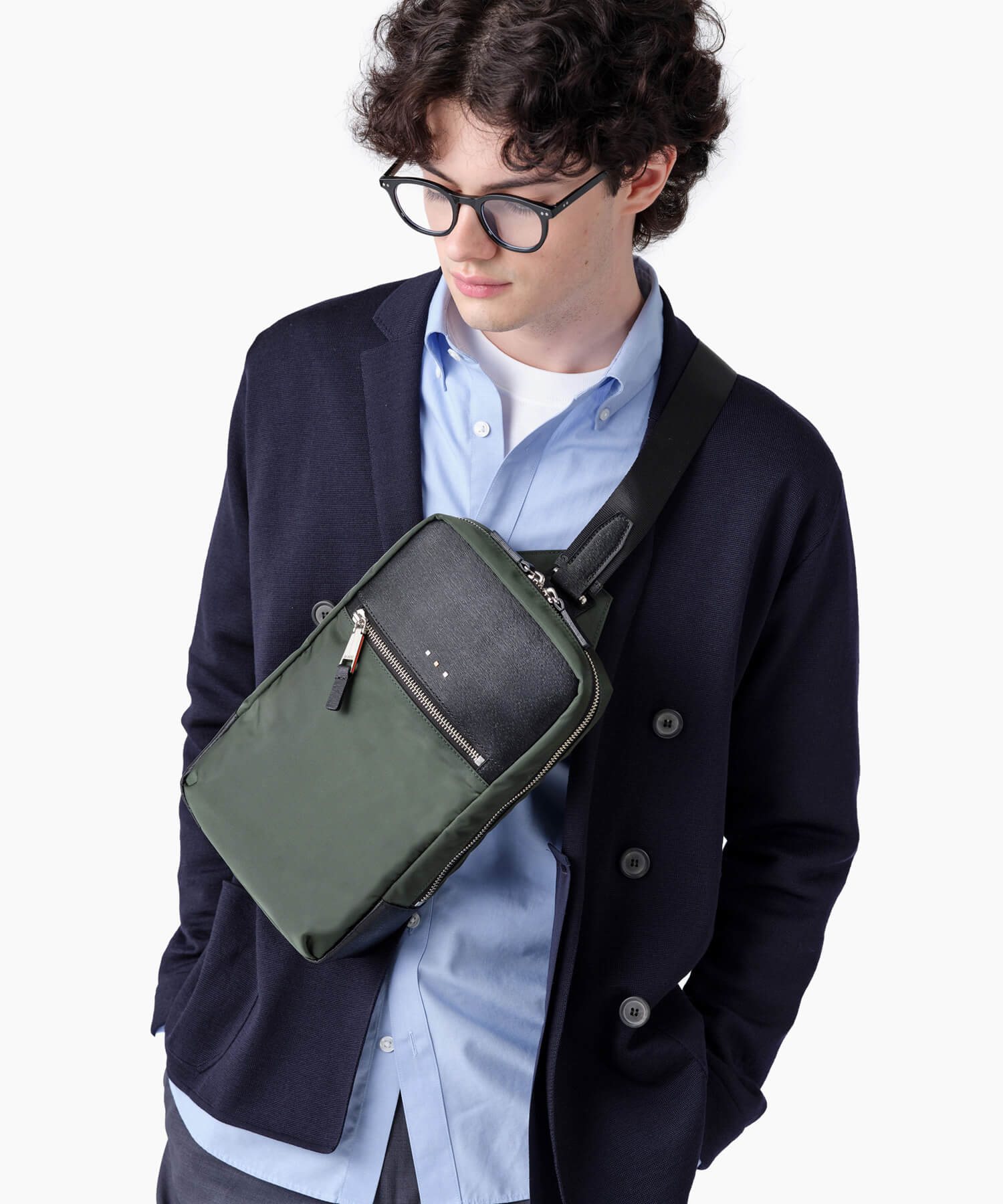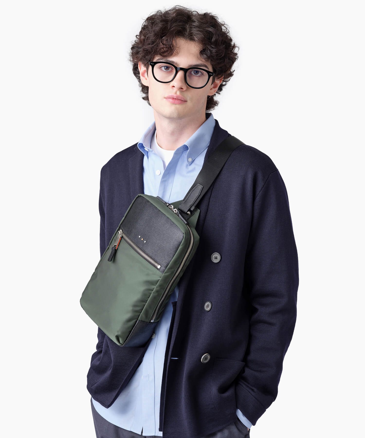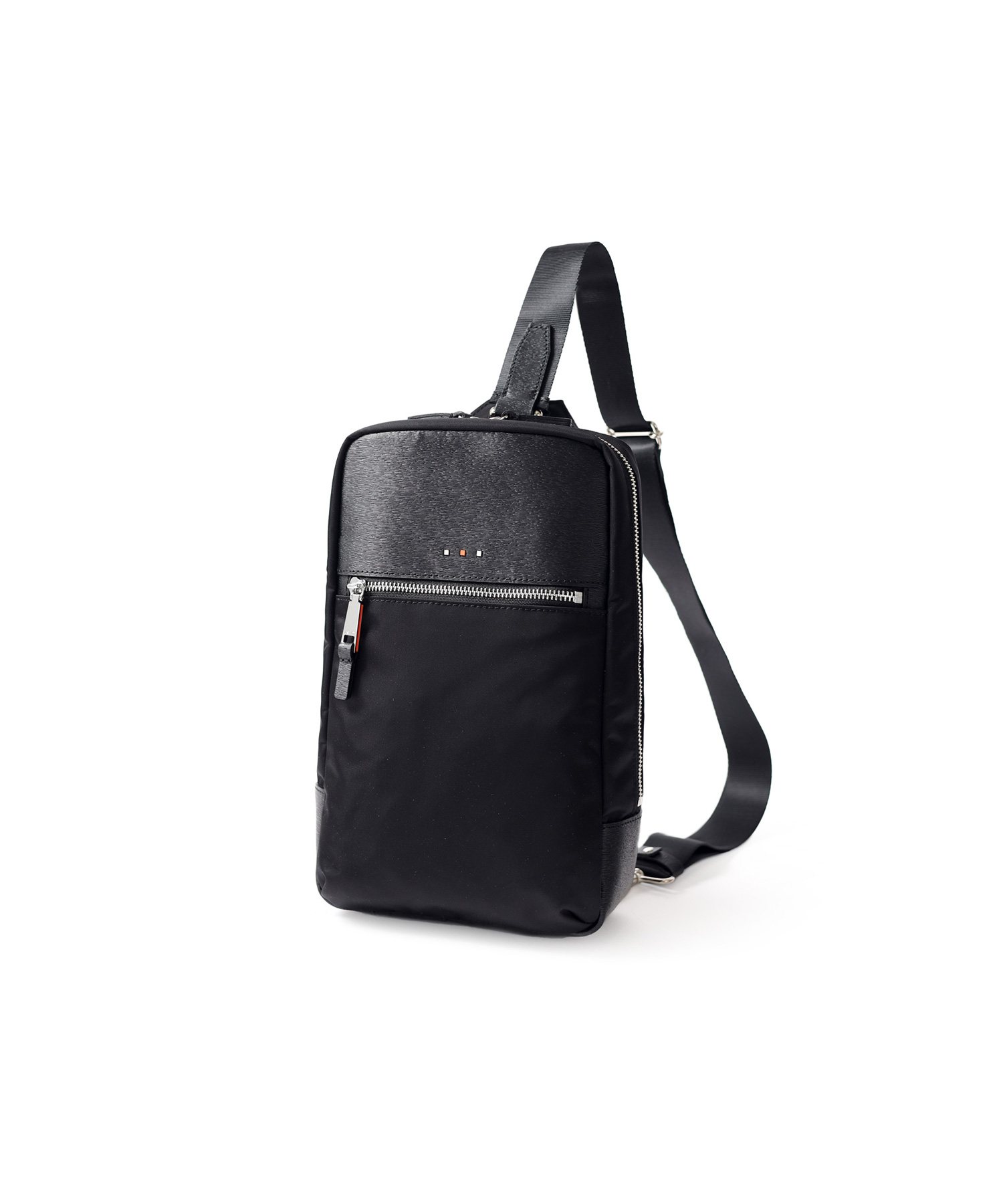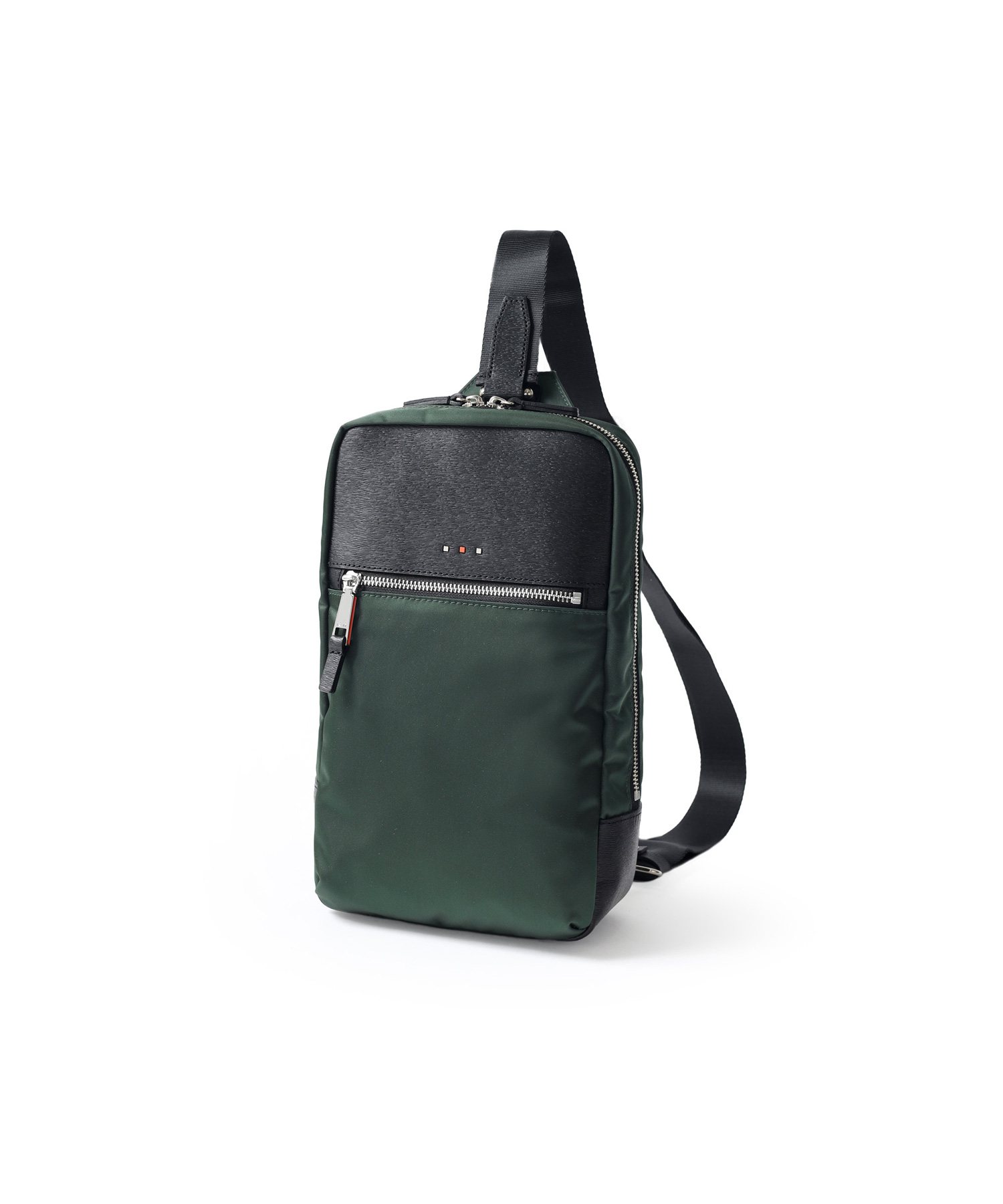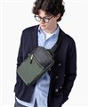 上品な光沢とソフトな風合いが特徴のナイロン素材と、凹凸のあるエンボスレザーを組み合わせた、シンプルな日本製のワンショルダーバッグです。フラットな本体生地とエンボスレザーの素材コンビネーションが際立ちます。