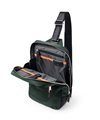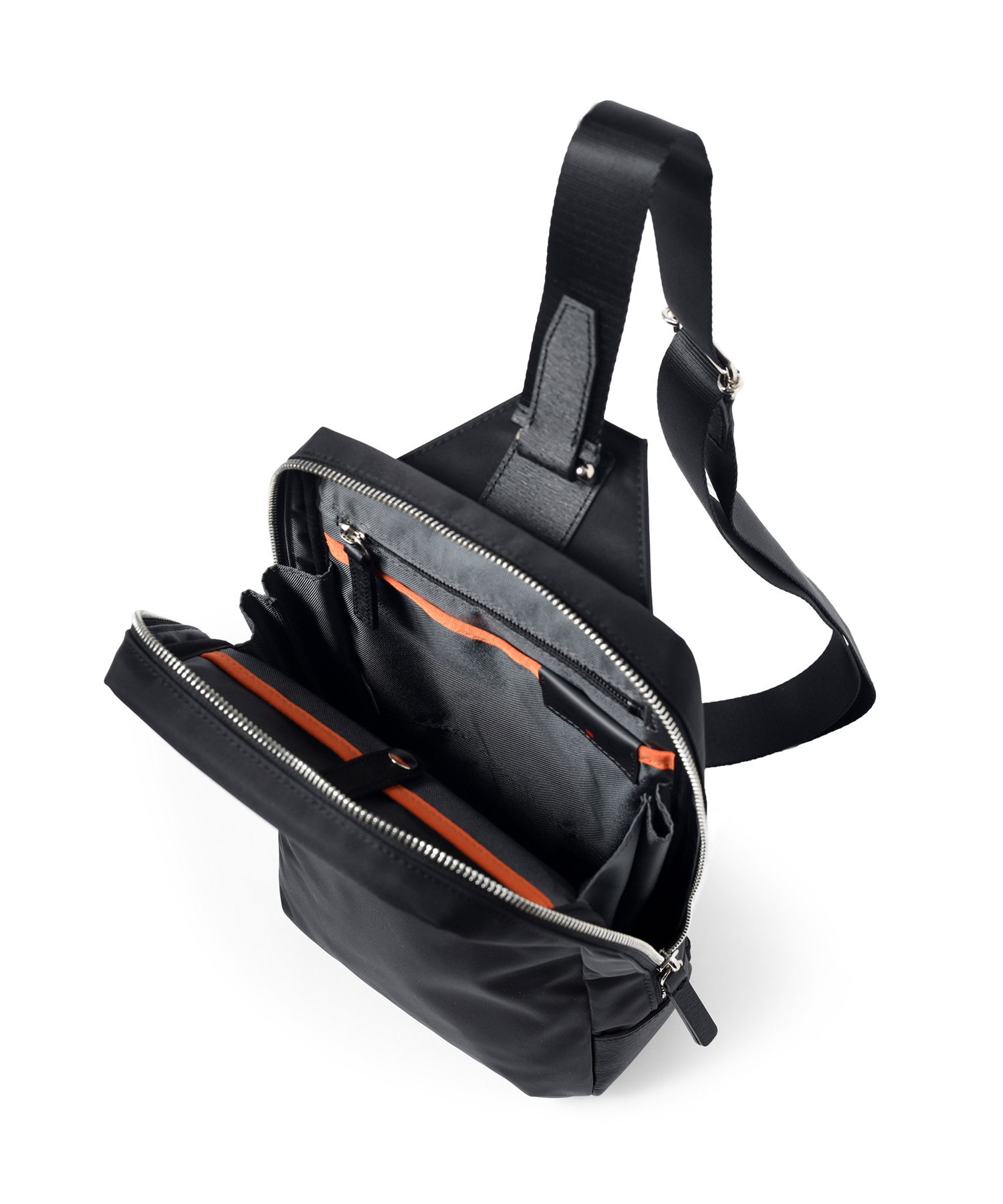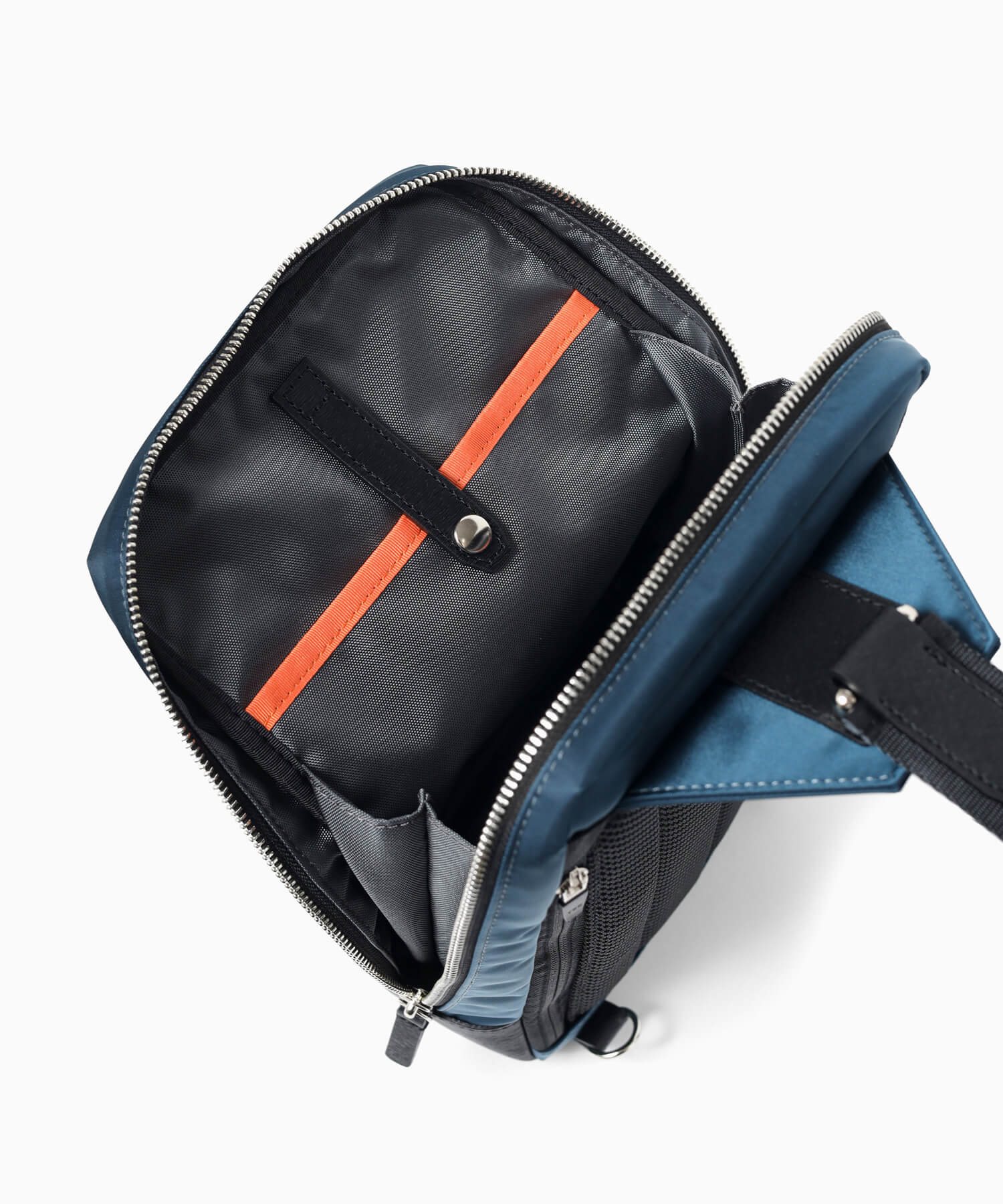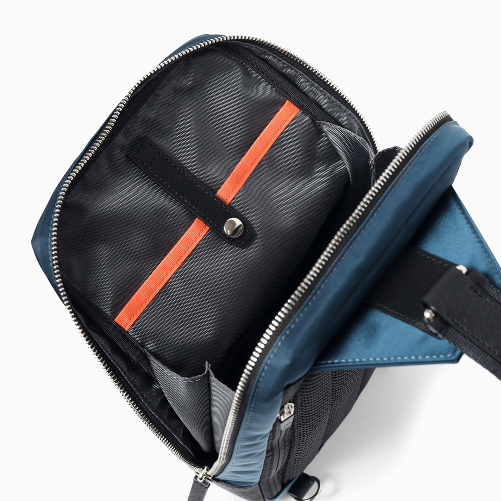 メインルームは500mlペットボトルを立てて収納が可能です。カバンの内装には、ファスナーポケットが1つ、オープンポケットが2つ装備されています。また、前面にはファスナーポケットがあります。背面にもファスナーポケットがあり、背負ったままの出し入れに便利です。