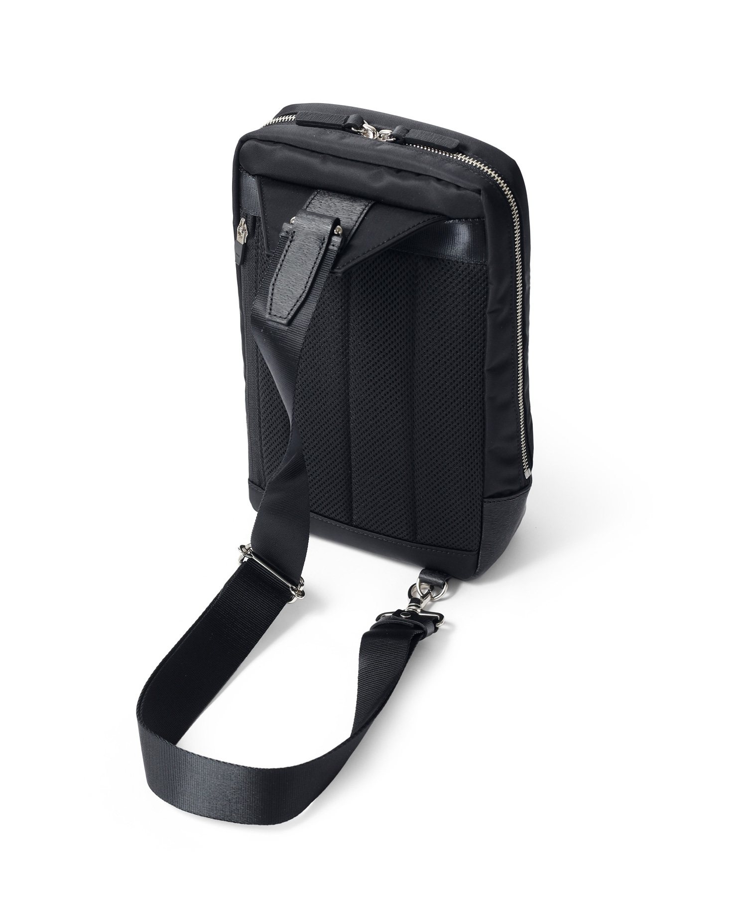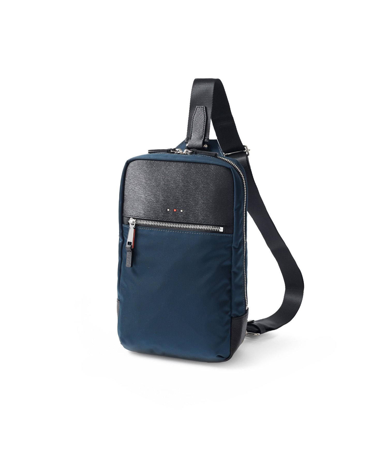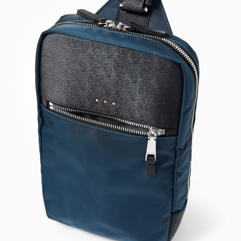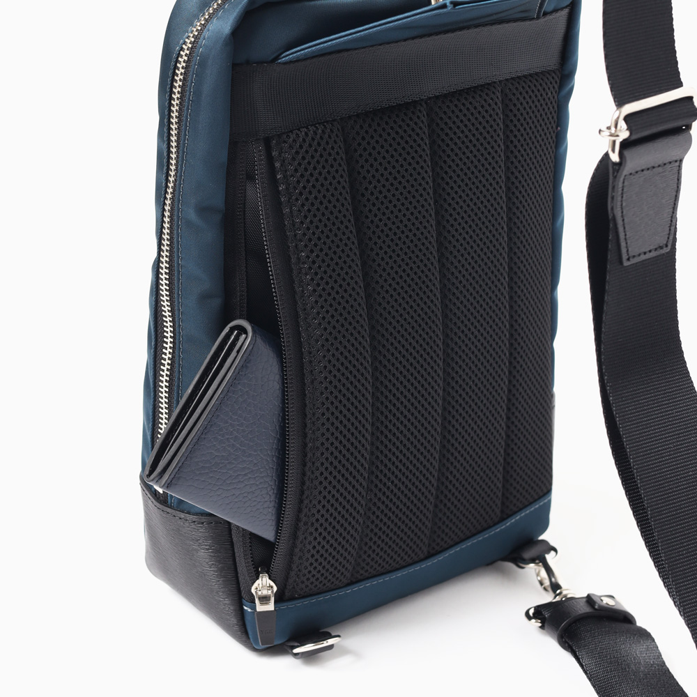 上品な光沢とソフトな風合いが特徴のナイロン素材と、凹凸のあるエンボスレザーを組み合わせたシンプルな日本製のワンショルダーバッグ。フラットな本体生地とエンボスレザーの素材コンビネーションが際立ちます。