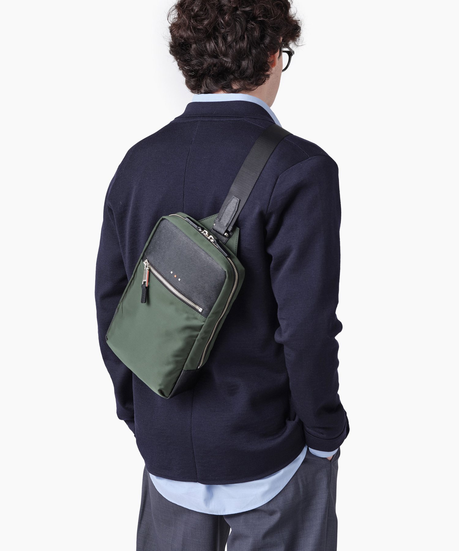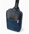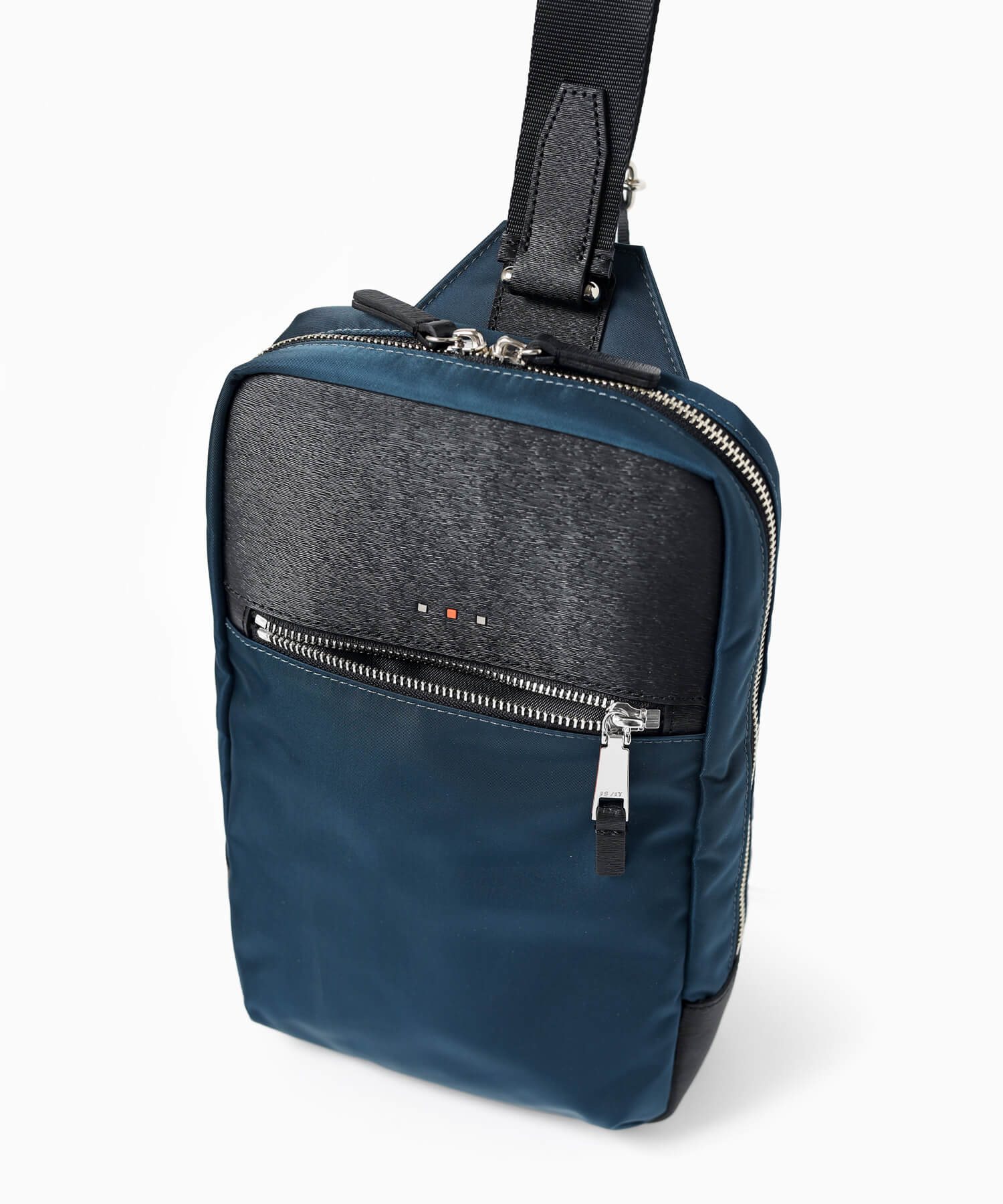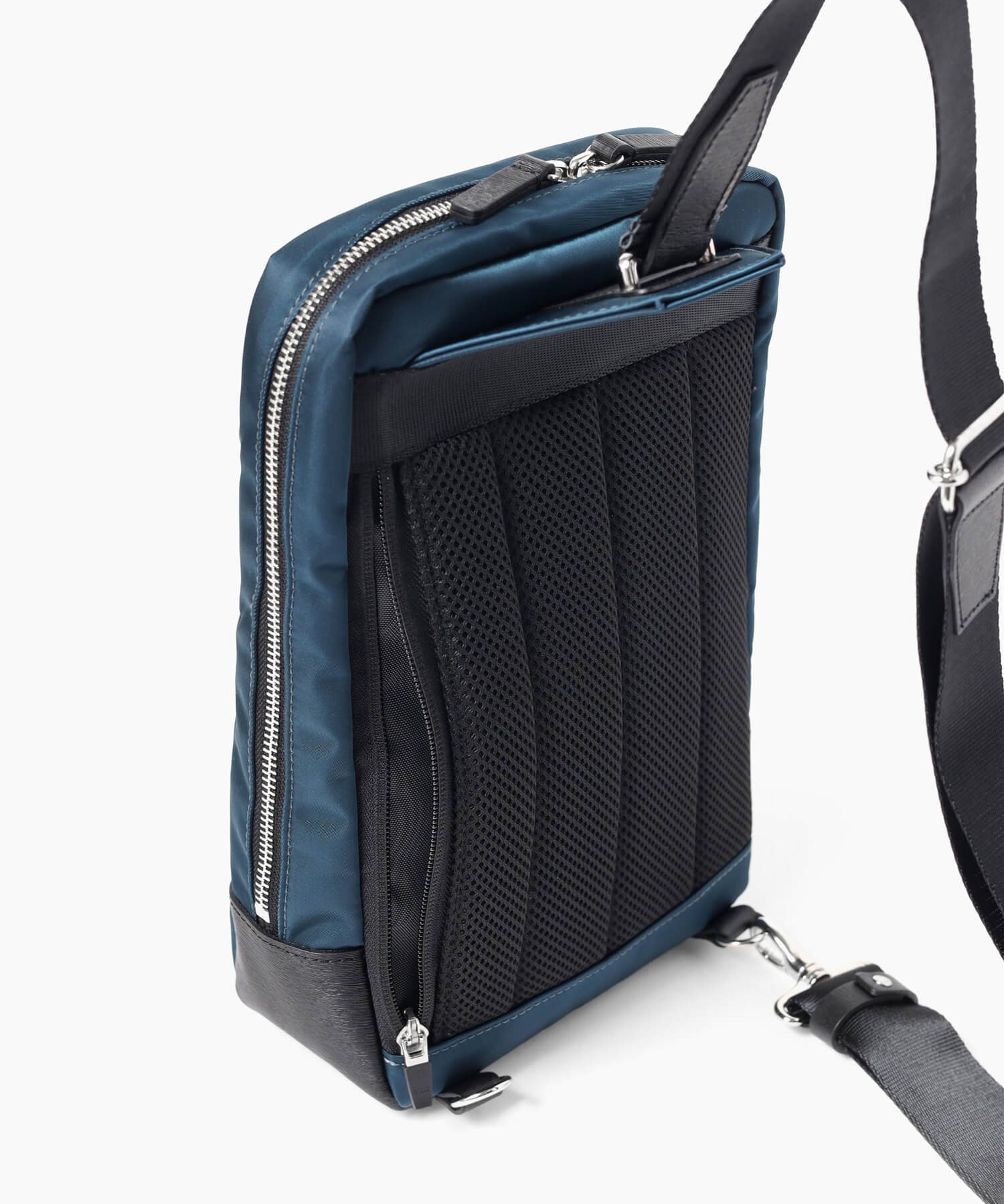 上品な光沢とソフトな風合いが特徴のナイロン素材と、凹凸のあるエンボスレザーを組み合わせたシンプルな日本製のワンショルダーバッグ。フラットな本体生地とエンボスレザーの素材コンビネーションが際立ちます。