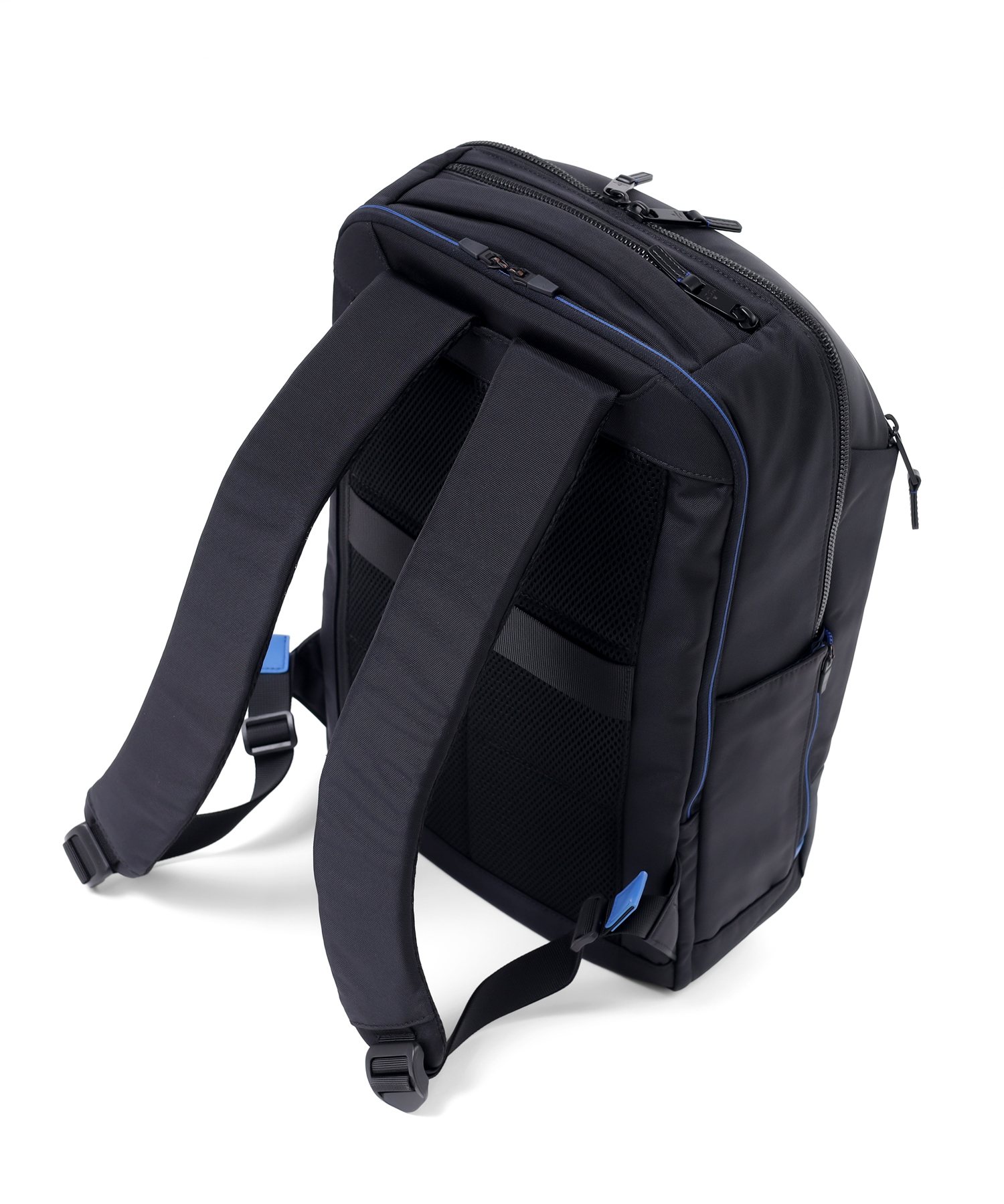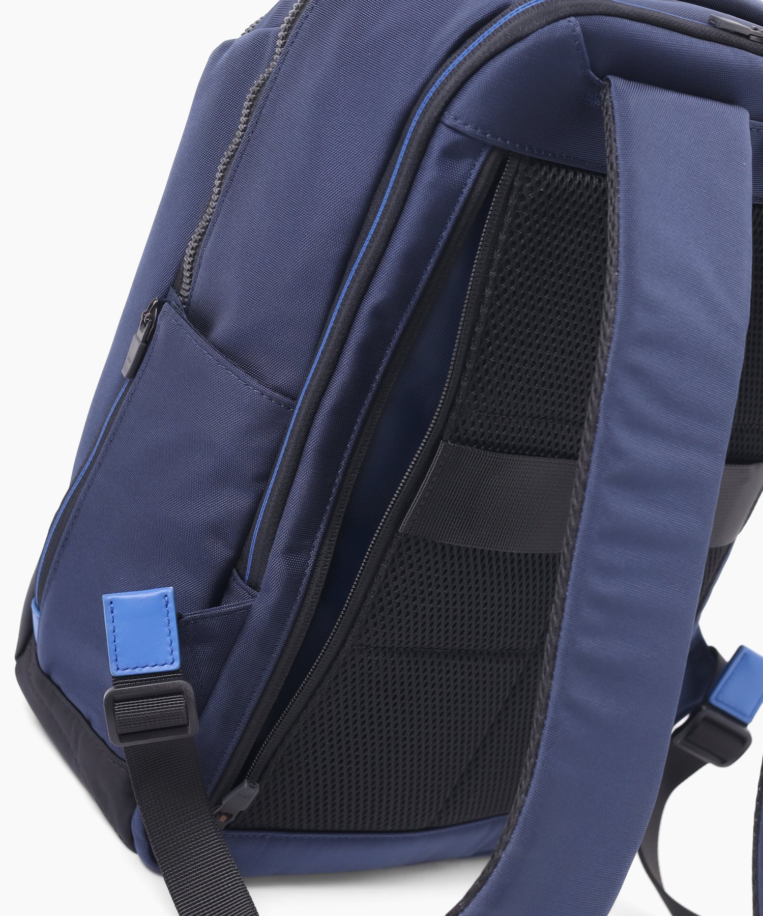 立体的なシルエットを作り出す裁断ながらもビジネスシーンでも使いやすいよう、収納ポケット類を豊富にすることで機能面にもこだわった、ランバンオンブルーのB4サイズのリュックです。背面にはセットアップベルトが備わっておりますので、キャリーケースに通すことができ、出張にも最適なリュックです。