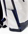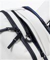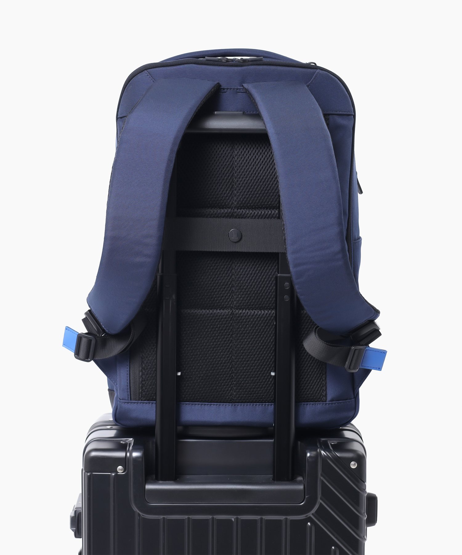 背面にはセットアップベルトが備わっておりますので、キャリーケースに通すことができ、出張にも最適なリュックです。センター部分にはブランドロゴ入りのボタンが付いていますので、キャリーケースに通さない際はボタンを留めておくことができます。
