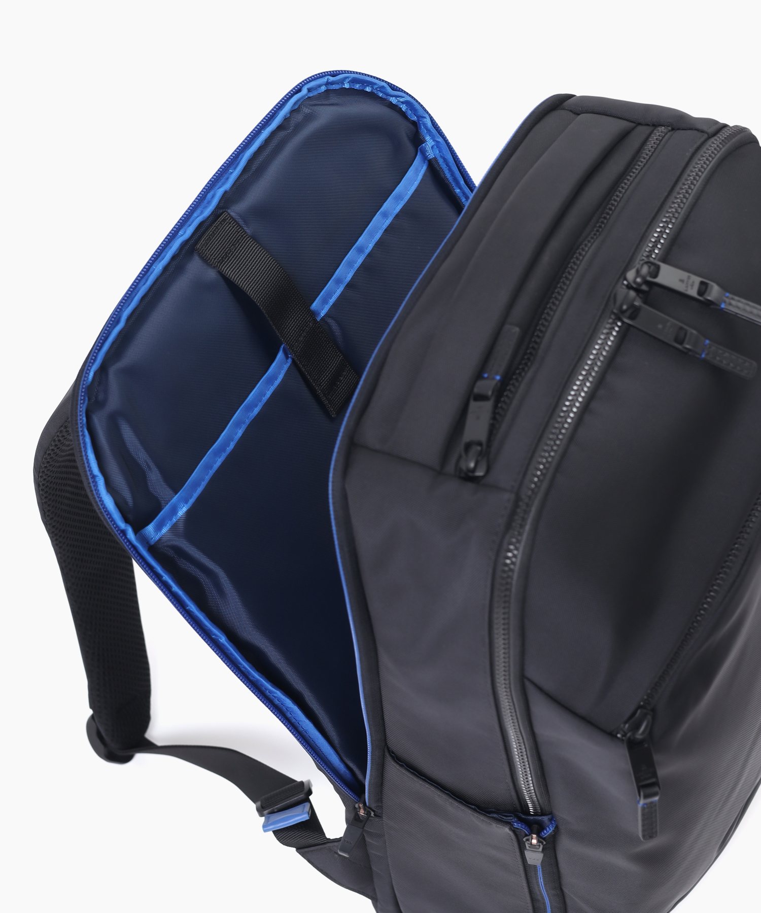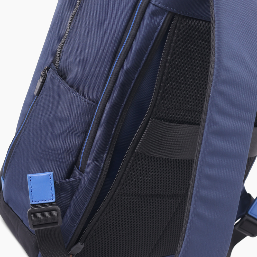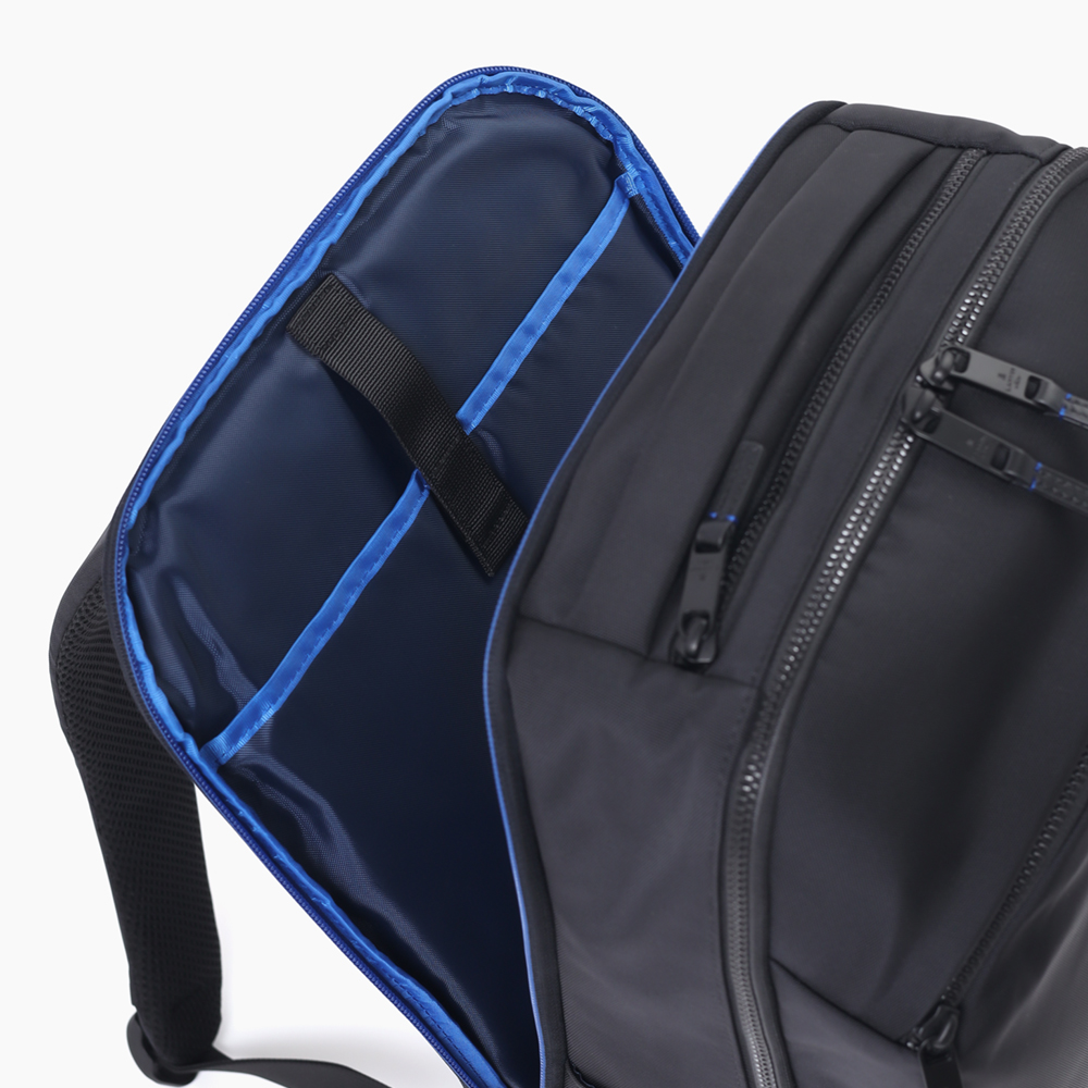 内装にはB4ファイルがすっぽり収まるサイズ感で、ボトルや手帳、長財布などビジネスシーンで持ち歩くアイテムも十分に入る、収納性のあるリュックです。後室にはPCの収納に最適なクッションポケットが備わっております。ポケットのサイズは幅28cmx高さ36cmで、15.6インチのPCを収納することができます。