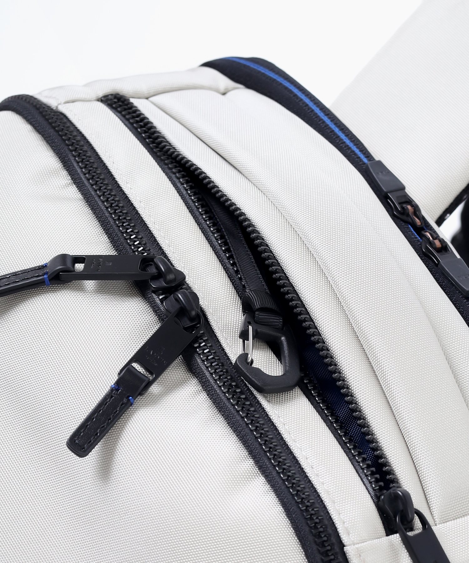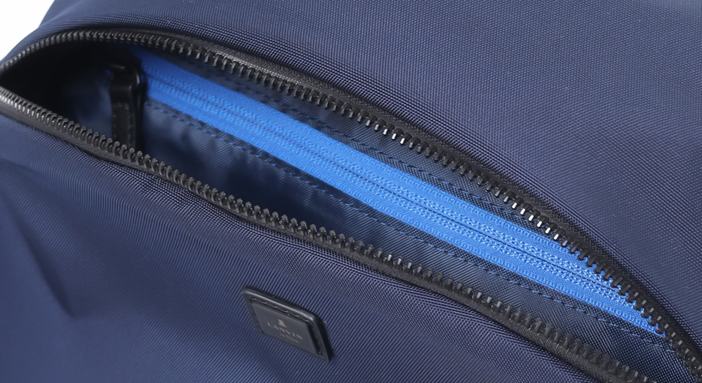 プリファファスナーを使用しています。蛍光ブルーにブラックカラーのプリントを施して、ラインを表現したランバンオンブルーらしいオリジナルファスナーです。