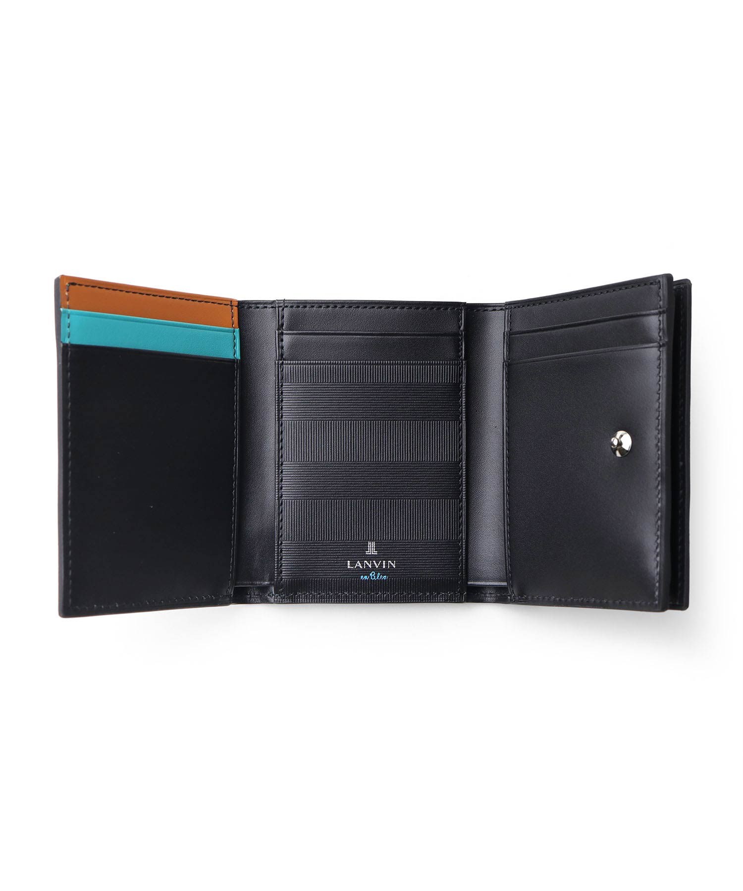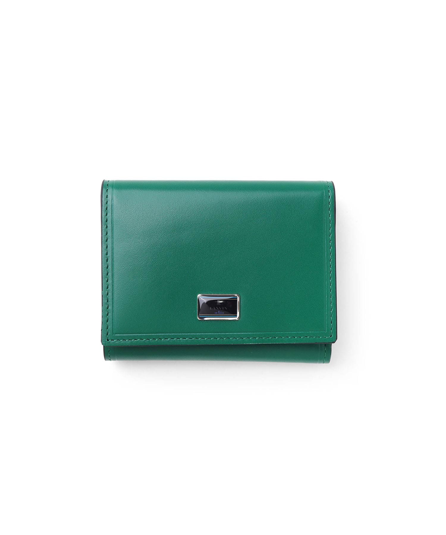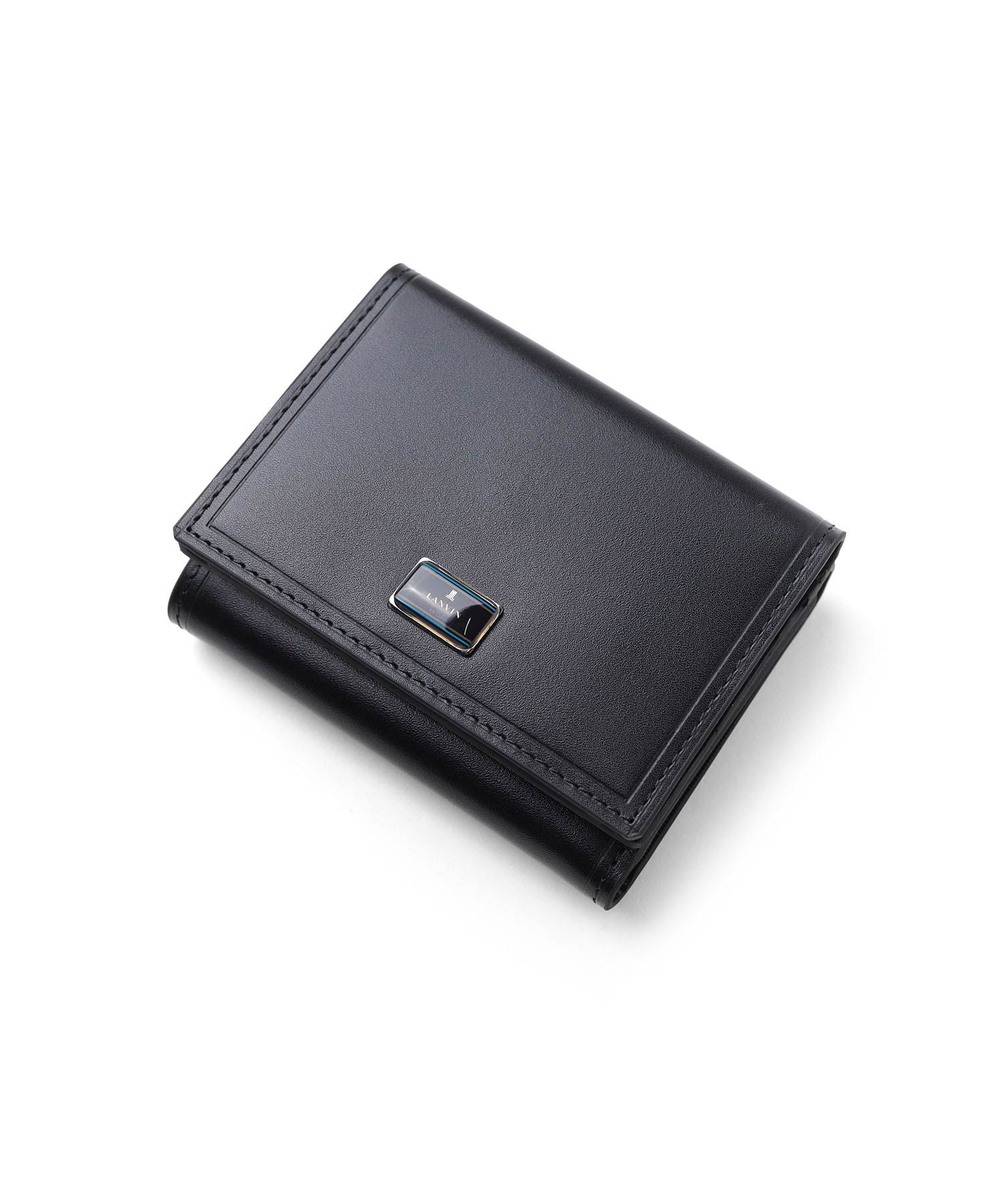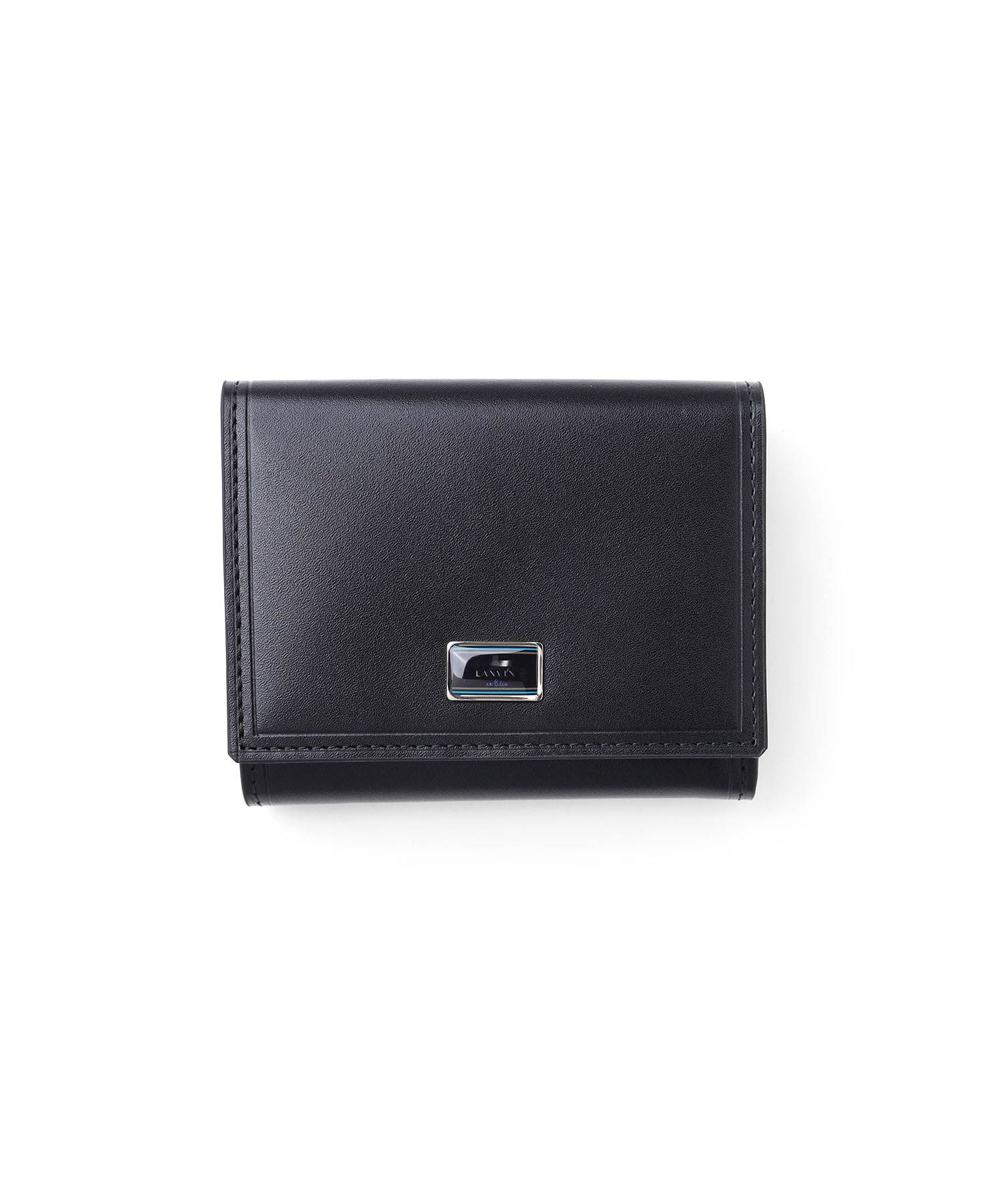 上品な光沢感のあるスムース牛革と、プリントエボブローチが印象的なLANVIN en Bleuの三つ折り財布。内側のカラーのカード段やオリジナルボーダーエンボスなど、遊び心あるデザインのコンパクト財布です。