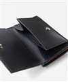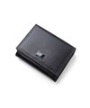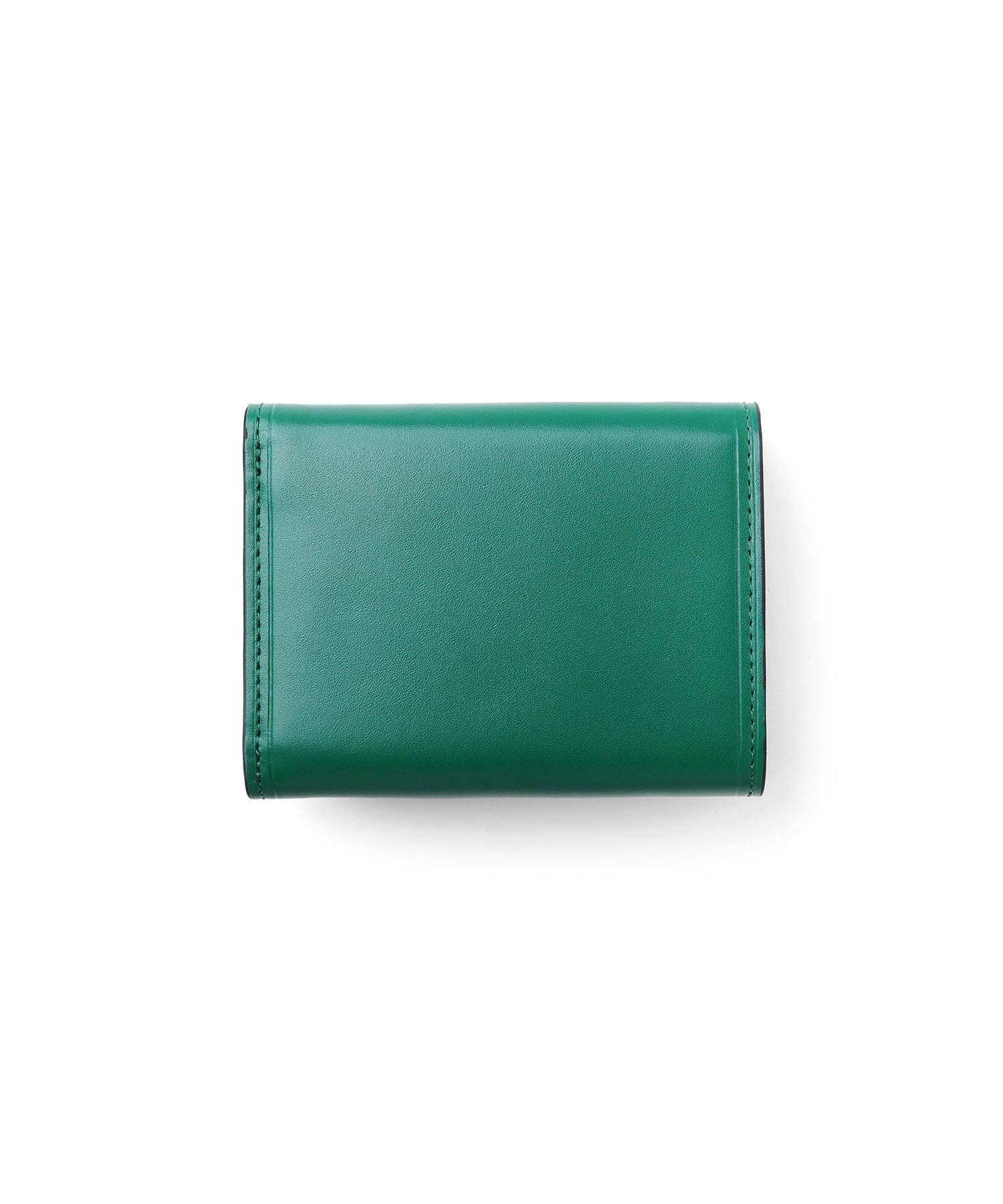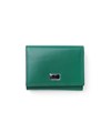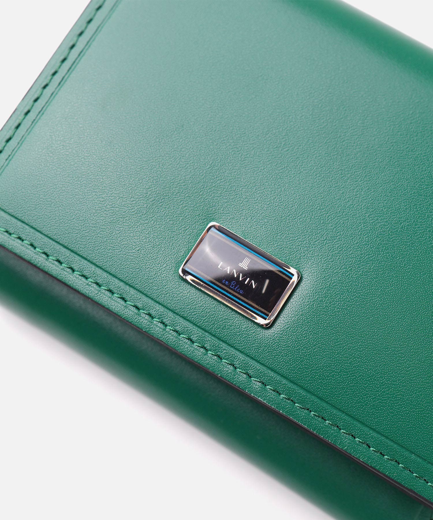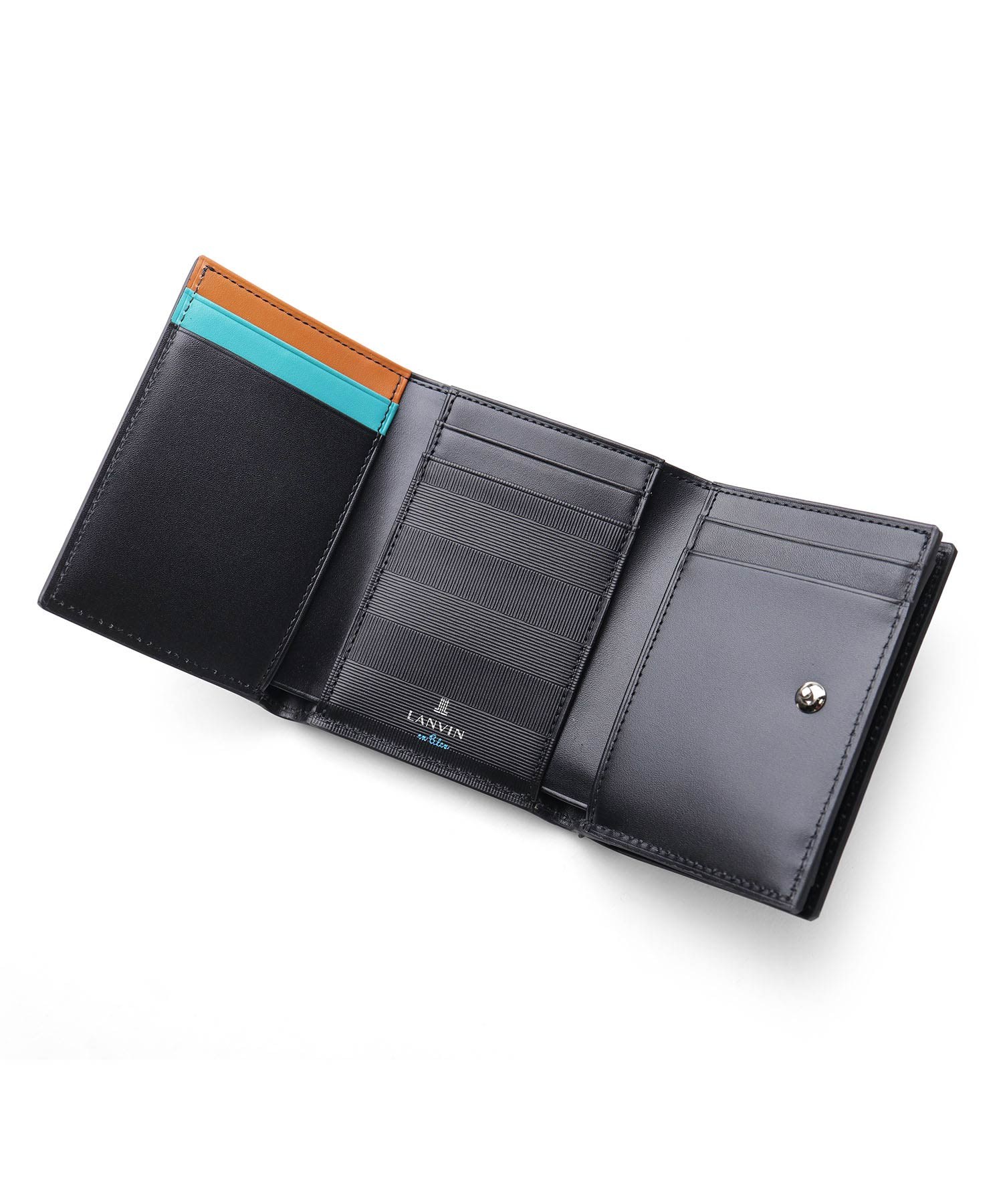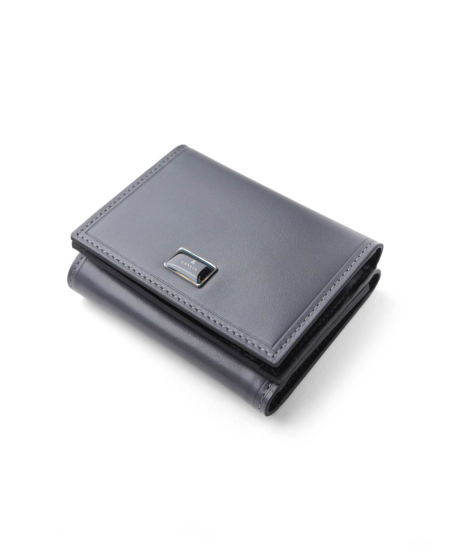 上品な光沢感のあるスムース牛革と、プリントエボブローチが印象的なLANVIN en Bleuの三つ折り財布。内側のカラーのカード段やオリジナルボーダーエンボスなど、遊び心あるデザインのコンパクト財布です。