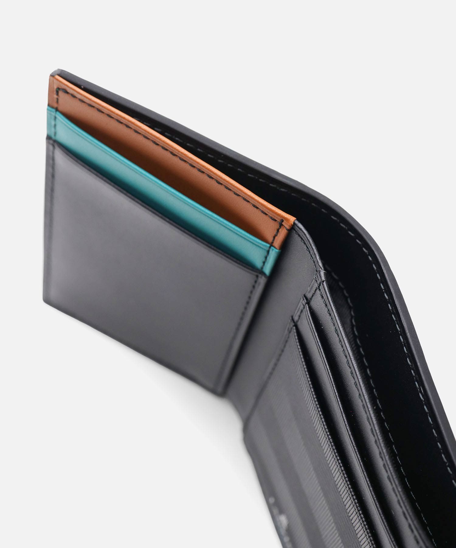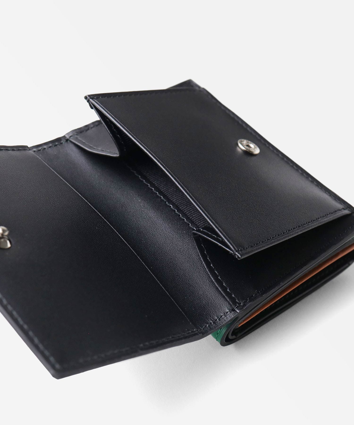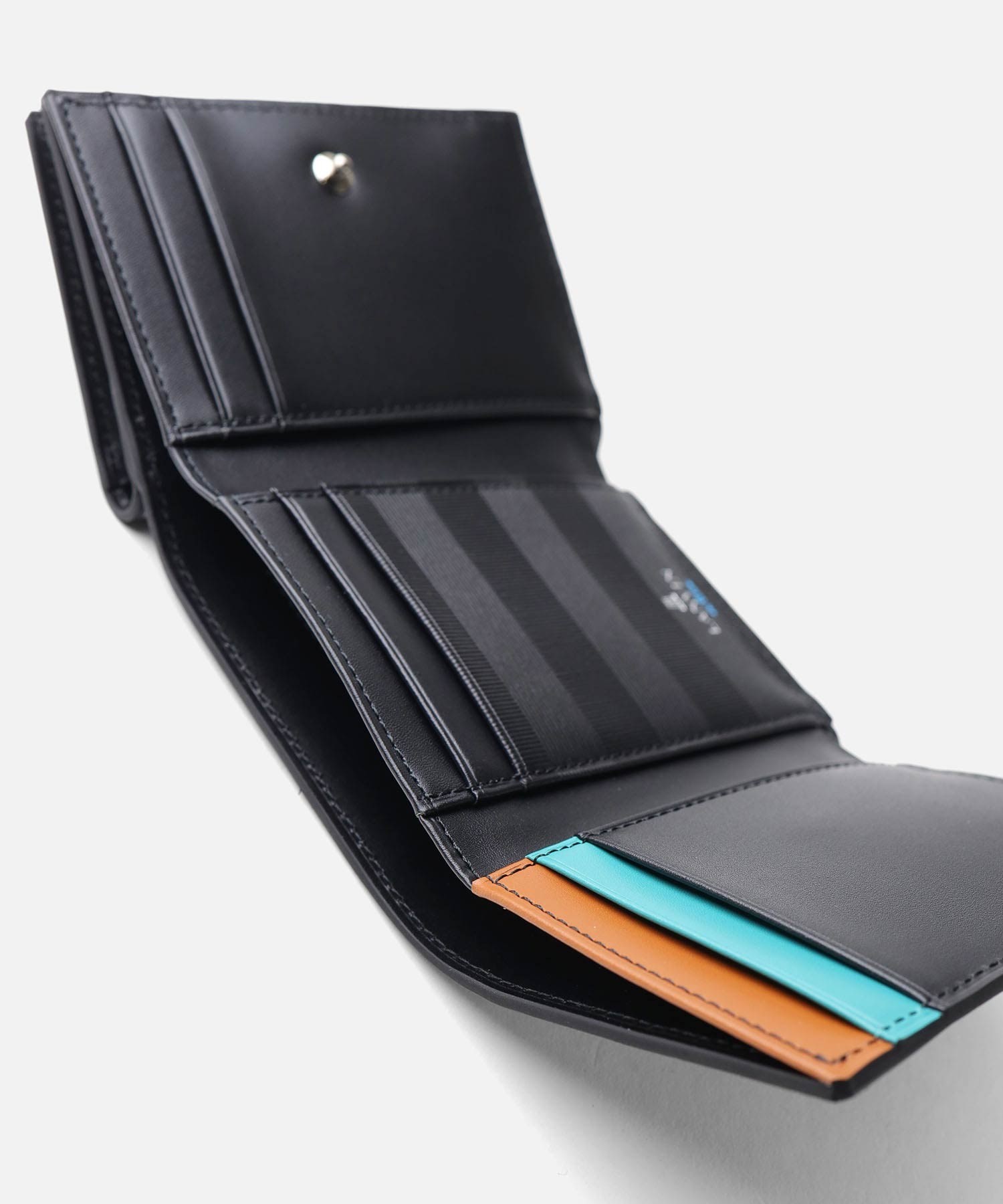 三つ折り財布を開くと、カードポケットが9つ、札入れが1つ、小銭入れが1つあります。コンパクトサイズですが、収納豊富です。