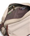 B5サイズ収納対応のメインルーム内は、500mlペットボトルも楽々入ります。内装にはメッシュポケット、ファスナーポケットが装備されています。フラップ下に前ポケットが2つあり、小物を分けて入れるのに便利で、フラップを開けてすぐに出し入れできるので重宝します。カバンの背側にもファスナーポケットがあり、収納機能が充実しています。