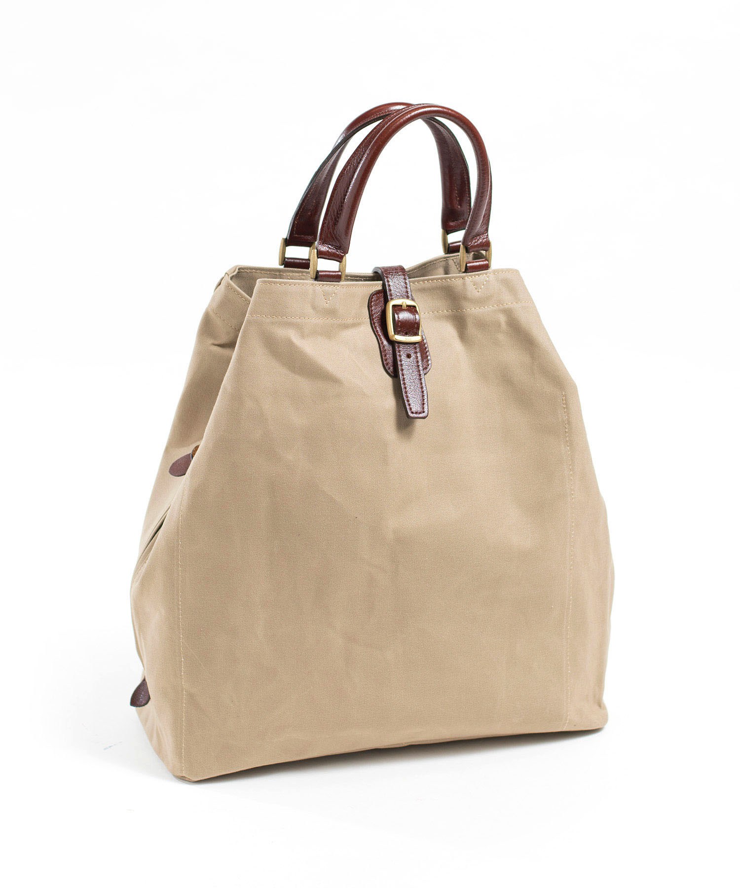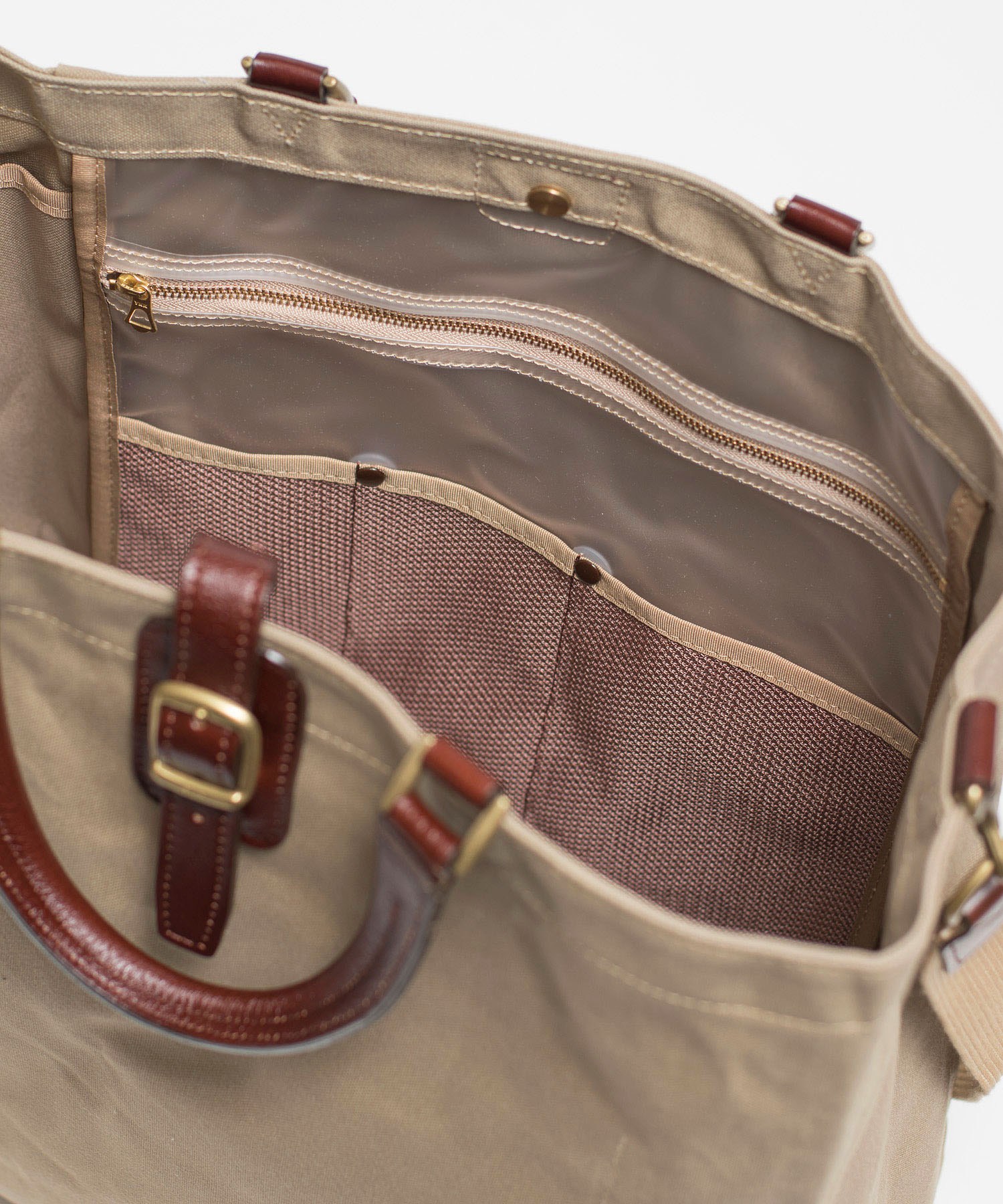 トラックの幌にも使われている帆布に強力なパラフィン加工を施し、強力な撥水性を持ちながら通気性も確保しています。この帆布は、使い込んで汚れたり風雨にさらされるごとに糸目が詰まり帆布が変化していきます。汚れたらシャンプーで洗うこともできますが、汚れもまた帆布の撥水性をより強くする要素の一つでもあります。天然素材の風合いを愉しみつつ、擦り切れるまでご愛用いただけたらと思います。