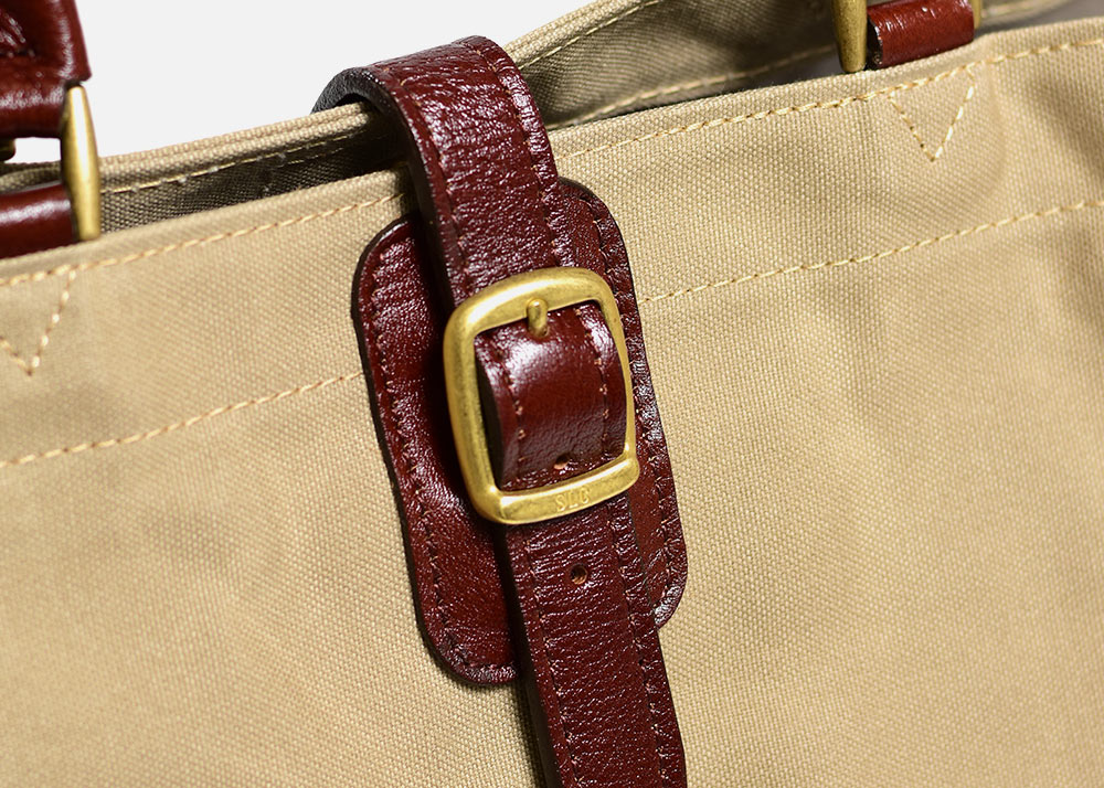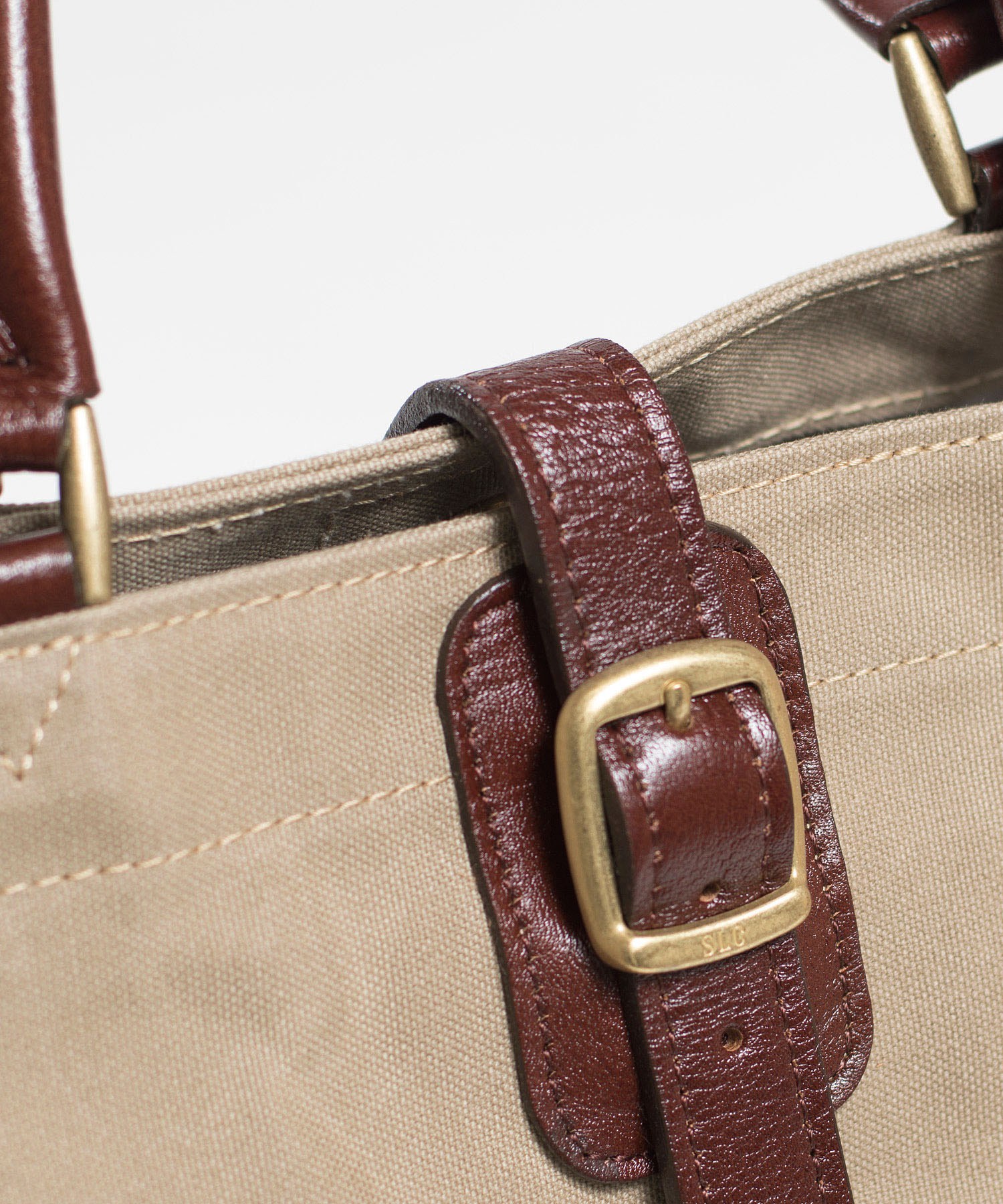 美錠にはオリジナルのアンティーク調の金具を使用しており、SLCのロゴがさりげなく刻印されています。金具の色、革の色、帆布の色と、全体の色のバランスをじっくり吟味して作られたものとなっています。